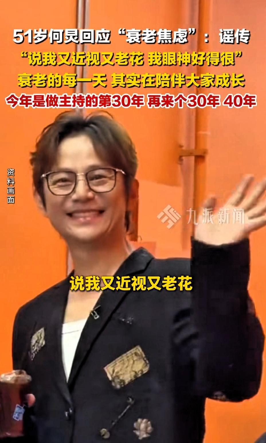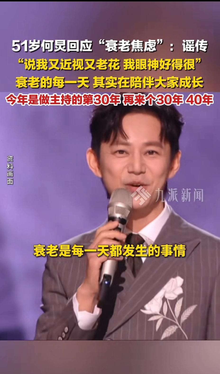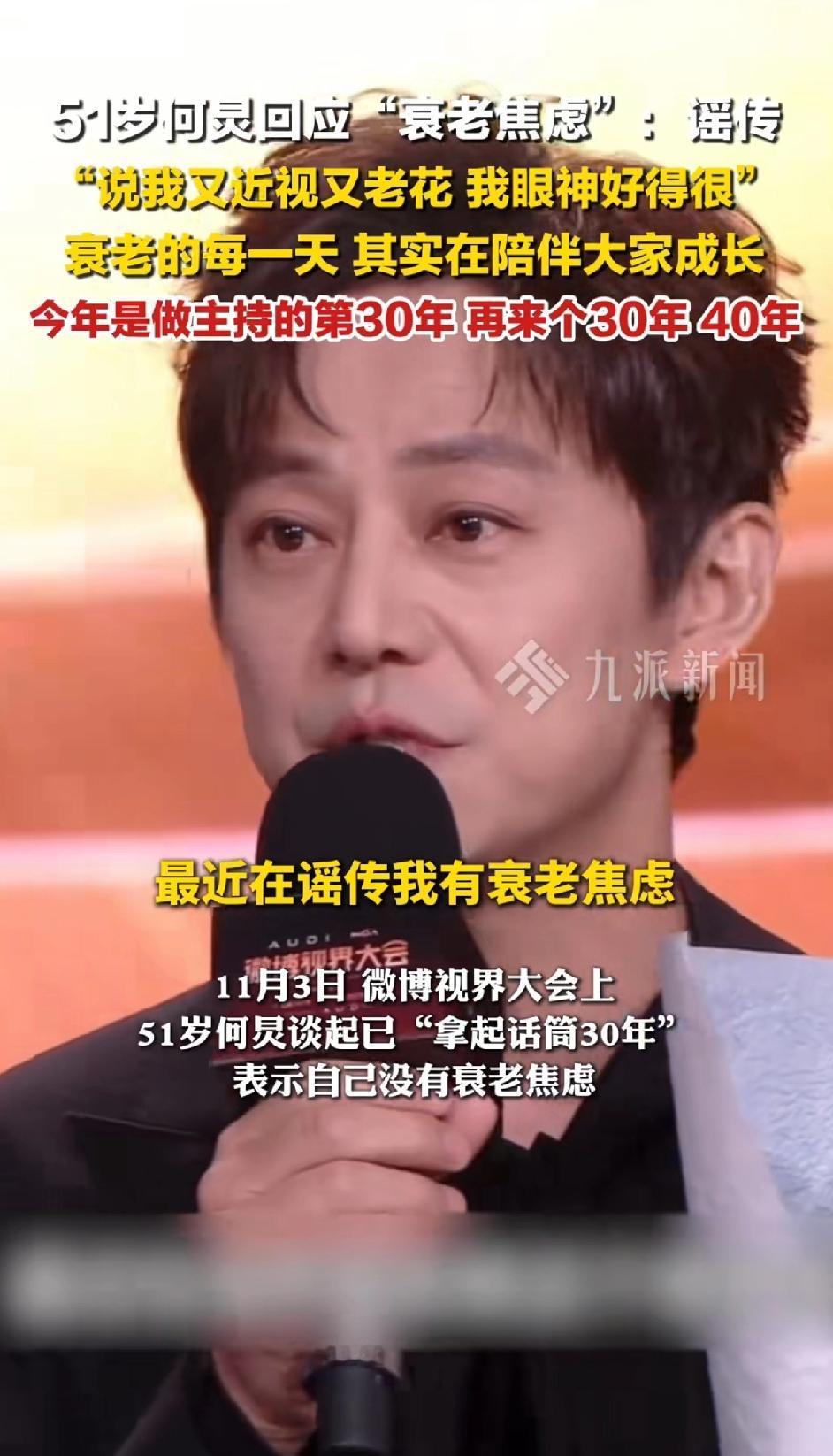 51岁何炅回应“衰老焦虑” 谣传:“说我近视又老花 我眼神好得很”! 衰老的每一天都是在陪大家成长! 在微博视界大会上,他说最近老有人传他又近视又老花,有衰老焦虑,他直接霸气回应,自己眼神好得很,从来没焦虑过。 他还自信表示自己是被爱包围的快乐之人,准备再当三四十年主持人。 岁月无声何老师的颜值确实被岁月偏爱!再当三四十年主持人,相信大家会一如既往的支持他喜欢他。 想想之前,他还因为“八块腹肌”上过热搜。 综艺节目里露出的隐约腹肌线条,还有合影中明显的手臂肌肉,都让人惊叹。 他曾说快乐和运动就是保养秘诀,看来他真是这么做的,心态和身材都在线,这状态,再主持三四十年还真不是说说而已!
