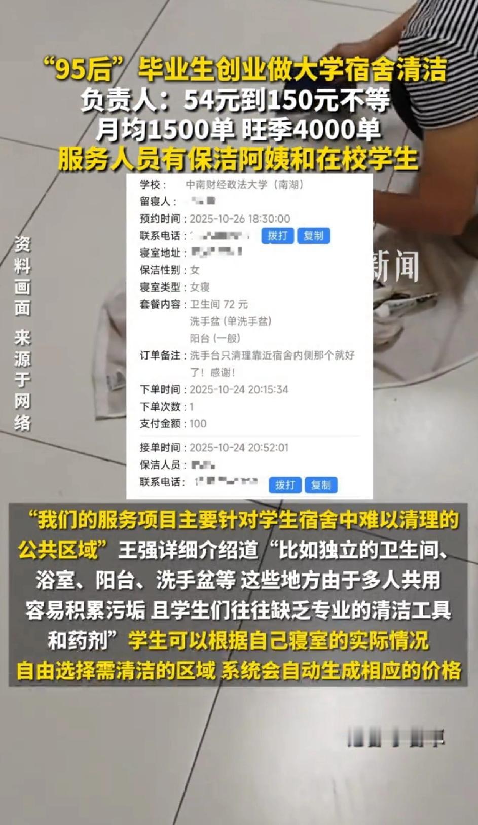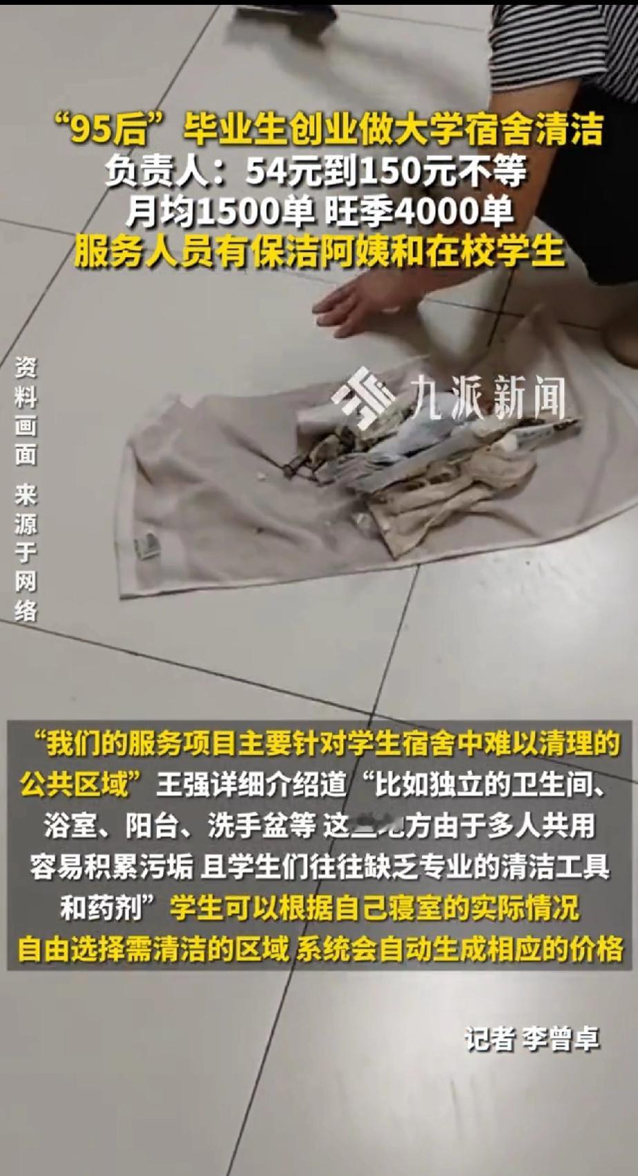 “95后” 毕业生创业做大学宿舍清洁 负责人:54元到150元不等,月均1500单 旺季4000单。 服务人员有保洁阿姨和在校生,这种创业方式既能为在校生提供收入,还能在花费较少的情况下保持宿舍卫生。 一个宿舍打扫下来需要的费用再平摊到每个学生身上,这样下来宿舍环境好了,每个人分摊的钱也不多。 还能提供就业岗位,一举多得。 “清菌厕”平台负责人王强,2019年从湖北工业大学毕业,基于自身经历发现了这个市场需求。 清洁费用54元到150元不等 现在大学宿舍有独立卫浴,但学生学习忙,寒暑假后还易生霉菌,清洁成难题。 平台清洁人员是本校保洁阿姨,能直接进宿舍。业务从武汉多所高校拓展到全国,武汉就覆盖60多所。 有学生用过两三次,觉得打扫干净,费用室友分摊,还会继续用。 这创业项目既解决学生困扰,又有商机,牛啊!