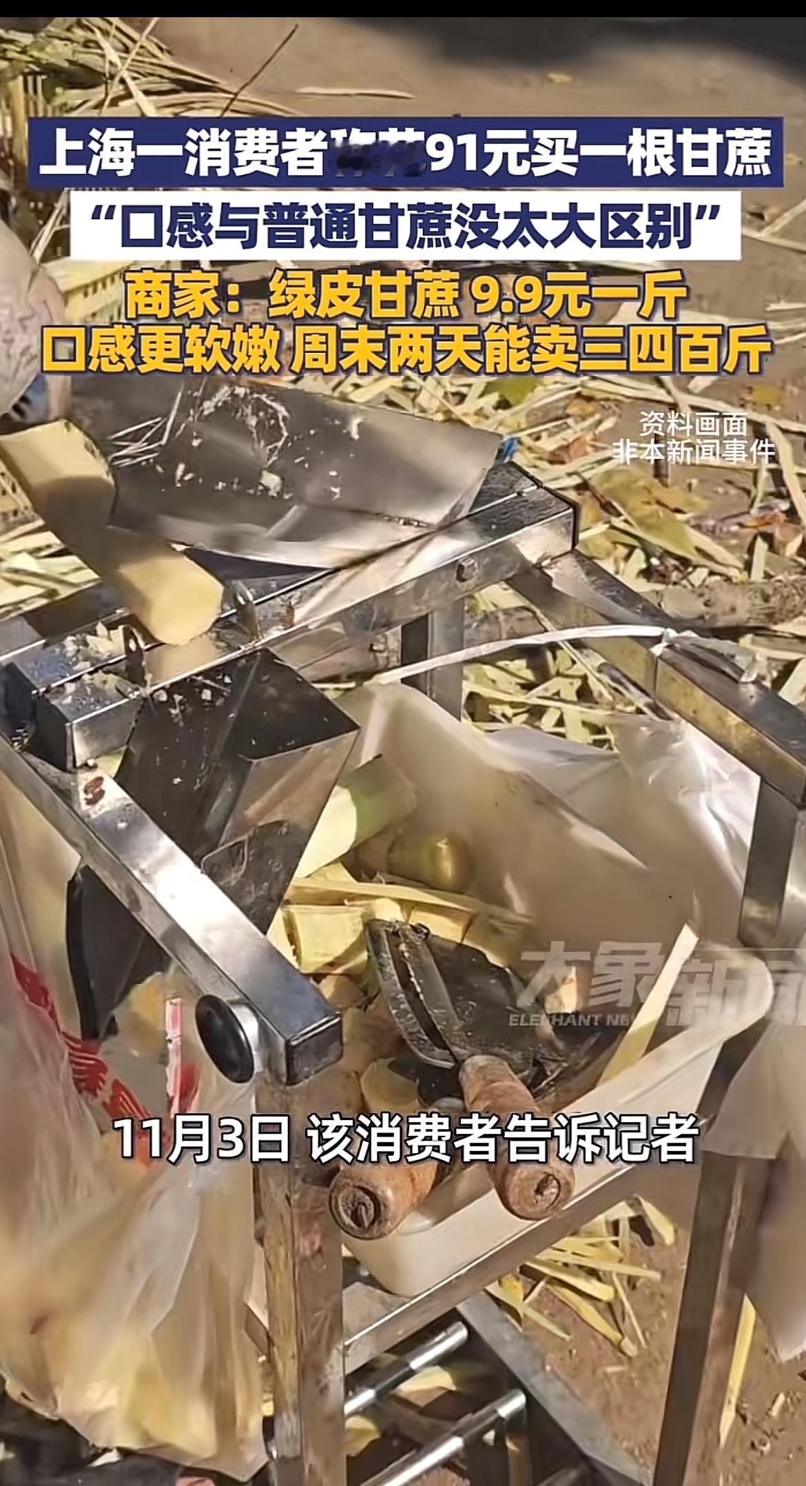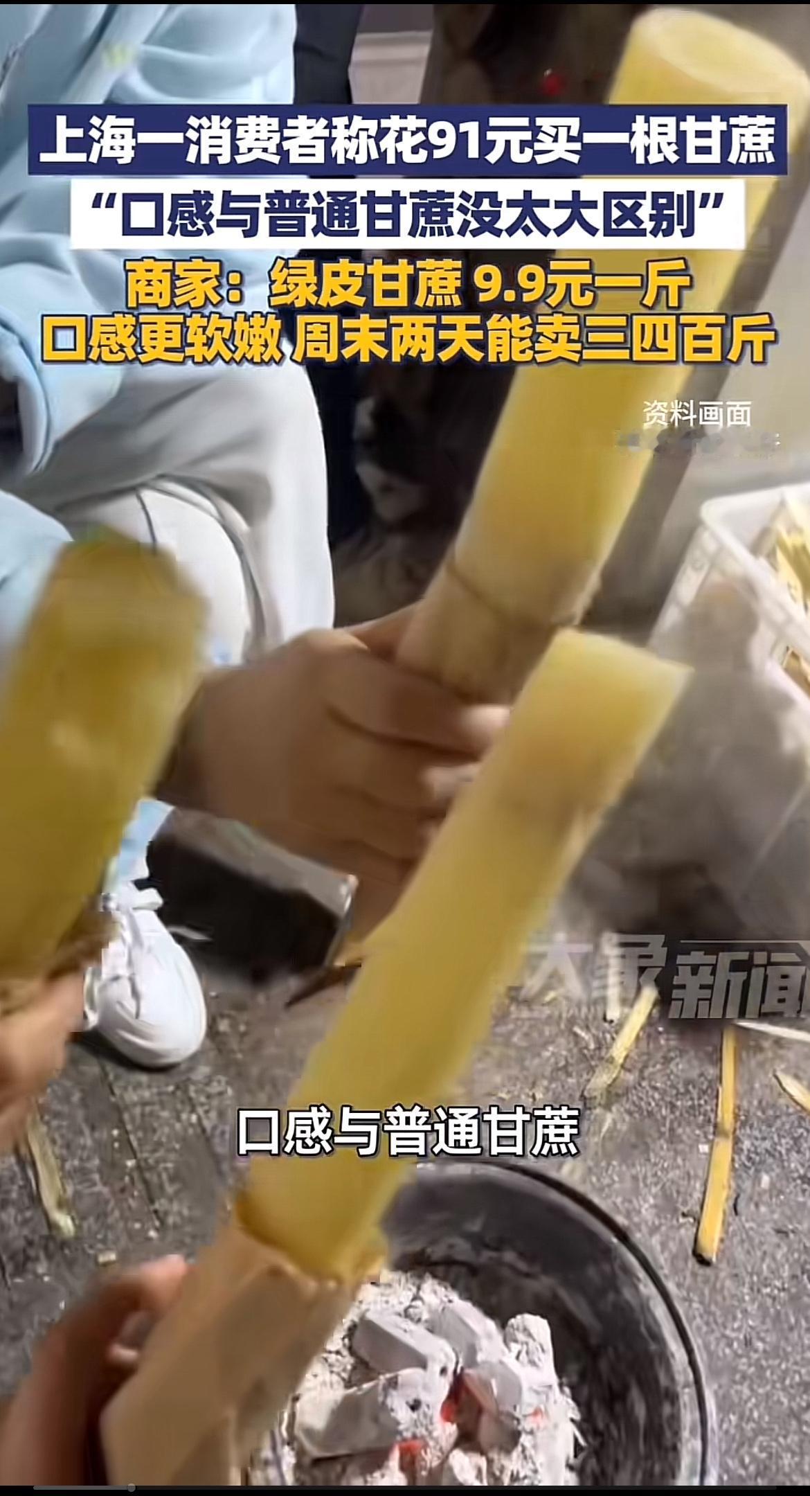 上海这根91元的甘蔗可真是惊到我了!一消费者花91.35元买了一根,他说家里人多常买整根甘蔗,最多也就花30元,这次真是破天荒。而且他觉得这甘蔗口感跟普通甘蔗没啥区别。 商家解释这是西双版纳的绿皮甘蔗,比紫皮的软嫩,所以卖9.9元一斤,这根9斤左右。还说周末能卖三四百斤。不知道是真有那么多人愿意花高价尝鲜,还是大家没意识到这价格离谱。反正要我花近百元买根甘蔗,心里肯定得掂量掂量。