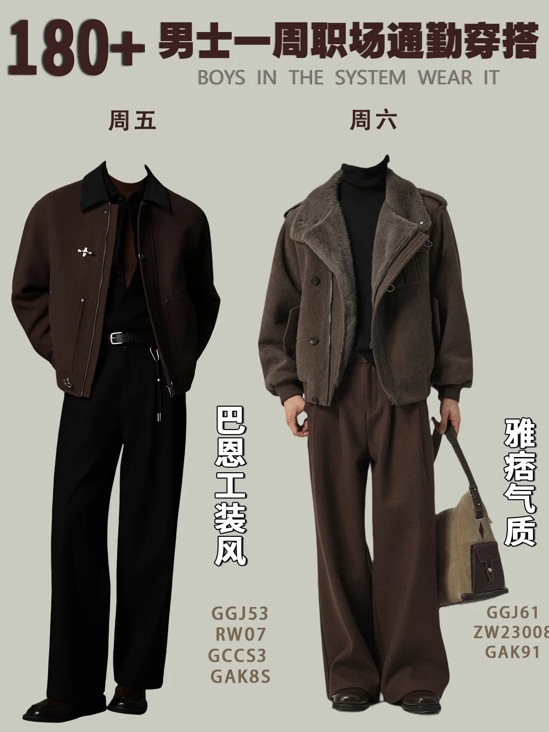 周末前可以稍作放松。硬朗的工装夹克与休闲单品混搭,风格感强且舒适,适合周五或需要外出活动的日子。