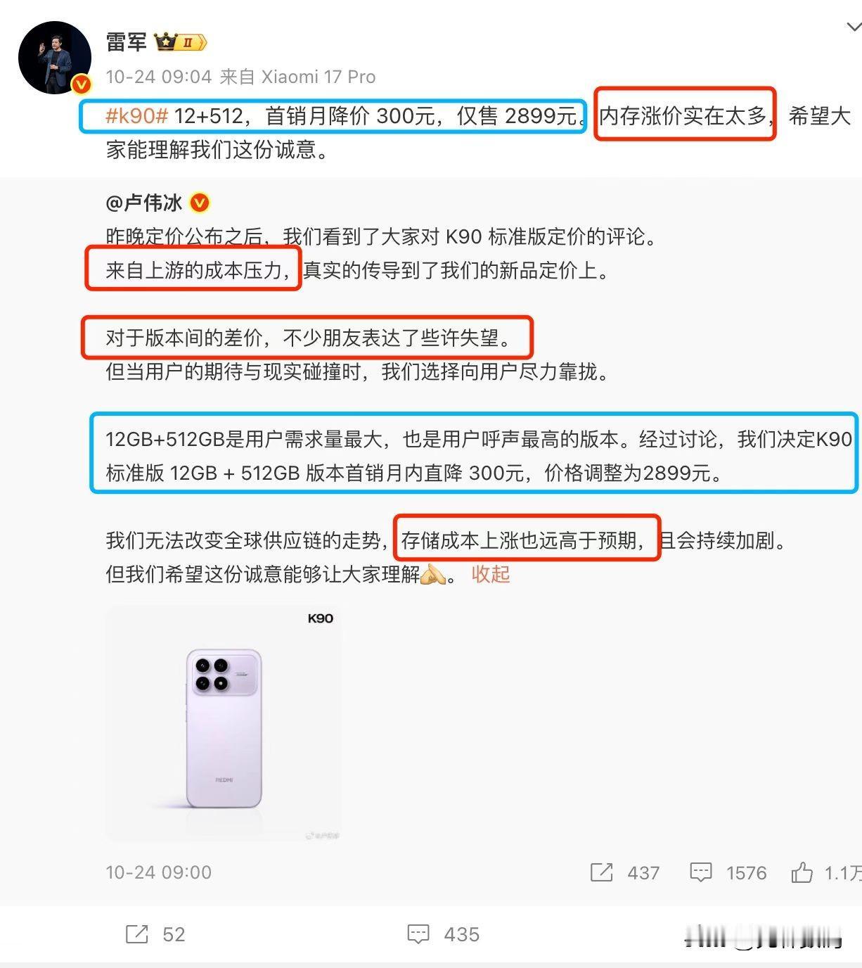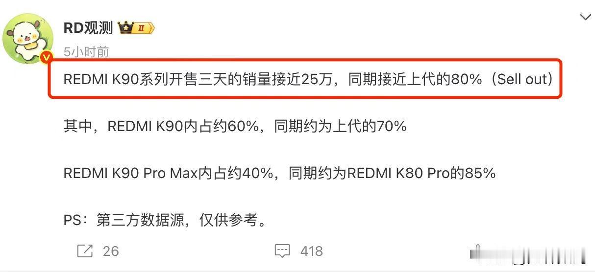 前两天摸了一下REDMI K90 ProMax和K90,我终于明白为啥销量下滑了。。。 说实话,我对K90ProMax这款手机还是挺期待的,毕竟这次冲高端到3999起,但是我上手后,有惊喜,但更多是失望。 上手第一瞬间,有种小米17ProMax的恍惚感,这个尺寸、厚度和重量都非常的接近,再看看背部设计,一个是副屏一个是低音炮扬声器,镜头模组也是一脉相承。并且屏幕观感不错,机身整体做工也很不错,拿在手里还是挺有质感挺精致的。一时间,真有种小米17ProMax的平替感。 但是一看价格3999起,这一切好像又显得理所当然,毕竟4000块的手机,如果连这种基本的用料和细节都没有,那才是真的说不过去。特别是丹宁色,机身背部有种牛仔裤的那种帆布感,拿在手里挺粗糙的还挺舒适。 多一句嘴:这个颜色会不会不耐脏,起皮掉色等,这个不了解材质特性不予评价,但真要买这个颜色的话就要有这种心理准备,最好多去了解了解(反正之前的皮质后盖手机不带保护套的有很多都掉皮了)。 接下来我就试听了一下这手机的BOSE调解2.1声道扬声器(这也是一进去拿到这款手机店员就在讲解的点),于是我把声音开到最大,但说实话,我听着感觉很一般。并没有比我双扬声器的iPhone14ProMax强,我手里还没有新一点的16ProMax或者17ProMax做对比,后面有机会我拿我朋友的新机再对比一下。 但是我重点听了一下镜头背面的独立低音炮,说实话,真的感知不强(在我的理解中,这应该可以媲美小米之前出的那款几十元的蓝牙小音响),所以,要是冲着这手机的2.1声道+独立低音单元+BOSE调解的的音质和音量去的用户,我建议你真的去线下体验后再决定,看看能不能满足你的耳朵。 再就是K90,虽然宣传的用了iPhone17同款一体冷雕工艺,但是上手后还是不能跟iPhone17媲美,细节还是有区别(反倒是小米17Pro,我感觉它的整体手感可以跟iPhone17媲美)。 所以K90ProMax最大的卖点(音质)在我这里是真的一点没体现出来,再加上这手机价格上涨厉害,前期销量并不如K80Pro。至于K90,感觉诚意还是有点不足,并且还涨价了(然后官方赶紧说是内存上涨的原因,把12+512G版本降了300),看来诚意还不是很足。