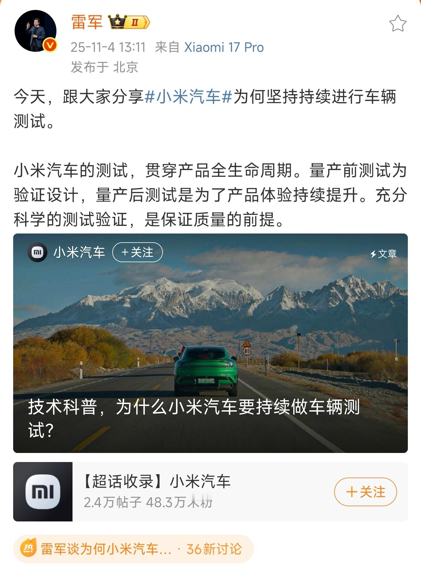 雷军谈为何小米汽车持续进行车辆测试“充分科学的测试验证,是保证质量的前提。”国