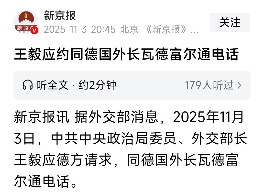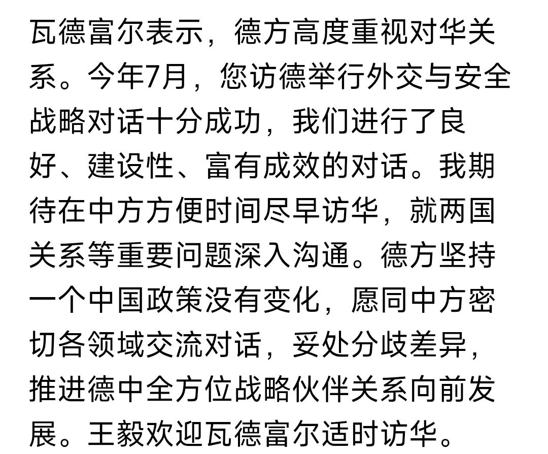 因访华前对媒体发表超出其本分的对华言论,导致其因“没人愿意见他”而取消,但事后又反悔称“我的访华之旅只能推迟不能取消”的德国外长瓦德福尔,用外交部发布的消息说,在“应德方请求”下,11月3日,王毅和他通了电话。 没客气,王毅对他进行了有资格的教训,给他上了一堂中国和德国之间是怎么回事的课,并告诫他“不要搞麦克风外交”,至于瓦德福尔能不能实现“只能推迟不能取消”的访华之旅,王毅的回应是“欢迎瓦德福尔适时访华”。“适时”的意思就是看情况吧,能不能实现他的访华之旅,再说吧。 对像瓦德福尔这样的西方人就应该这样,不管其事后怎么说说什么,但在访华前都给我规矩点!