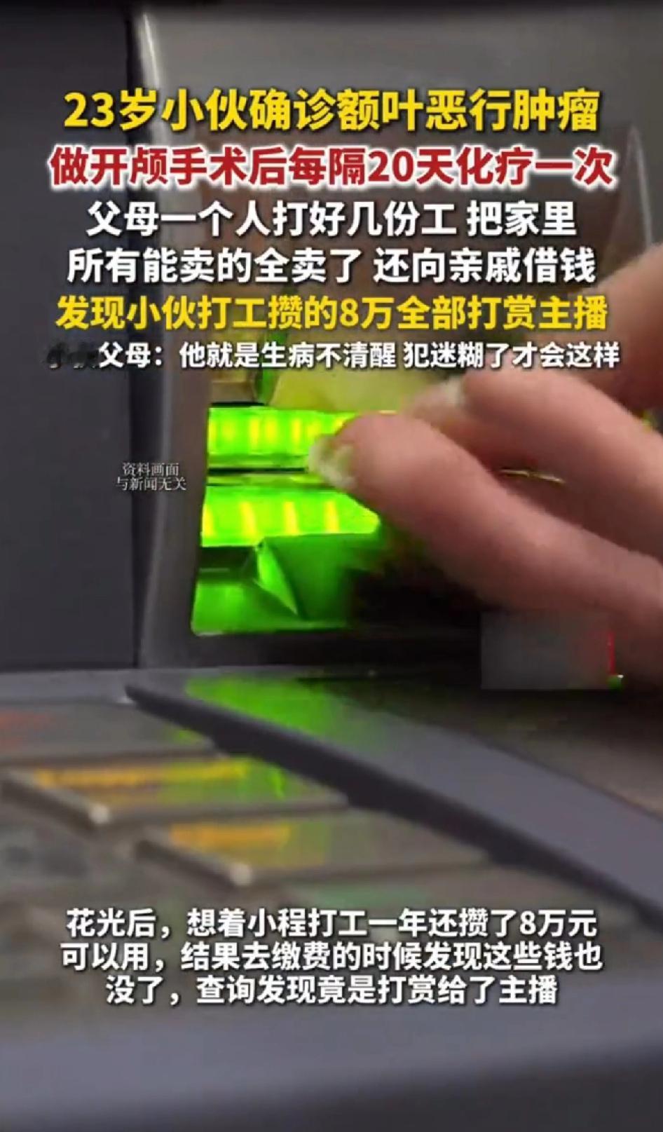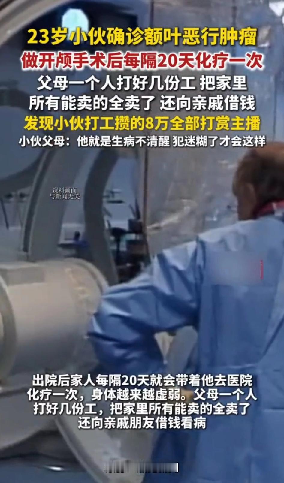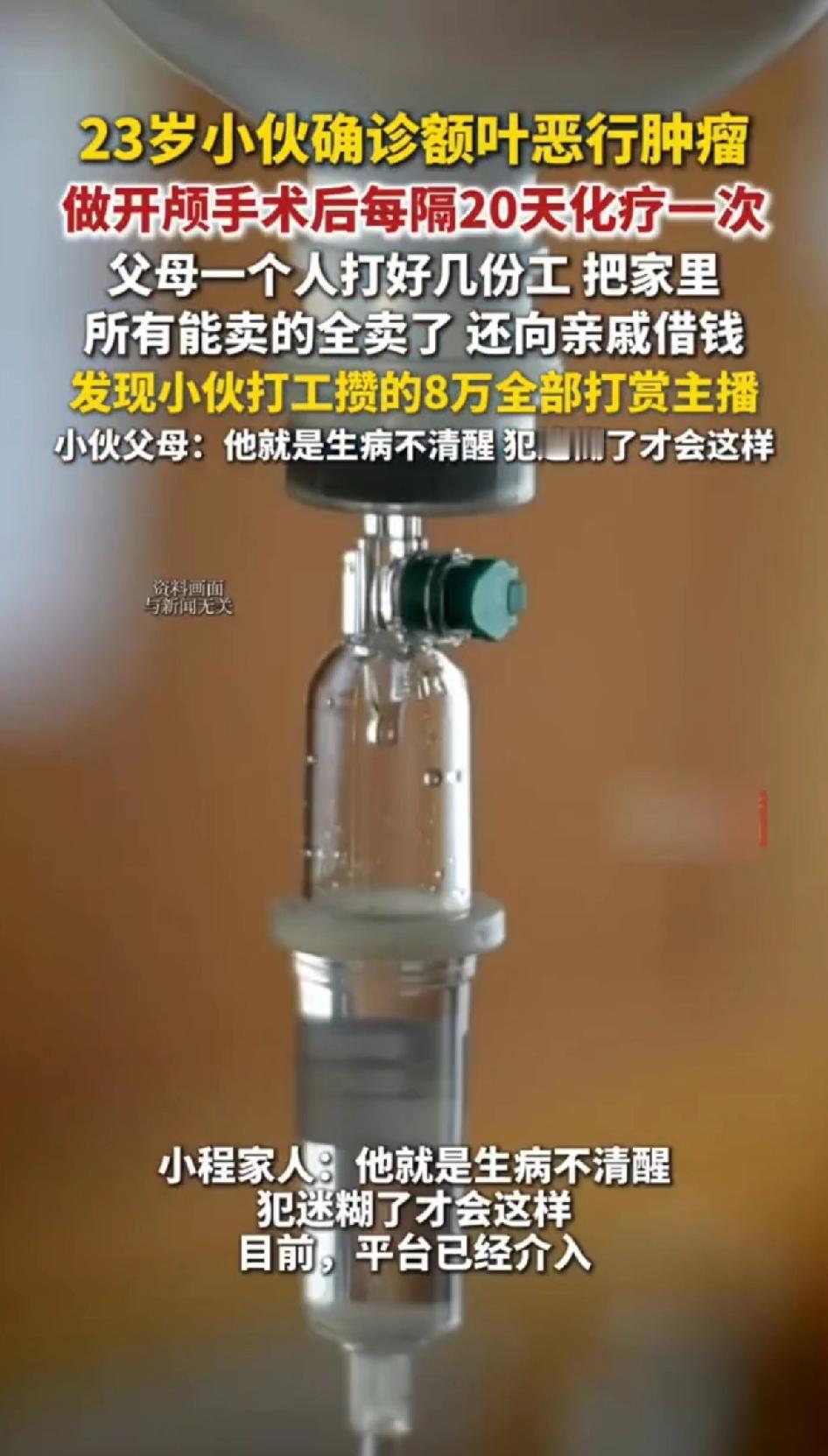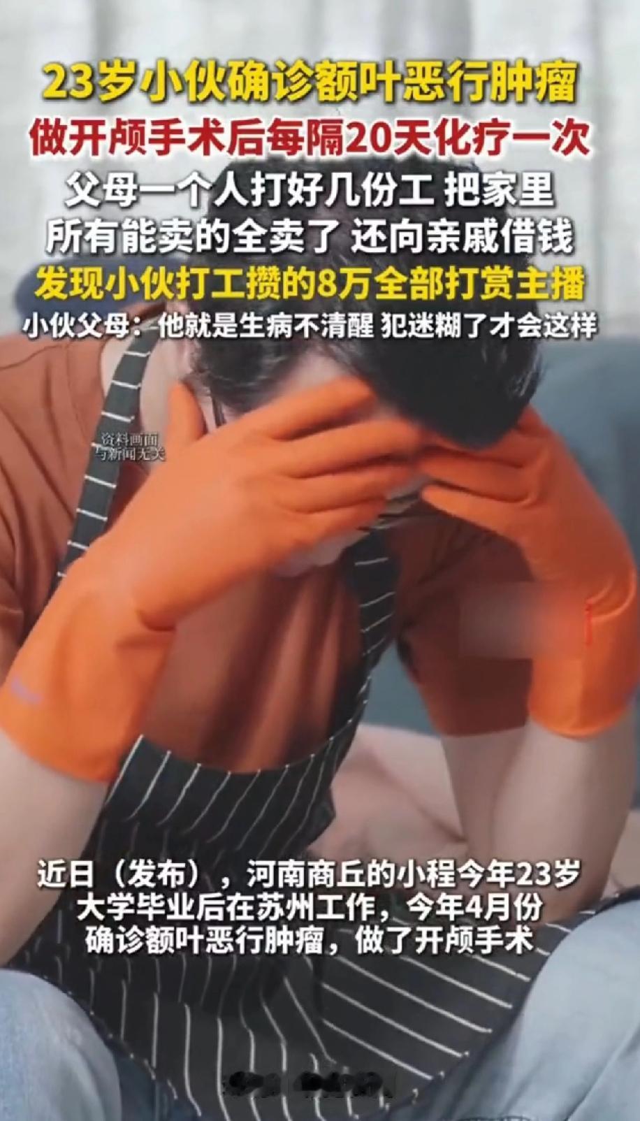 23岁小伙确诊额叶恶性肿瘤,做完开颅手术没搁20天就要化疗一次又如恶魔般接踵而至。 父母打好几份工 给他看病,把家里能买的全卖了,还向亲戚借钱。 最后发现小伙把打工攒的8万块钱全部打赏给主播了! 他父母说他生病不清楚,犯迷糊才会那样做! 河南商丘的小程今年23岁毕业后在苏州工作,今年4月份确诊恶性肿瘤做的开颅手术,父母为了给他看病把能借的全都借了。 最后钱花光了,父母想着小程打了一年工存了8万块钱可以用,去缴费时发现这些钱没了! 最后查询才发现竟是打赏给了主播! 救命钱全打赏主播的事儿,他父母说他是迷了心窍,意识不清才做的这种事! 这样的孩子真是父母的冤家,过来讨债的!好不容易养大了,大学刚毕业就得了重病,把唯一得救命钱财打赏给了主播。 还好平台已介入!希望事情能圆满解决。
