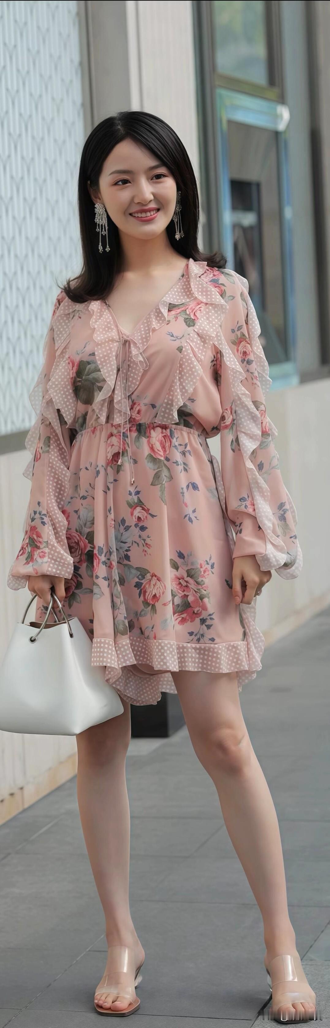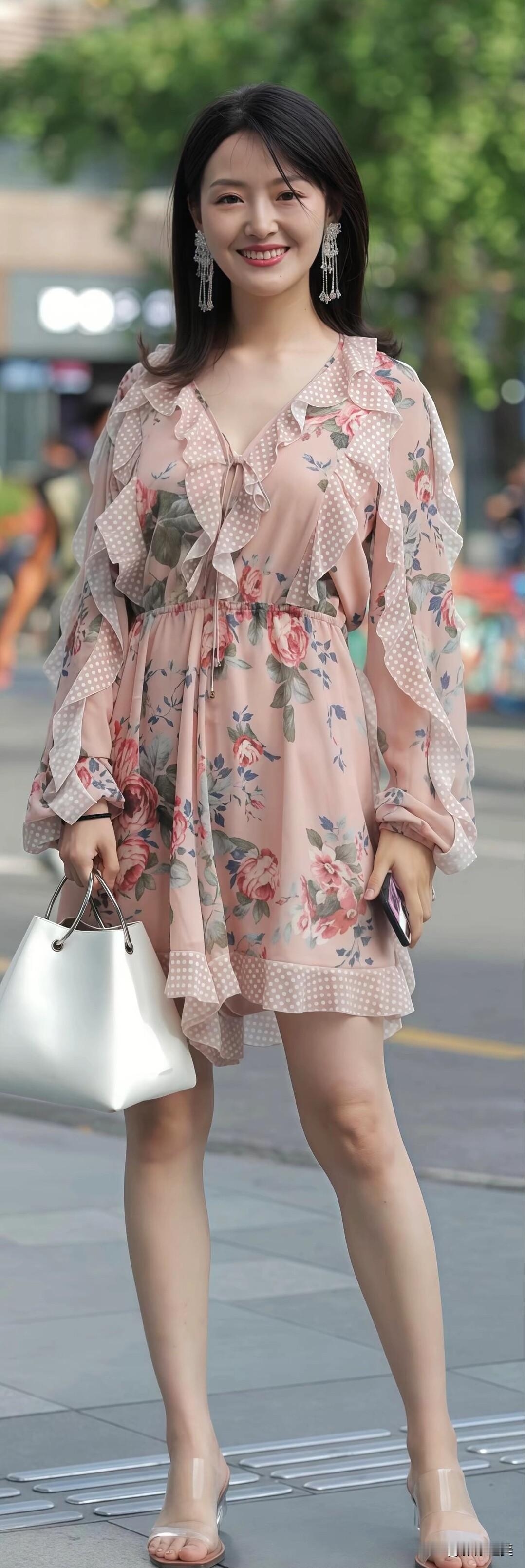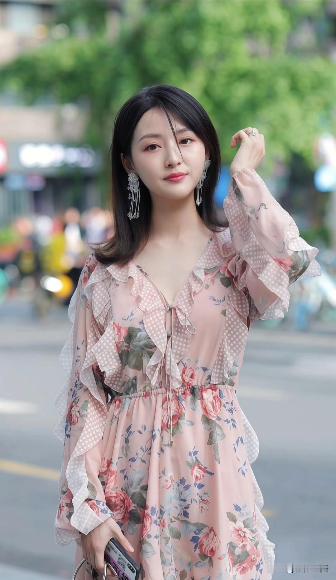 街头偶遇花裙姑娘,粉调印花配波点荷叶边,流苏耳饰与白包相衬,笑容明媚,夏日浪漫尽显。