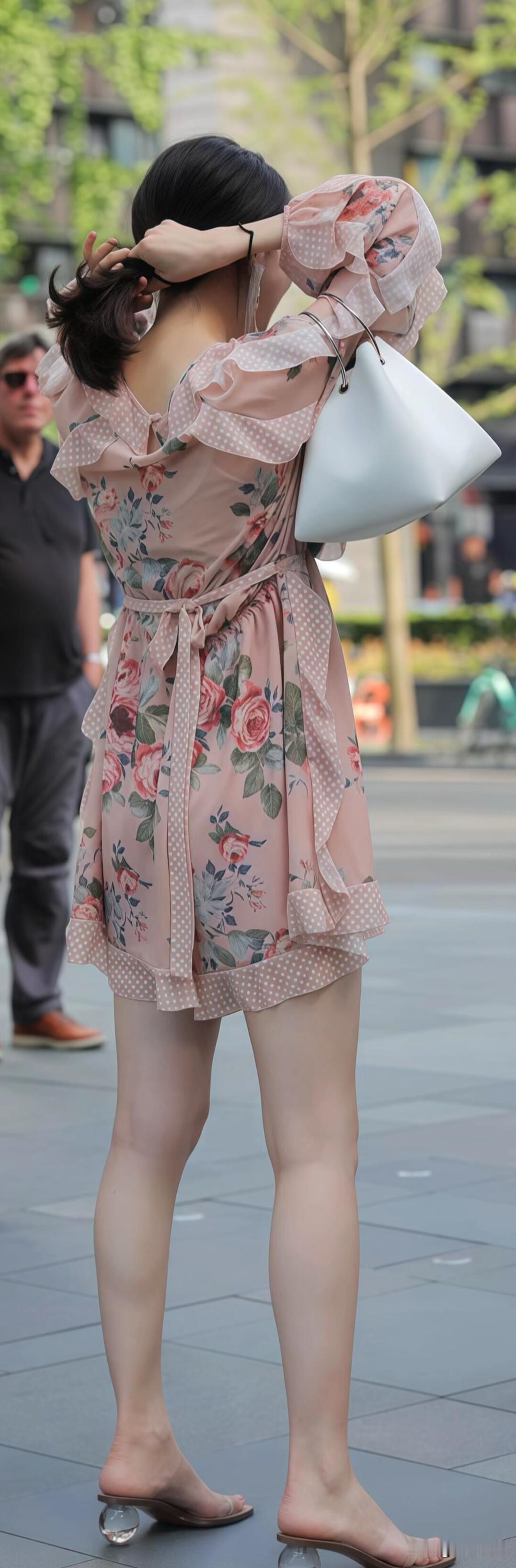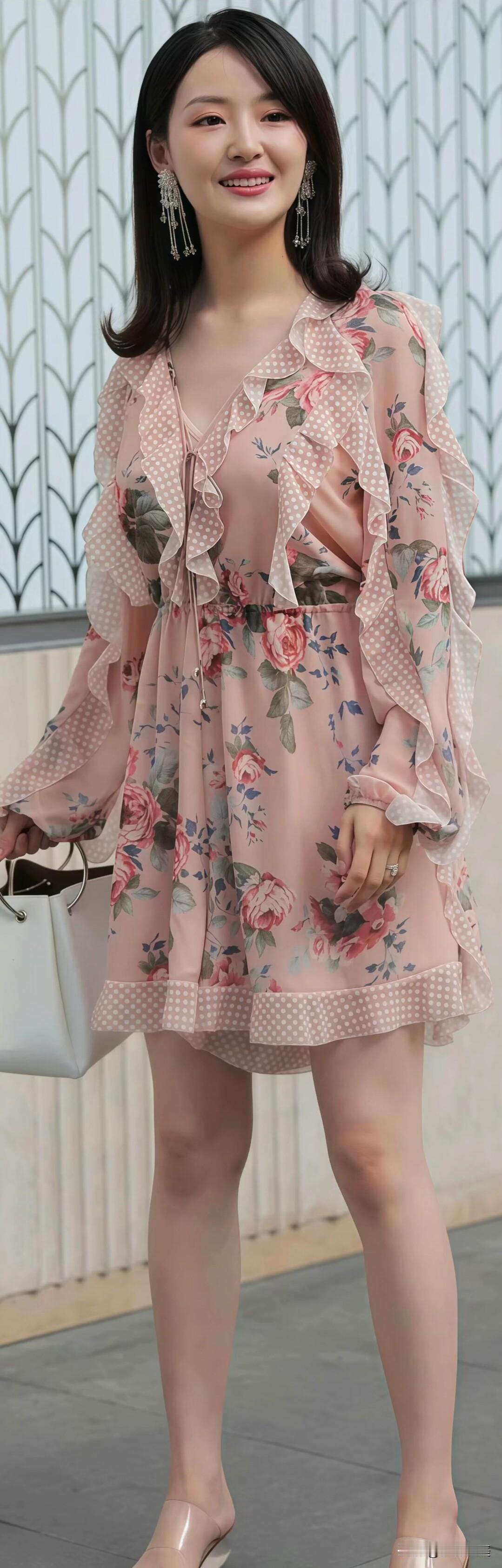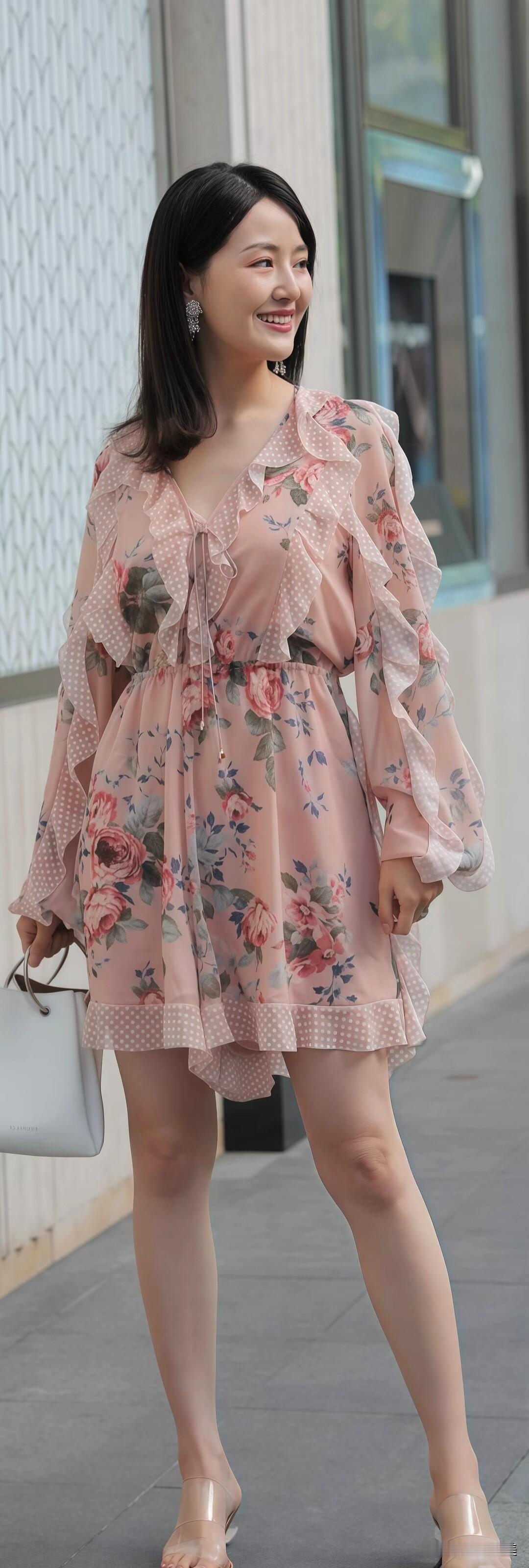 街头偶遇花裙姑娘,粉调印花配波点荷叶边,流苏耳饰与白包相衬,笑容明媚,夏日浪漫尽显。