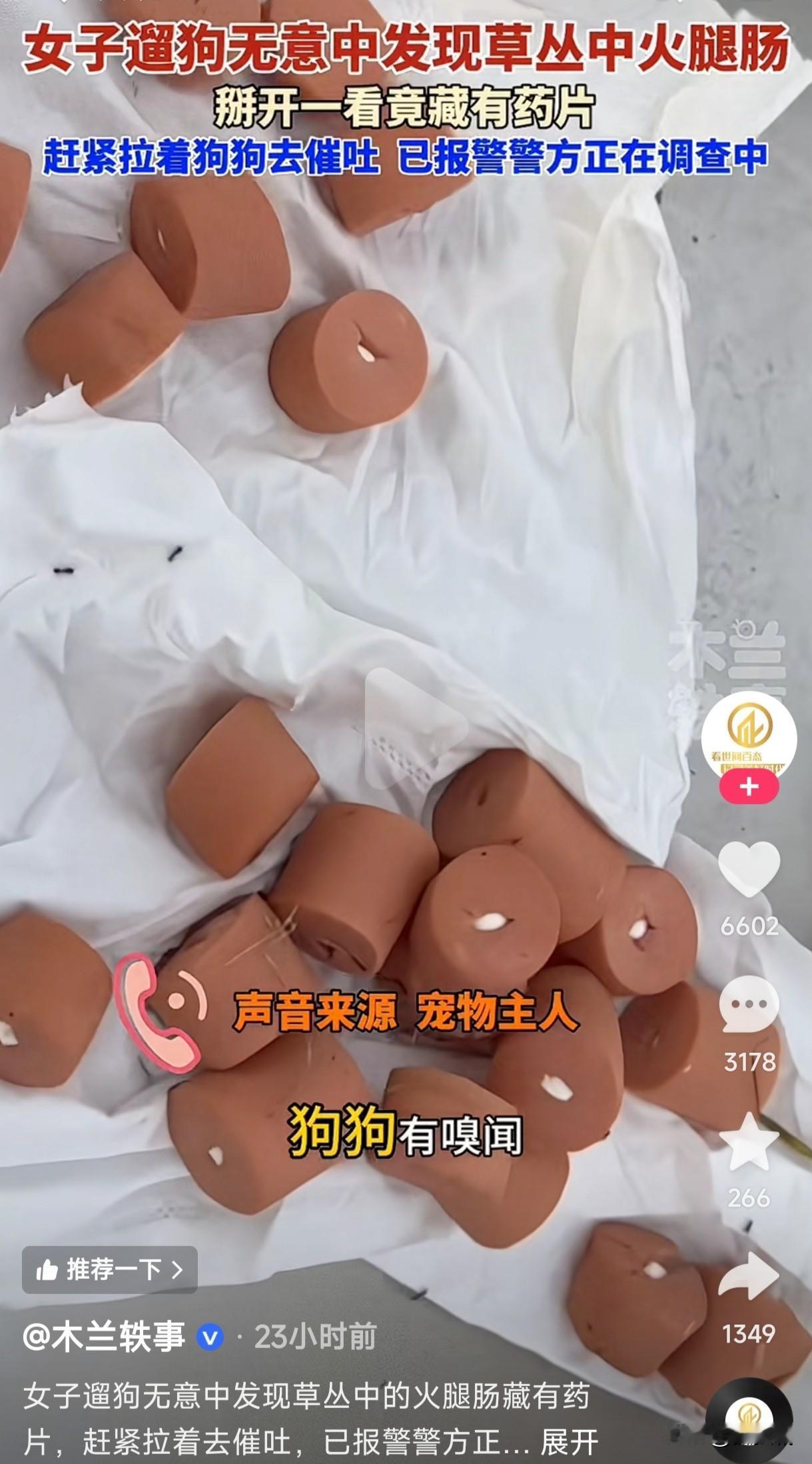 女子遛狗无意中发现草丛里的火腿肠中竟然藏有药片,赶紧拉着狗去宠物医院催吐,这是针对狗的还是? 这到底是有人故意扔的,还是无意的?为什么草丛里会有火腿肠呢?并且火腿肠里面还藏有药片,这是专门针对狗的吗?还是和狗主人有什么过节,故意这样干的? 谋财害命不是伤天害理吗?万一这把狗毒死了可咋办?这不是故意害狗子的命吗?这幸亏被女子给及时发现了,万一被狗给吃了,这不是白白害狗命吗?这到时候是真的就说不清了? 狗子是人类最忠实的朋友,不喜欢也就算了,为何要去伤害它呢?