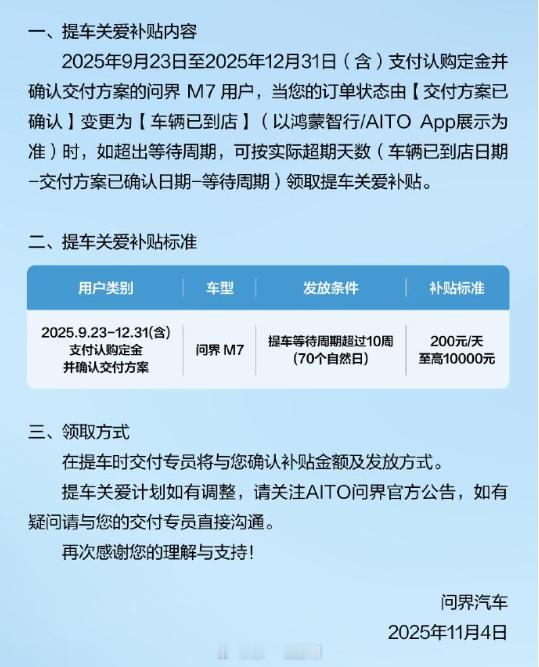 全新问界M7 提车关爱计划对准车主来说是非常不错 ,等待超70天每天补贴200元