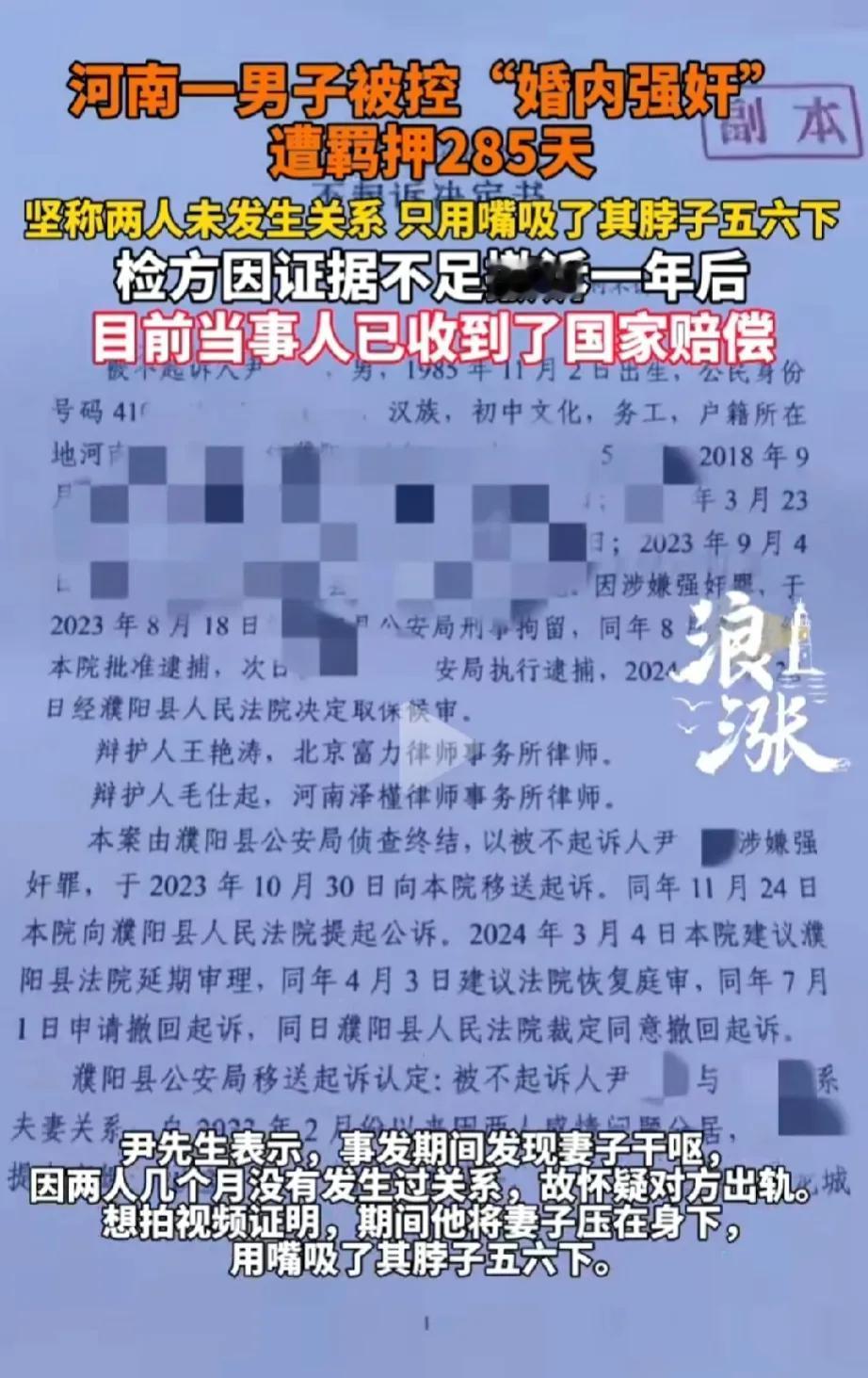河南濮阳,女子打电话报警称,她被丈夫强 奸了,还跑到邻居家求助,丈夫辩称:她是想离婚分财产,才给我扣的名堂,我只是用嘴吸了她脖子5、6下。警方立案后把丈夫拘留了,谁料,男子被关押285天后,警方以证据不足,把他放了。男子憋屈坏了,申请国家赔偿,结局引发网友热议。 2023年7月26日,武女士打电话报警称,她被丈夫尹先生强 奸了。 武女士说,她当时还跑到邻居家求助,如果警方不信可以到邻居家调查。 警方接警后,很快把武女士和她丈夫尹先生带到派出所问话。 尹先生气坏了,他跟警方辩称,他并没有强奸武女士,他只是把武女士压在身下,用嘴巴吸了她脖子5、6下,更何况他们是合法夫妻,哪来的强 奸一说。 尹先生还说,武女士之所以给自己扣这个帽子,是因为她早就想离婚了,她打算分走部分财产才想出的幺蛾子。 原来,武女士和尹先生经人介绍认识,两人于2013年结婚,婚后共育有两女一儿。 虽然,结婚后不久,武女士就发现,她跟尹先生性格不合,两人之间矛盾不断。 但是,她以为他们有了孩子后,两人会为了孩子,改变自己,照样也能过上幸福的生活。 但,武女士想错了,江山易改本性难移,虽然他们之间有了孩子,但是依然矛盾不断。 终于,武女士受不了了。 2023年3月,武女士把尹先生起诉到法院,她声称自己跟丈夫性格不合,长期被丈夫家暴,要求法院判决他们离婚。 可法院经过调查后,审理认为,武女士提交的证据不足,最终驳回她离婚的诉求。 武女士的诉求被驳回了,但,她并未因此放弃离婚的念头。 2023年7月26日那天,武女士打电话报警称,她被丈夫尹先生强奸了,事发的时候,她为了自保还跑到邻居家求救,对此警方可以跟邻居求证。 可尹先生到了派出所后,却说,他并没有强 奸武女士,事发当天,他发现武女士一直干呕,像极了怀孕时的表现,可自己已经好几个月没跟她发生关系了。 尹先生怀疑,武女士背着自己在外偷人,两人因此发生争执,争执中,尹先生把武女士压在身下,用嘴亲了她脖子5、6下。 武女士不满,因此报警,另外,尹先生还说,他们结婚后,在县城买了房,又买车,武女士为了分得财产才给自己扣上这个名堂。 事后,尹先生家人还提供了,他早前在医院检查出的,阳 痿早 泄的诊断报告。 尹先生因此,被放出来。 但,之后警方在尹先生的内裤上检测到了武女士的DNA,在武女士的脖子上检测到了尹先生的DNA。 2023年8月18,警方以强 奸罪立案,并对尹先生刑事拘留。 尹先生在关押期间,武女士跟他提出了离婚,事后,尹先生说,他当时是稀里糊涂签了字,房产归女方所有,债务由他本人承担。 没想到,尹先生在被关押了285天后,于2024年7月31日,检方以“现有证据不足,达不到起诉条件”做出不起诉决定,尹先生得以释放。 尹先生被放出来后,觉得很委屈,他不想平白无故被关押,询问了律师后,于今年5月份向国家申请赔偿。 经协调,今年9月22日,尹先生收到了包括人身自由赔偿金和精神损害抚慰金在内的国家赔偿。 对此,有人说,国家不应该背锅,谁制造了这出丑剧,就应该由谁承担法律责任。 也有人说,婚内强奸,就是对法律的一种玷污,因为中华人民共和国法律法规明文规定,领取结婚证书以后,男女之间就是合法夫妻,是受囯家法律保护的。 那么,合法夫妻有没有强奸一说,法律如何规定? 根据《刑法》第236条规定,以暴力、胁迫或者其他手段强奸妇女的,处3年以上10年以下有期徒刑 。 婚内强奸是否构成犯罪,关键看实施具体行为时婚姻关系是否处于正常状态 。 在本案中,武女士于2023年3月起诉离婚,虽法院因证据不足驳回其诉求,但她并未放弃离婚念头。 2023年7月26日又报警称被丈夫尹先生强奸,此时双方婚姻关系已处于不稳定状态。 如果尹先生确实违背武女士意志,使用暴力、胁迫或其他手段强行与武女士发生性关系,是可能构成强奸罪的。 然而,检方最终以证据不足撤回起诉,这表明现有证据无法确凿证明尹先生的行为符合强奸罪的构成要件。 这也体现了司法机关在处理婚内强奸案件时,对于证据的审查判断较为严格,需综合多方面因素进行认定。 尹先生被关押285天,之后又以证据不足被放出来,从法律角度如何分析? 《刑事诉讼法》第175条规定,人民检察院审查案件,对于需要补充侦查的,可以退回公安机关补充侦查,对于二次补充侦查的案件,人民检察院仍然认为证据不足,不符合起诉条件的,应当作出不起诉的决定。 本案中,虽有双方DNA证据,但武女士衣物及身体未检出精斑,且尹先生有阳痿早泄诊断报告,现有证据无法证实“强行发生性关系”的核心事实,故检方以证据不足撤回起诉。 根据《国家赔偿法》第33、35条,侵犯公民人身自由按日计薪赔偿,造成严重精神损害需赔付抚慰金,最终,尹先生获赔33万元,符合此规定。 @猫眼学法