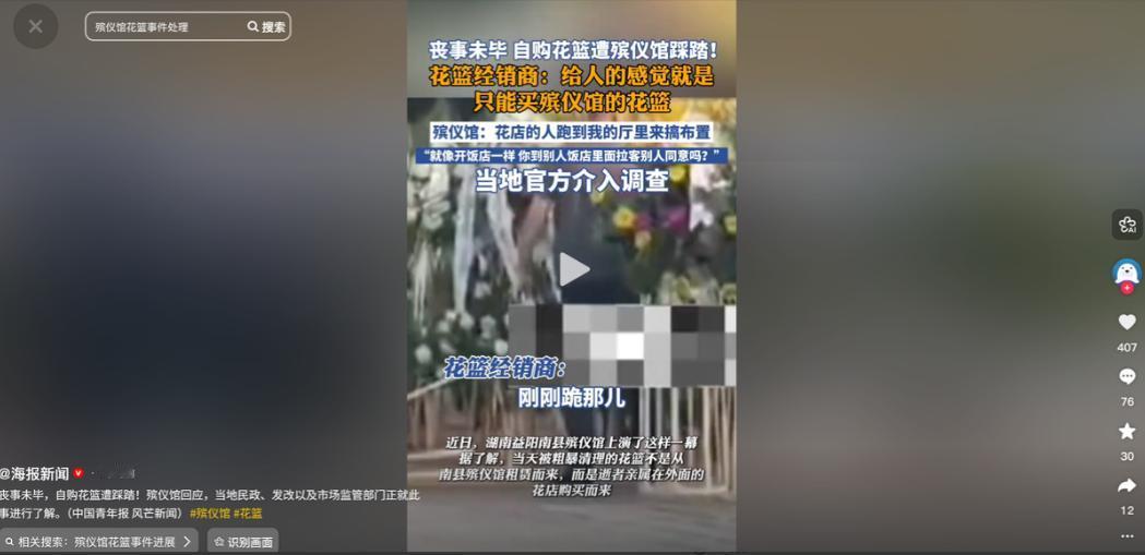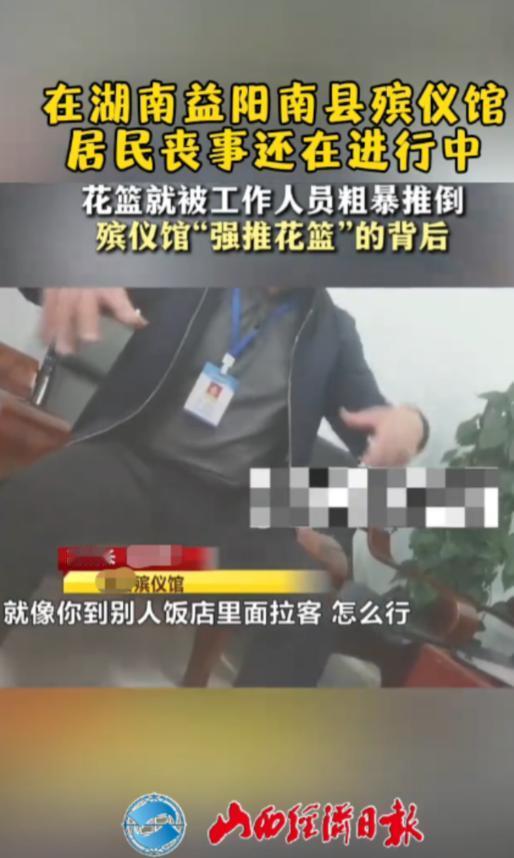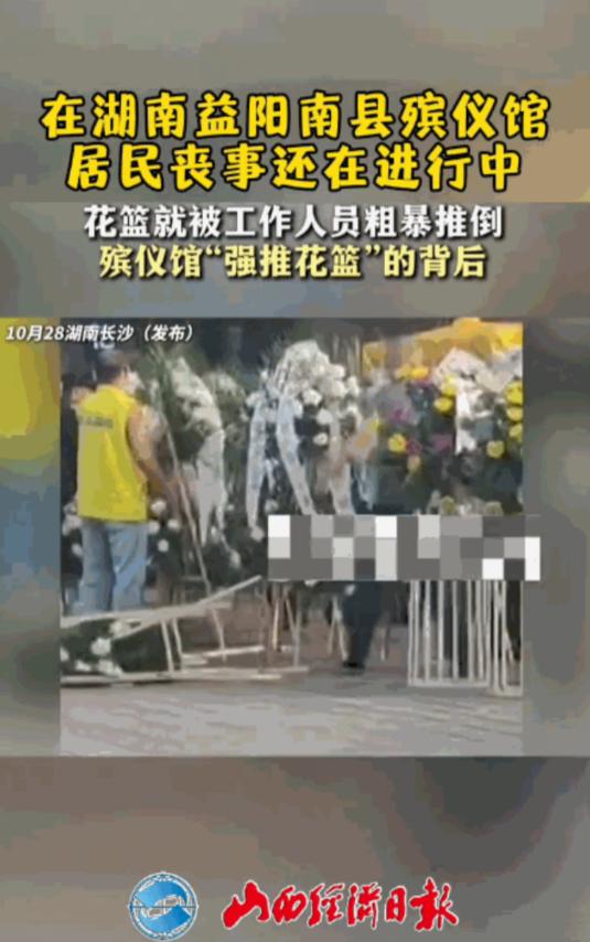 “太缺德了!”10月9日,湖南益阳,家属正在殡仪馆举办丧事,结果,工作人员却将门口摆放的花篮推倒、踩烂!经过观察,工作人员只破坏了木架的花篮,塑料的花篮却完好无损,原来,这些木架花篮是家属从外面买的。殡仪馆:存在不妥,将改进。 麻烦看官们右上角点击一下“ 关注”,既方便您进行讨论和分享,又能给您带来不一样的参与感,感谢您的支持! 那天的南县天有点阴,风里带着一股凉气,殡仪馆外的柏树沙沙作响,灵堂里飘着檀香,哭声低低的,连空气都显得凝重。 家属在灵前守着,花篮摆满了门口,那些花新鲜得很,花瓣上还有水珠,是从外头花店特意订的木架花篮,家里人想着,送最后一程,得体面点,也算是把心意放进去,可谁也没想到,一场原本庄严的告别,会变成一出让人心凉的闹剧。 几名殡仪馆的工作人员走了过来,手里没拿工具,神色冷漠,大家以为是来帮忙布置的,结果下一秒,木架花篮被推倒在地,“哗啦”一声,木片四散,花枝摔得乱七八糟,有人还抬脚,用力踩了几下,花瓣被踩烂,颜色混着泥印,看着让人心里一紧,偏偏就在几步之外,另一排塑料架子的花篮站得笔直,安然无恙,那一刻,谁都看懂了点什么。 原来塑料架花篮是殡仪馆自己卖或租的,价格高不说,花材还没外面的新鲜,家属嫌贵,就从外面花店定了木架花篮,谁料这竟成了“罪过”。 工作人员的动作快得让人反应不过来,似乎生怕那几篮花抢了他们的“生意”,灵堂里的家属听到动静跑出来,看到这一幕,眼泪又涌了上来,有人气得直抖:“花是寄托心意的,怎么能这么糟践!” 视频传到网上后,网友们炸了,有人骂“丧尽天良”,有人叹“殡仪馆不讲德”,其实骂的不是几篮花,而是那种连悲伤都要明码标价的冷漠。 死者为大,这是老祖宗留下的规矩,可在某些人眼里,“死”也成了利润表的一行,有人调侃:“这下好了,连哭都得看价目表”说笑归说笑,讽刺却扎心。 殡仪馆后来出来回应,说“工作人员行为不妥”,会“批评教育”,还承诺会改进服务,听起来像是在念格式化的检讨。可那些被踩烂的花,补不回来;家属那种被羞辱的心情,也没法被一句“教育”安慰过去。 有人说,殡仪馆是送人最后一程的地方,理应是世上最温柔的地方,可现在越来越多成了“冷冰冰的收费站”。 这事之所以让人愤怒,不只是因为几个花篮被毁,更因为它揭开了一层不愿被提的旧事,殡仪馆的消费早就被吐槽多年:花篮、寿衣、骨灰盒,价格比外头贵上不少而且还没外面的质量好。 对此,大家有什么看法呢? 信源:海报新闻