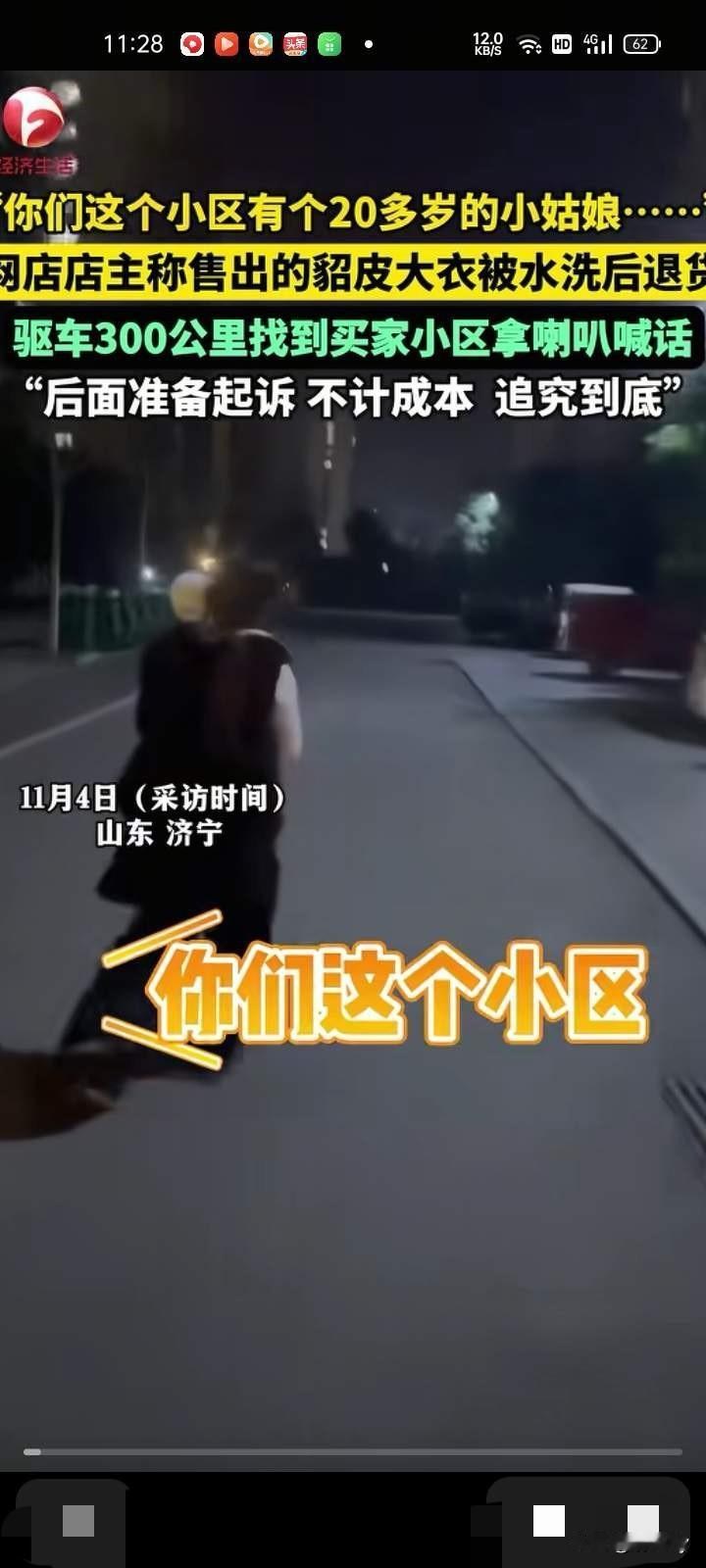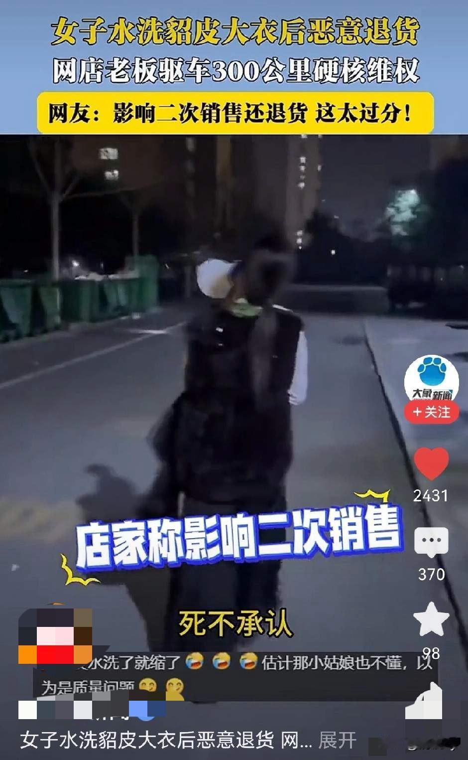 一年轻女子网购了一件貂皮大衣,用洗衣机洗报废后要求退款退货,商家开车三百多公里,找到了女子所住的小区! 老板拿着大喇叭,在女子的楼底下大声喊着:你们这个小区有个20多岁的小姑娘,从网上买了我的貂皮大衣,给我退回来,水洗之后她还死不承认! 老板拿着喇叭在小区里循环播放着这几句话,看得出来老板非常愤怒,宁可驱车300多公里也要讨个说法! 或许女子认为刚买的衣服都要洗一遍才能穿,没想到洗过之后变了模样,就想着退货了事,可是商家拿到货后影响了二次销售,几千块钱就要自己垫付! 如果是不想要了可以直接退货,如果是故意而为之,那这女子的品行可真差的不是一点半点!
