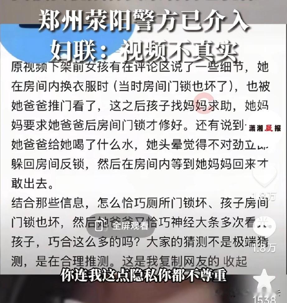 郑州荥阳女儿质问爸爸看她洗澡的后续来了,当地妇联说,视频不是真实的,公安已经介入
