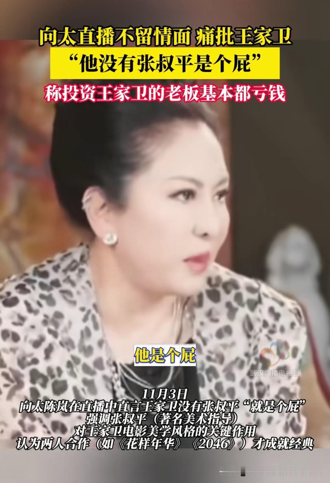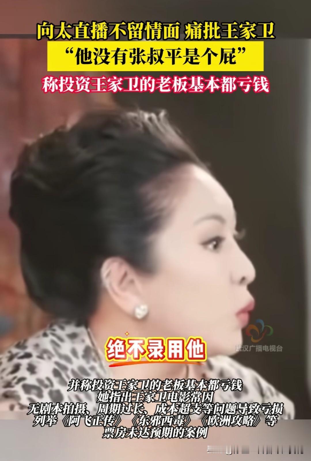 向太痛批王家卫啥也不是,还直言张叔平在王家卫电影独特美术风格的塑造上起到了极为关键的作用,没有张叔平的美术指导,就没有现在的王家卫。 如今我们再看王家卫的电影,感觉就像做语文的阅读理解一样,明明作者都没想到那方面,很多人非要强行上价值,不知道大家有没有这个感受。很多人对他的电影评价是,拍得有深度,艺术,看一遍觉得可以,基本后面不会想看了,仅限于此。 向太还称投资王家卫的电影基本都会赔钱,比如《东邪西毒》,投资就超2000万港元,结果票房仅900万,超支严重无奈到要靠《东成西就》救场。这也很好理解,耗时长,投资大,就为了打造一部极致的文艺大片,注定难回本。观众一旦看不懂,就只能觉得食之无味,弃之可惜。 记得曾经有人这样评价过王家卫,给你足够的时间和钱,你也可以做到的。大家觉得呢?欢迎留言。