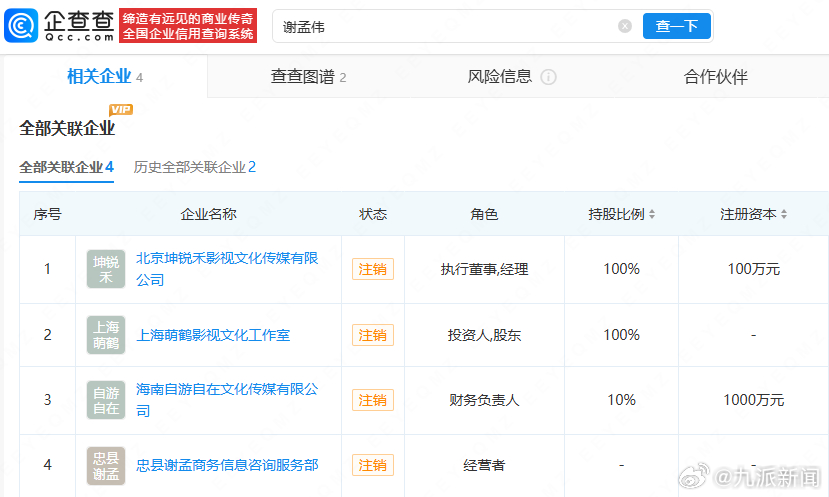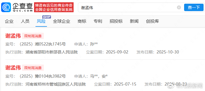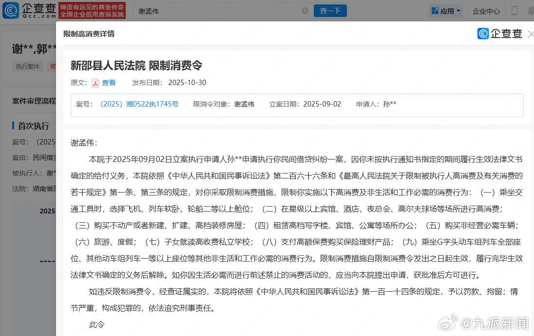 【#嘎子哥谢孟伟再次被限消#】#谢孟伟夫妇因借贷纠纷被限消# 11月4日,从企查查APP获悉,因未按指定期间履行生效法律文书确定的给付义务,谢孟伟(嘎子哥)及郭珊珊(嘎子哥妻子)被限制高消费,涉及民间借贷纠纷案件,执行法院为新邵县人民法院。今年9月,二人已因此案被执行210万余元。值得注意的是,此前,谢孟伟曾因民间借贷纠纷被河南省郑州市管城回族区人民法院执行171万余元,并被限制高消费。企查查显示,谢孟伟(嘎子哥)共关联4家企业,目前均已注销。谢孟伟的妻子郭珊珊共关联16家企业,其中10家为存续状态,包括北京嘎子哥文化传媒有限公司等。