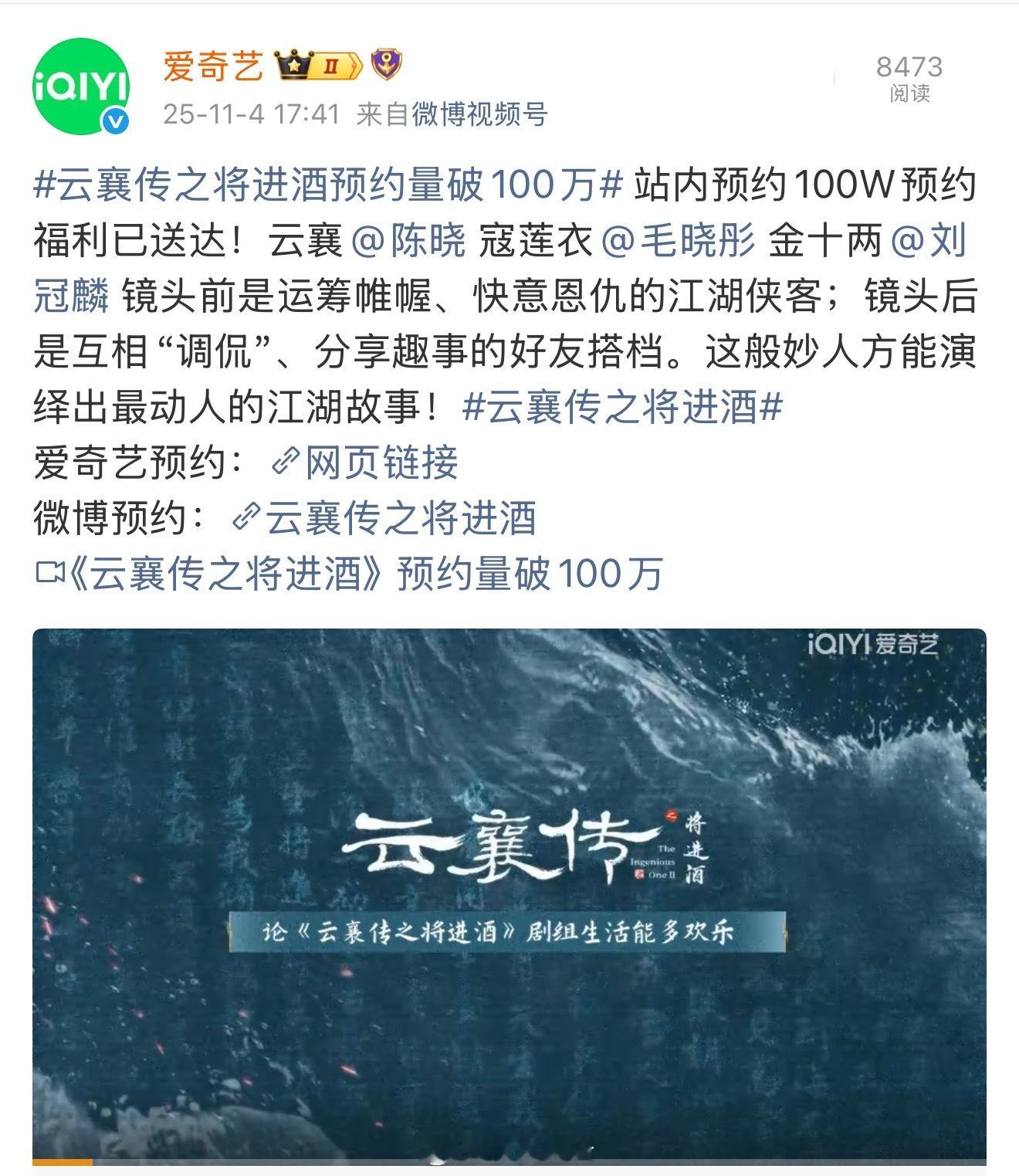 恭喜陈晓云襄传之将进酒预约人数破百万,期待早日见到算无遗策的公子襄。