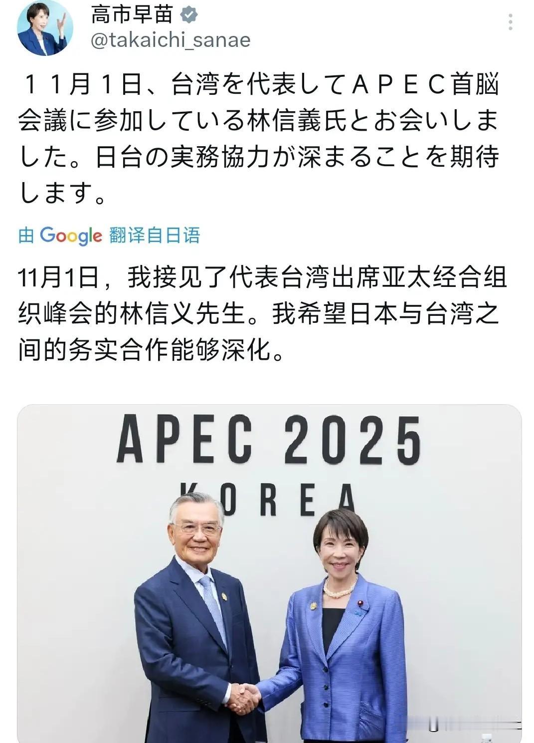 高市早苗接见林信义! 韩国亚太经合峰会期间,日本首相接见中国台北代表林信义! 这消息是高市早苗发文提到的,文中用接见,说明林信义是求见!而高市早苗提到希望日本与台湾的务实合作能够深化! 刚受到中方接见,高市早苗开始有点飘了,到中国台北这里来刷存在感了!APEC峰会里面没有台湾,只有中国台北代表! 我们可以原谅高市早苗第一次参会没经验!也希望不是故意的!看她下次到深圳能否会改?不过高市早苗能不能顺利坚持到明年,谁也说不清了! 高市早苗企图靠亚太经合峰会打擦边球是踩红线的恶意行为!1972年签署的中日四个联合公报可是清楚的表明,台湾是中国台湾省!作为日本首相接见所谓的“台湾代表”不合适,声称“日台紧密合作”更是违背“一中原则”! 可能林信义可以返台交差了,没机会见到特朗普,受到高市早苗的接见也是“功德圆满”!