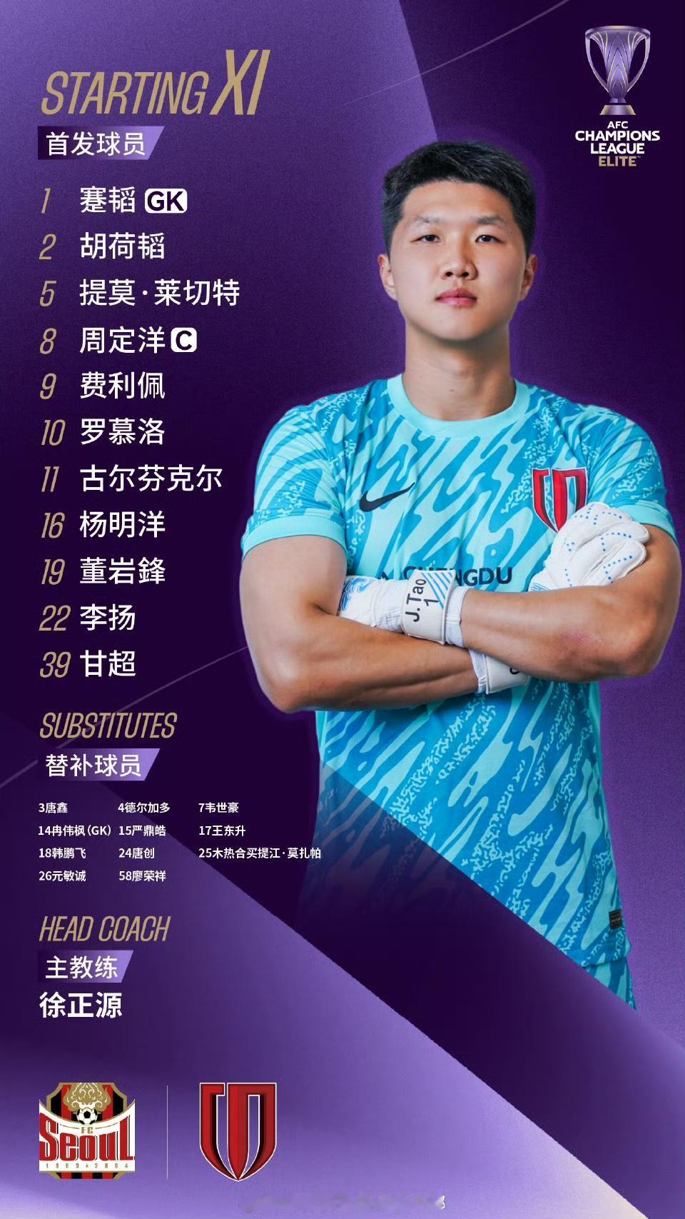 成都蓉城对阵首尔亚冠首发出炉,韦世豪还是替补,但是这一场有可能会有出场时间,成都蓉城今晚加油啊,虽然联赛无法夺冠,但是如果亚冠小组能够出线也是创造球队历史!
