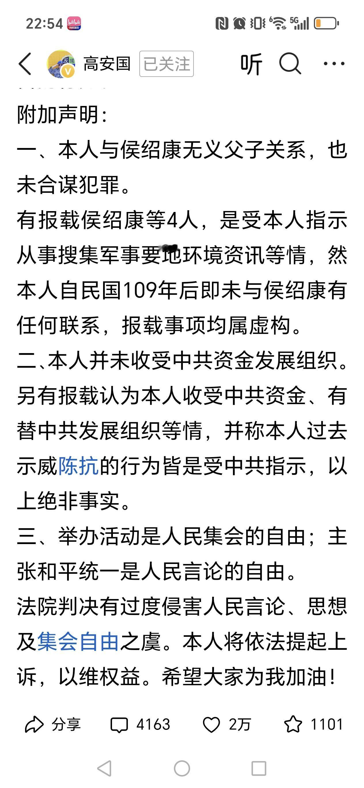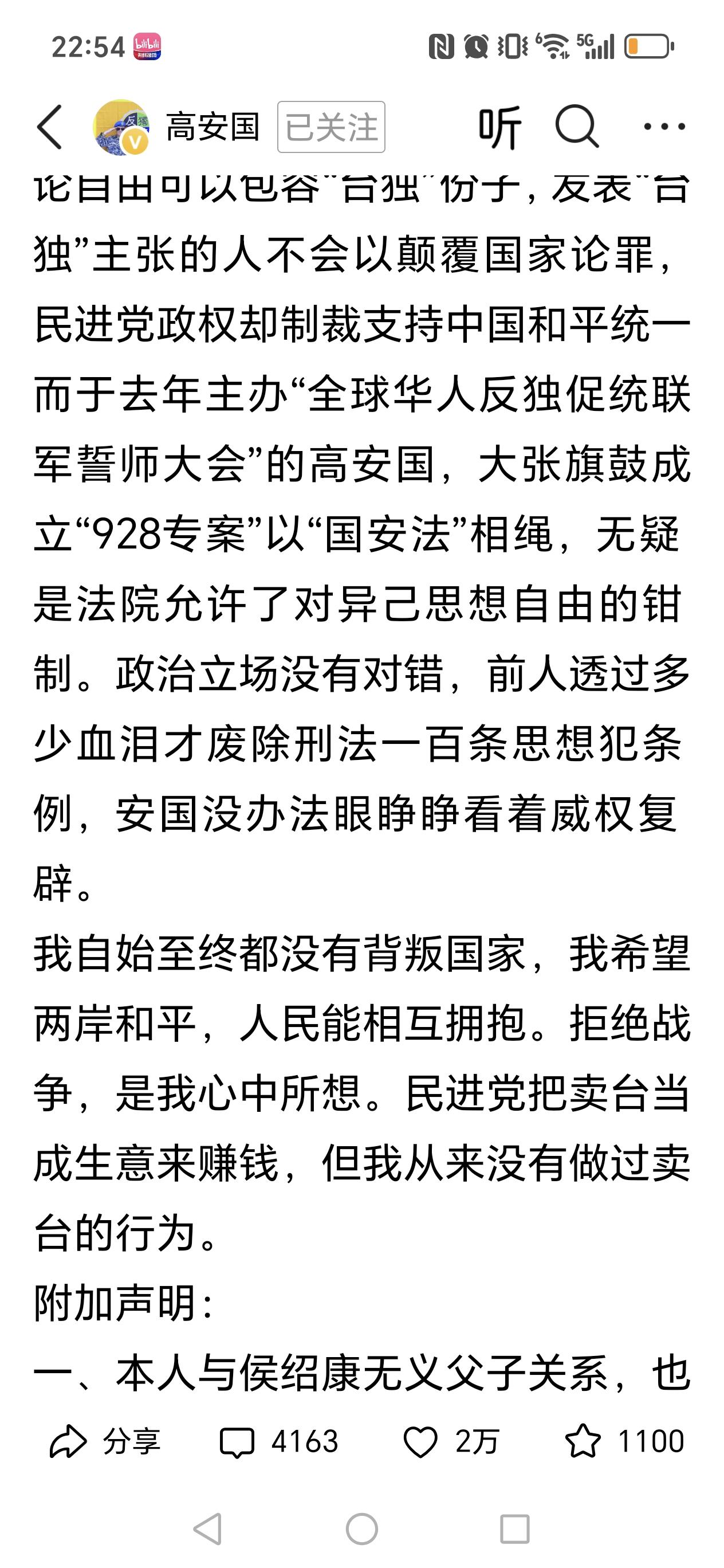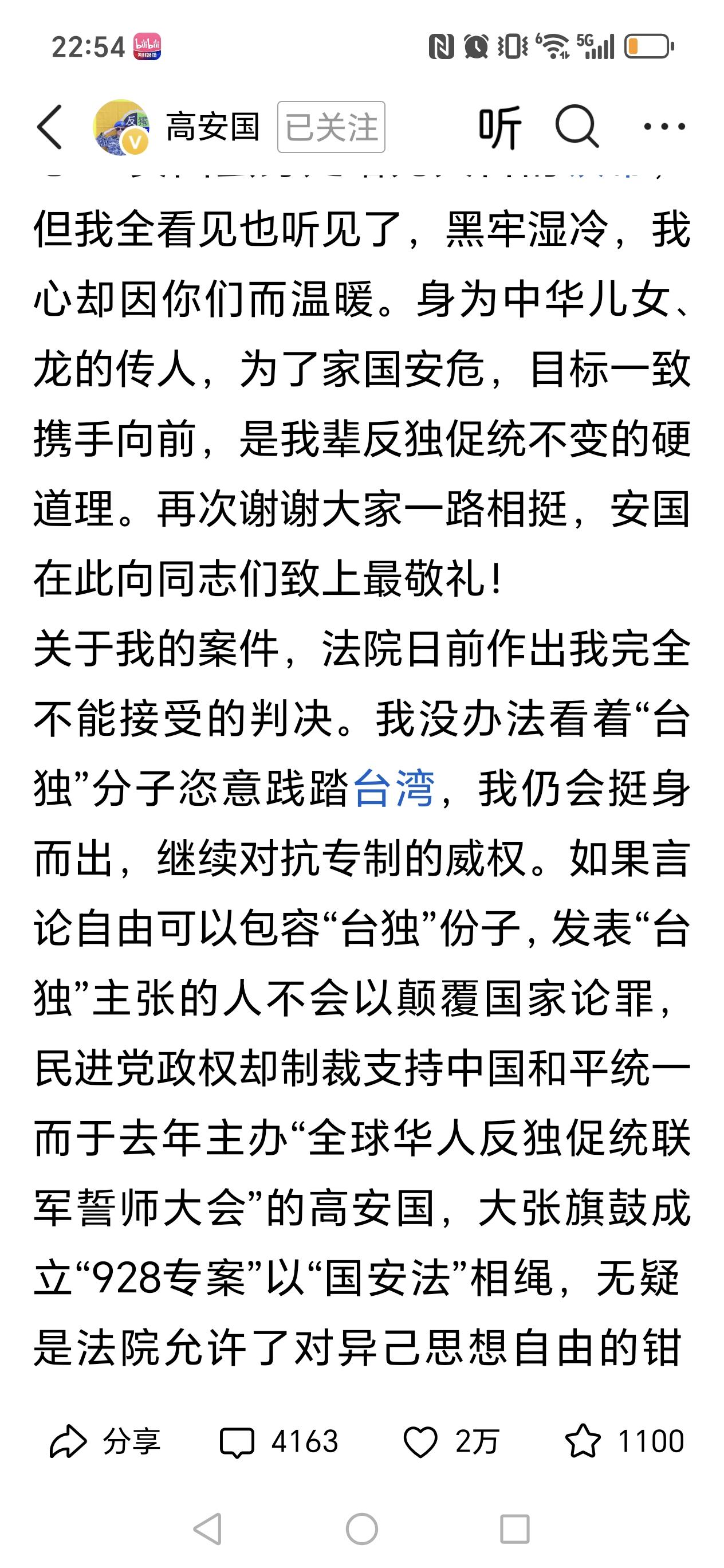 突然看见高安国将军的头条号。 这两天高安国将军在头条直接火了,火的最主要的原因就是一个,支持两岸统一。 81岁高龄,多少人已是颐养天年,而高将军却还在为两岸统一事业奔波劳累,真是让我辈汗颜啊。最可恨的是民进党当局,竟然让81岁的老人去坐牢还禁见,这件事做的天理难容啊。在怎么政见不一,也不至于对81岁的老人动手啊。