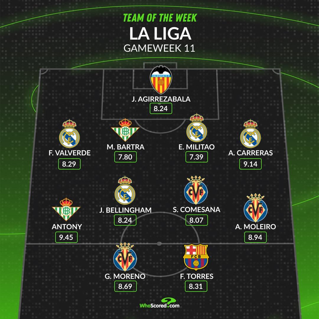 虎扑11月04日讯WhoScored今日发布西甲第11轮最佳阵容盘点,具体如下: