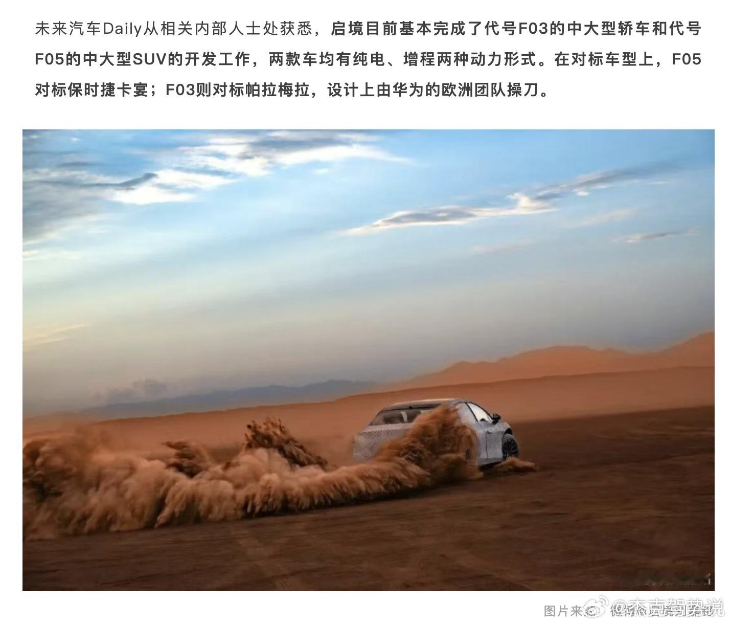 根据《未来汽车Daily》的报道,华为和广汽合作的启境品牌将会推出两款车型,对标保时捷。“F03的中大型轿车和代号F05的中大型SUV的开发工作,两款车均有纯电、增程两种动力形式。在对标车型上,F05对标保时捷卡宴;F03则对标帕拉梅拉,设计上由华为的欧洲团队操刀。”