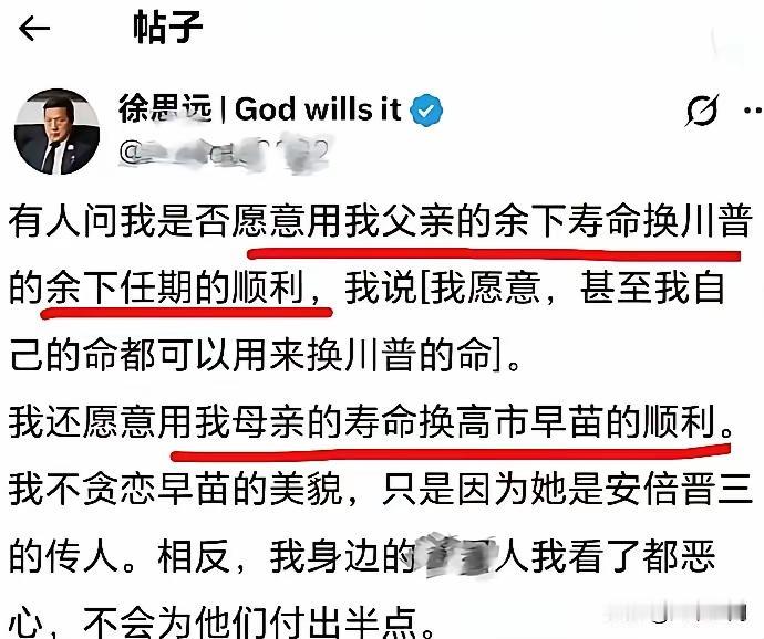 估计他老爹老妈看到这条消息得气死!想问一下徐先生,你做出这个决定的时候,征得你爹你妈同意了吗?你可以毫无顾忌地舔!舔得川普和早苗高兴!但是不见得你爹你妈也愿意和你一起舔! 大家看下图划红线的内容,能不能把你看恶心了?
