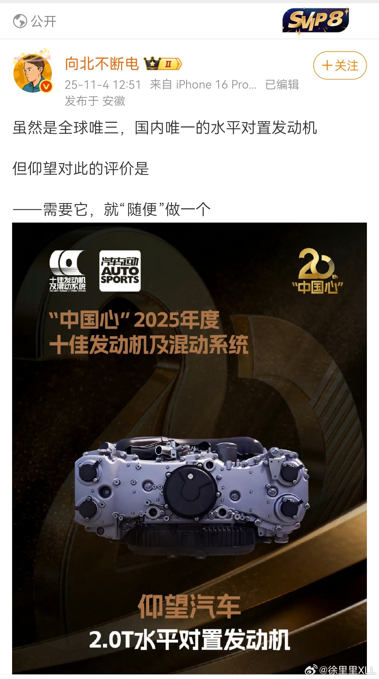 2.0的排量,水平对置八缸的布局,这个规格可真的是全球唯一...