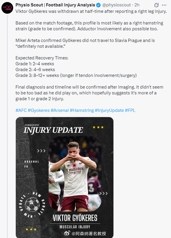 最终诊断和恢复时间表将在影像检查后确定,由于约克雷斯坚持比赛,伤情似乎并不太严重,这或许表明伤情更接近1级或2级 金秋观赛季 阿森纳著名教授
