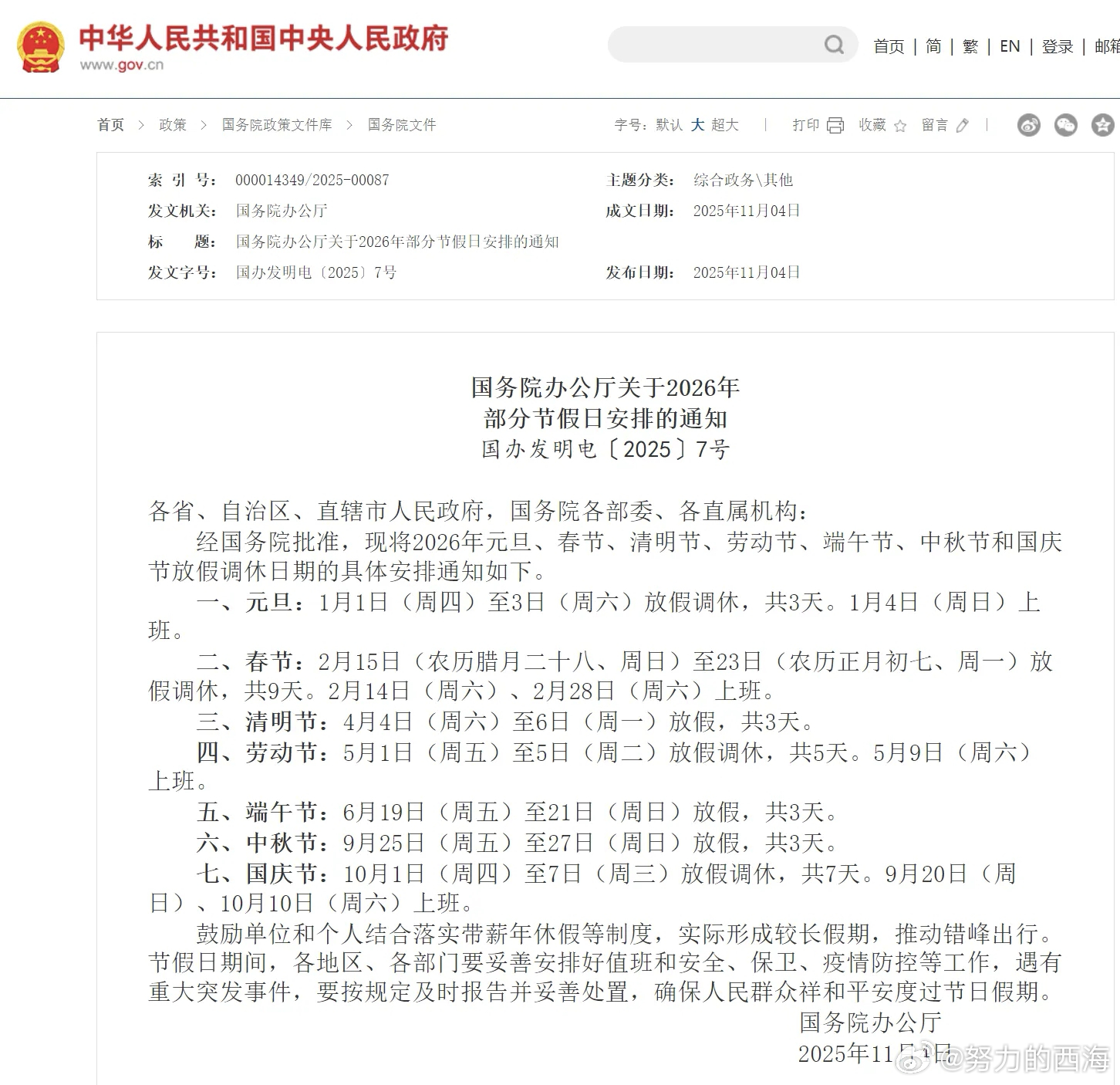 春节放9天、国庆放7天,2026放假安排来了。2026放假安排2026春节放9天