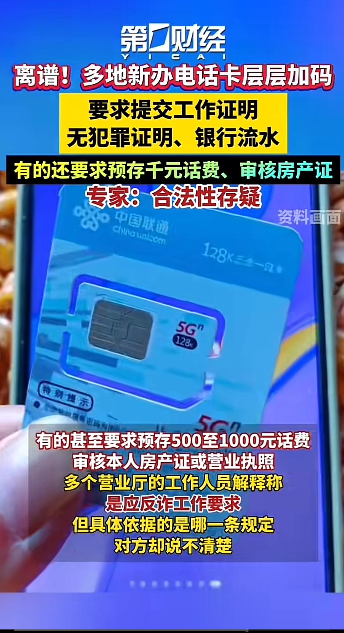 现在多地新办电话卡层层加码的情况太离谱了。有消费者想在南昌办卡,营业厅竟要求无犯罪记录证明;实测多地营业厅,审核标准差异大,有些仅要身份证,有些却要工作证明、银行流水,甚至预存500 - 1000元话费、审核房产证或营业执照。 营业厅称是反诈要求,可具体依据却不清楚。工信部专家表示,部分额外要求暂无全国统一法规授权,合法性存疑。11月4日,江西省通信管理局针对当地办卡难题已责成企业排查整改。希望相关部门能规范办卡要求,别让消费者办卡这么难!