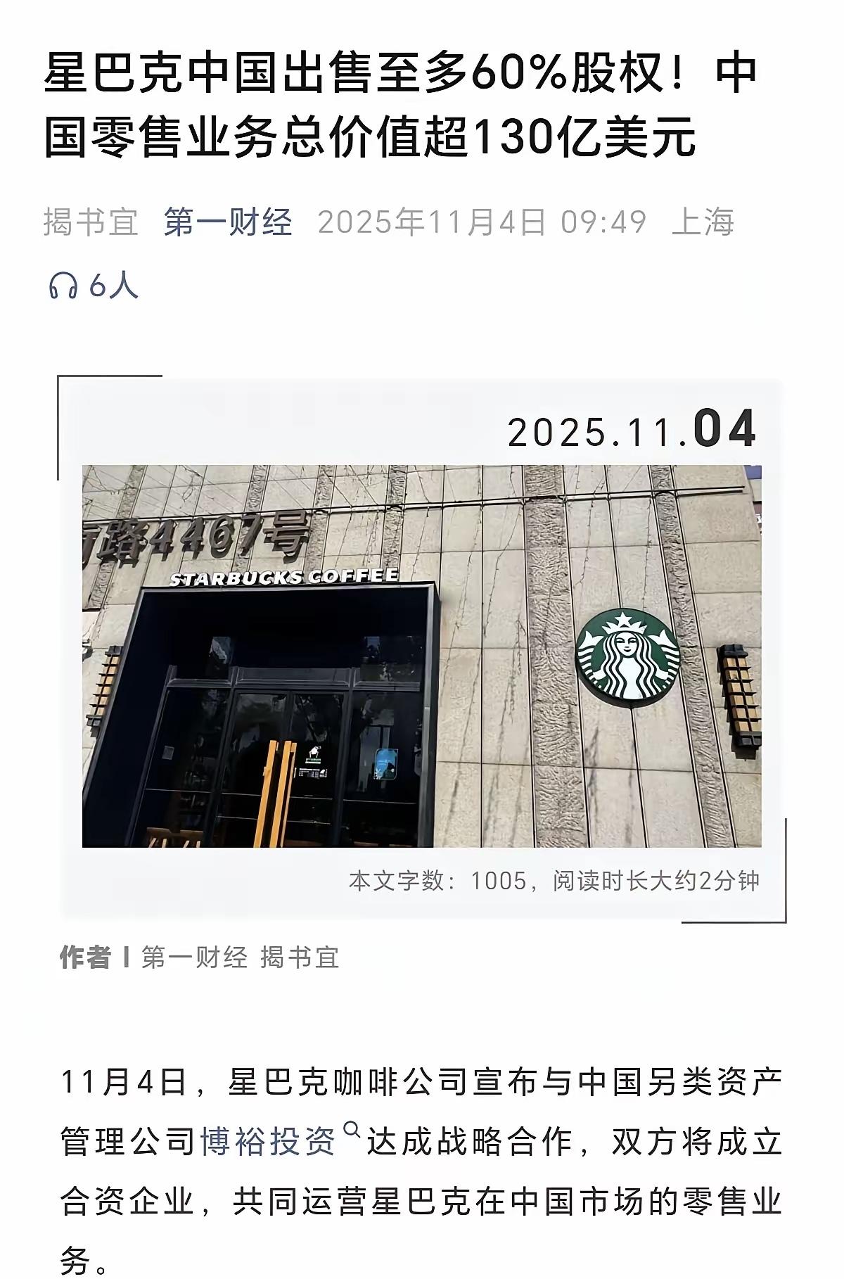 11月4日,星巴克公司在官网上正式官宣将星巴克中国60%的股权以40亿美元卖给博裕投资,自己只保留40%股权,这意味着星巴克中国彻底易主。 消息一出,不少常喝星巴克的人都在疑惑:明明财报看着不错,怎么突然就卖了? 先看星巴克中国的“成绩单”。它1999年进入中国,2015年就成了星巴克全球第二大市场。2025财年营收31.05亿美元,还同比增长5%,连续四个季度都在涨。 但光鲜数据下藏着隐忧。最明显的就是市场份额掉得厉害,从2017年的42%跌到2024年的14%,短短七年少了近三成。 为啥掉这么快?看看本土品牌的动作就知道。2025年Q3瑞幸门店已经超1.6万家,库迪还一直推“9.9元咖啡”,把价格拉得很低。 而星巴克呢?最低端的产品也要28元,和本土品牌8-12元的主力产品比,性价比差太多。2025年9月有个第三方调查,只有18%的消费者愿意为星巴克的“第三空间”多付10元以上。 再说说这个“第三空间”,其实就是换了个名字的欧洲传统社区咖啡馆模式。在欧洲,星巴克两进两出都没做好,现在虽然又进去了,日子还是不好过。 大洋洲更惨,澳洲市场已经完全退出,新西兰的门店也关得只剩没几家。看来这个模式也就在美国和中国还行得通。 这次买走股权的博裕投资,之前投过蜜雪冰城。当时它推动蜜雪冰城下沉市场做得很成功,说不定这次也会让星巴克往平价方向走。 其实早在2025年8月,星巴克全球CEO就说过要“聚焦北美、中东核心市场”,中国业务出售,应该是全球收缩战略的一部分。 微博上关于星巴克中国易主的讨论也很热烈。43%的网友觉得“早该降价了”,29%的人担心“第三空间会消失”,还有28%的人看好博裕的改造。 不过也有人吐槽星巴克的服务,说部分员工态度像“大爷”,眼睛都快翻到天上去了。一个做咖啡的,真没必要有这么大优越感。 以前拿杯星巴克还能当“精英白领”的象征,现在大家更看重实惠,这个标签早就不管用了。 接下来星巴克中国要么赶紧做差异化,要么就放下身段降价,不然很可能被挤出市场。博裕会不会帮它改过来,还得看后续动作。 文章描述过程、图片都来源于网络,涉及版权或者人物侵权问题,或有事件存疑部分,联系后即刻删除或作出更改