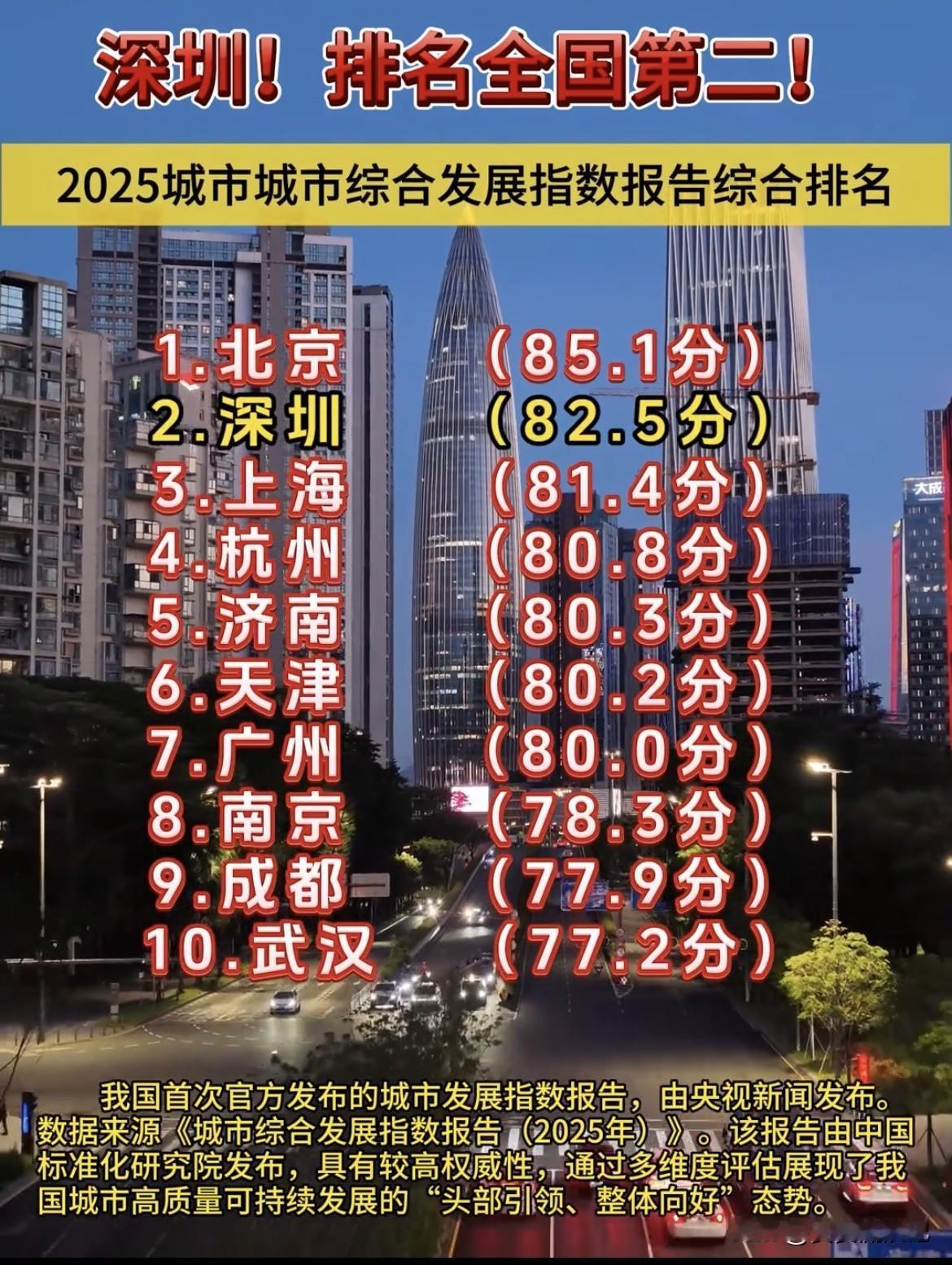 2025年城市综合排名有不少看点,深圳排第二很亮眼。10月13日发布的《城市综合发展指数报告(2025年)》里,深圳以82.5分位居全国第二,仅次于北京的85.1分,超过上海的81.4分。在创新城市测度维度,深圳和北京、上海领跑,技术创新与成果转化能力强;美丽城市测度维度,深圳和贵阳、长沙表现出色,生态优势明显。8月6日发布的中国百强城市排行榜中,深圳也稳居前列。深圳能有如此成绩,靠的是强大的创新实力和良好的生态环境,未来肯定能继续保持优势。