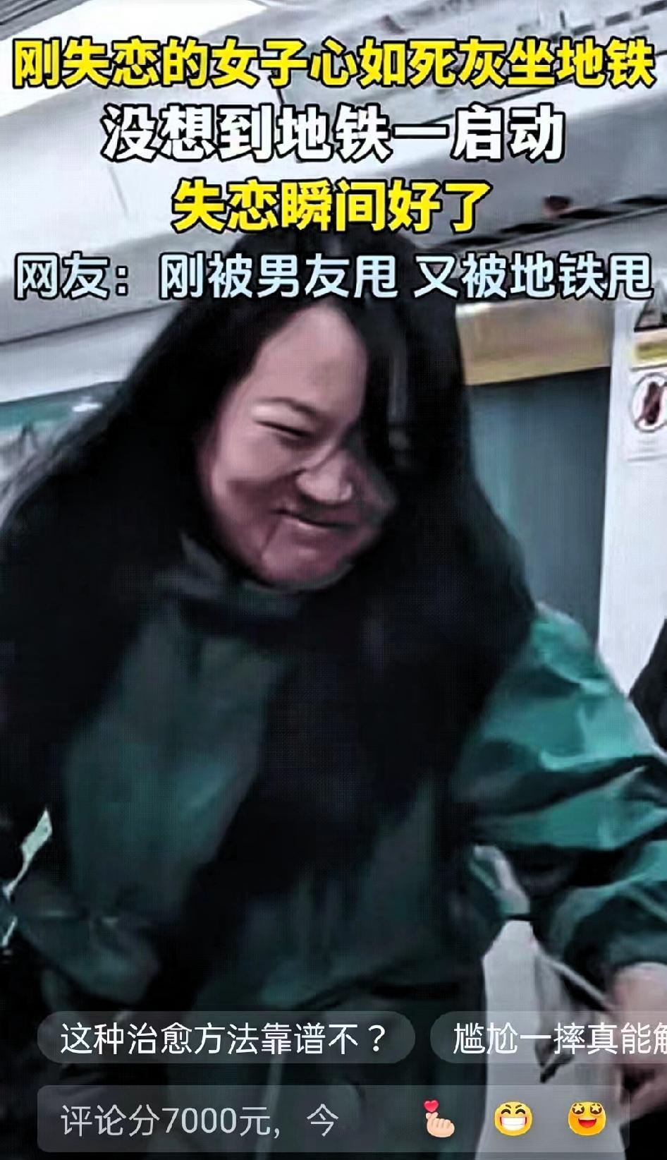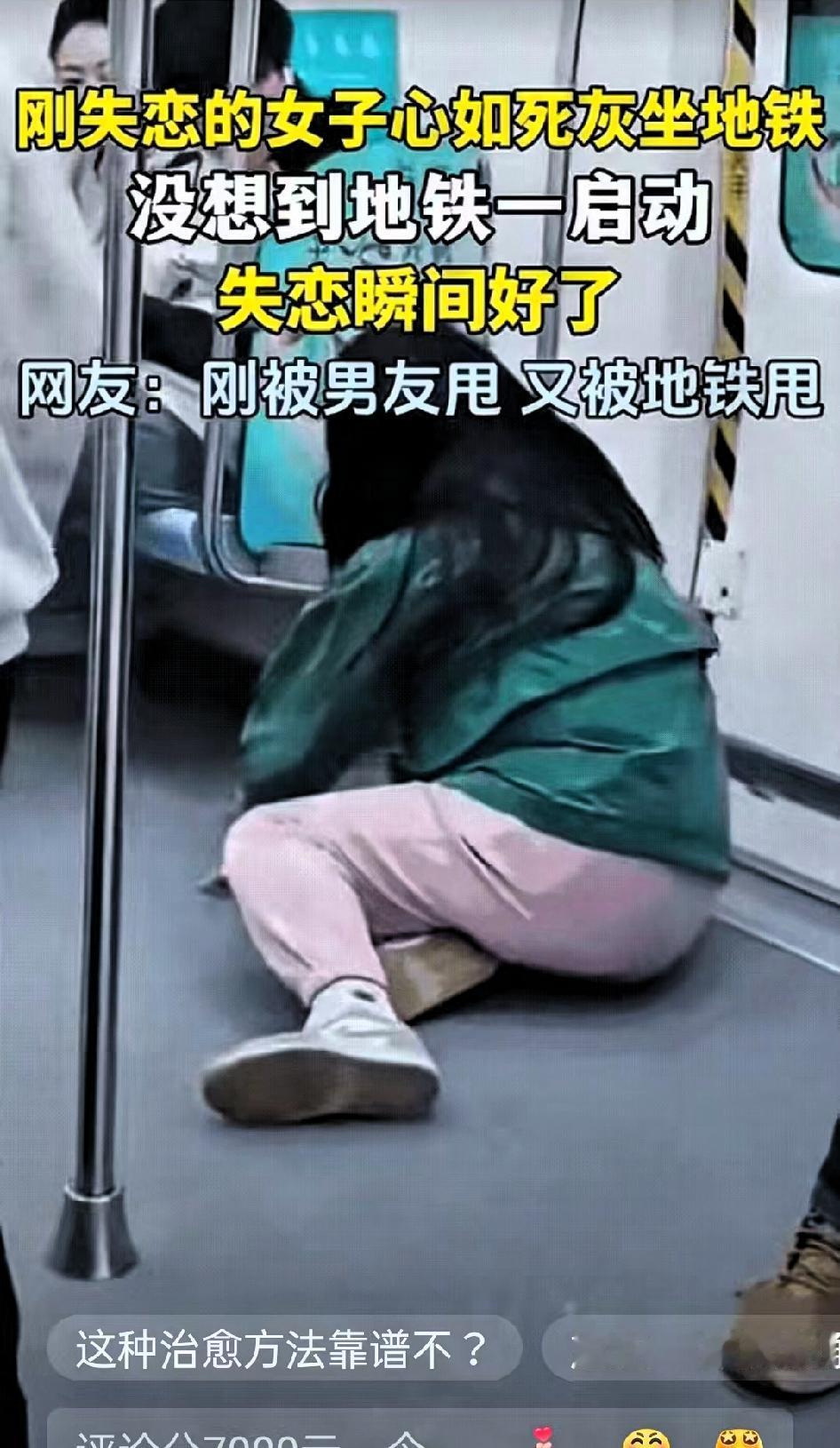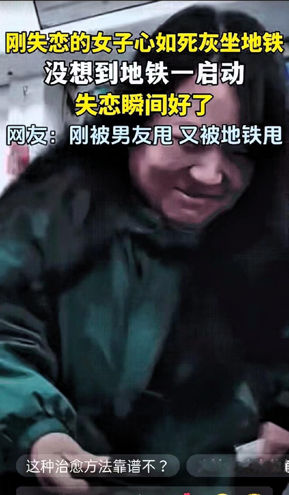 笑不活了!”江苏一名女子刚失恋,和男朋友分手后她搭乘地铁回家,回家时整个人蔫得像霜打了的菜 朋友看着她站在那儿直愣愣的,劝她找个座位歇会儿,她只面无表情地摇了摇头,脸色白得没半点血色,那股子“世界都塌了”的丧劲儿,隔着屏幕都能让人跟着心疼。 结果地铁刚启动,惯性一冲她没稳住,“啪”地一下摔在车厢地板上,周围乘客还没来得及伸手扶,她自己先“噗嗤”笑出了声——估计是尴尬到想钻地缝,又或是这一摔太突然,把满脑子的委屈、难过全给震散了,笑着笑着,原本紧绷的肩膀松了,脸色也慢慢红润起来,眼里的死气一下子就没了。 网友评论更是说出了大家的心声:“前一秒还觉得她好惨,被男友甩完又被地铁‘甩’,后一秒看她笑,突然就被治愈了!”“这哪是摔跤啊,分明是把坏情绪摔出去了!”还有人调侃:“建议失恋的都来坐地铁,说不定能收获‘意外疗法’!” 其实仔细想想,生活里哪有那么多跨不过去的坎?很多时候,我们不是被失恋本身困住,而是被自己反复拉扯的执念缠得难受,总把“失去”当成天大的事。 反而这种猝不及防的小尴尬、小意外,像一记温柔的“清醒拳”,让我们突然明白:比起沉浸在痛苦里,笑着面对眼前的小狼狈,好好过好当下,才更重要。 你有没有过这种“意外被治愈”的时刻?