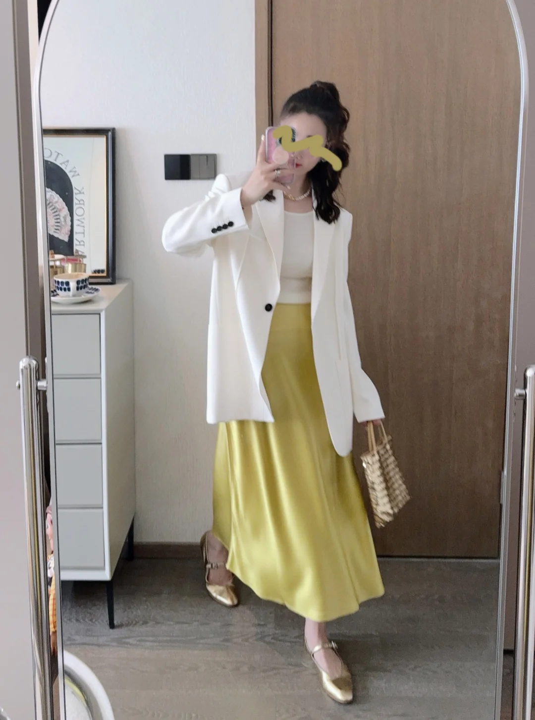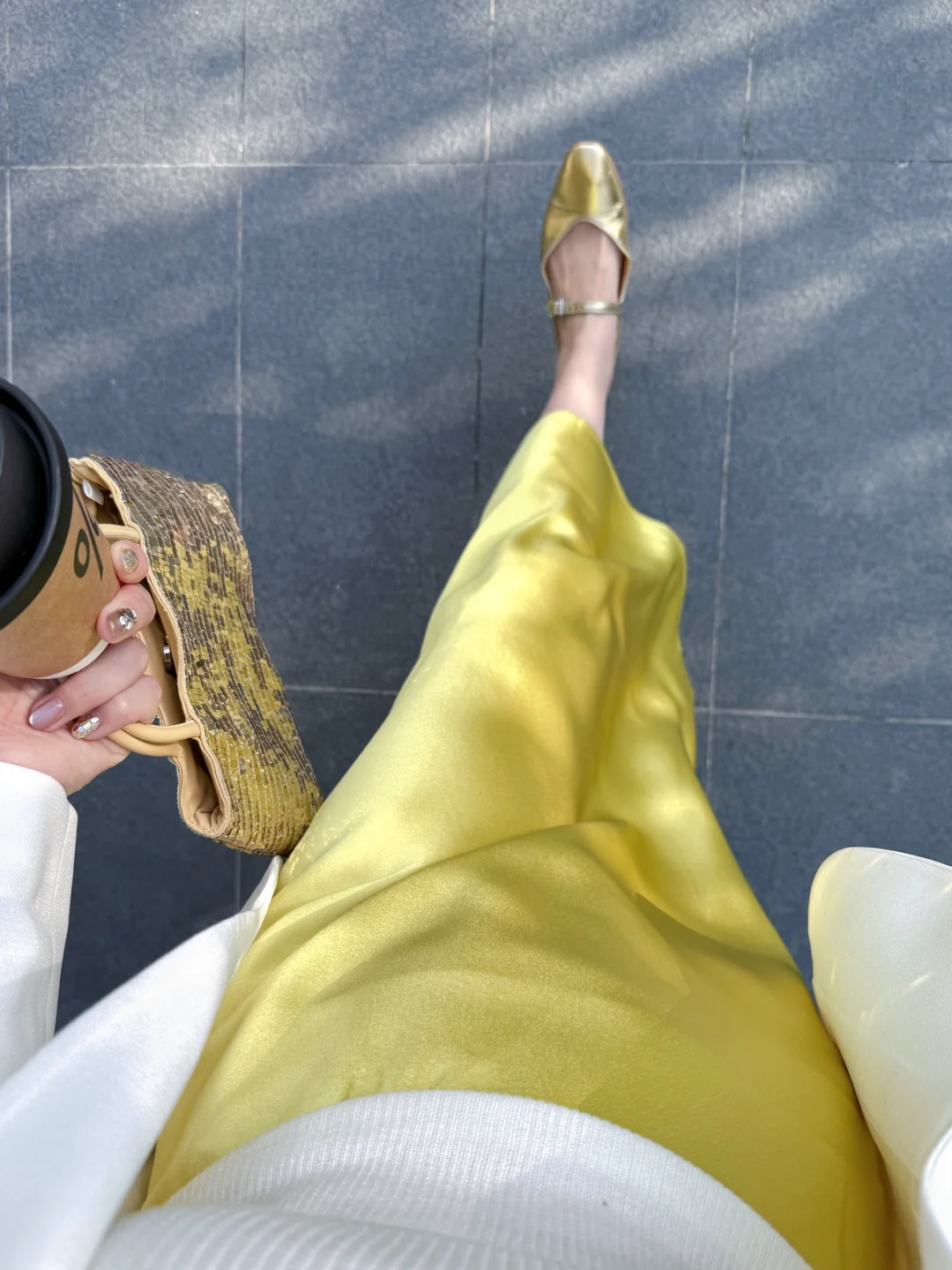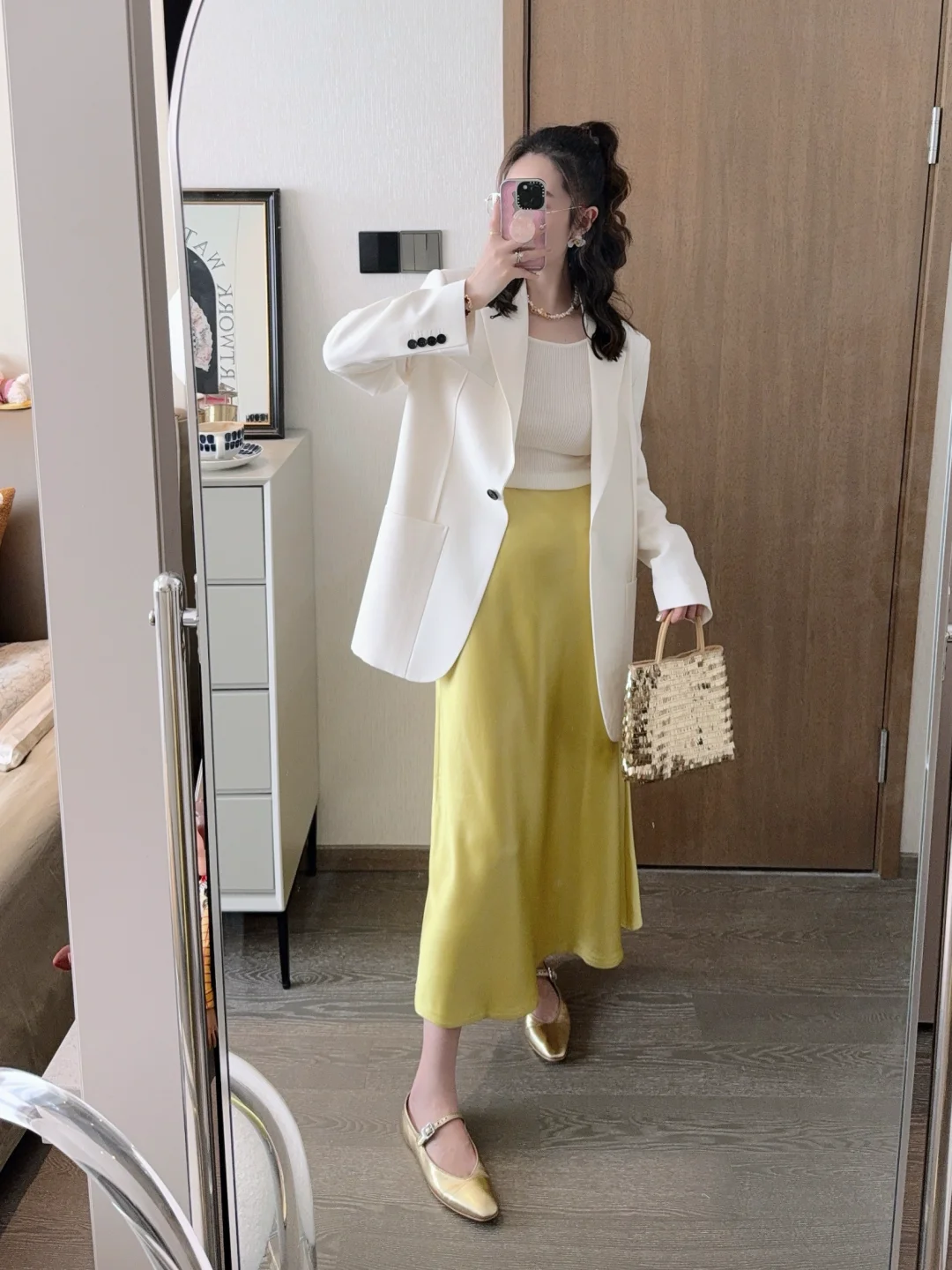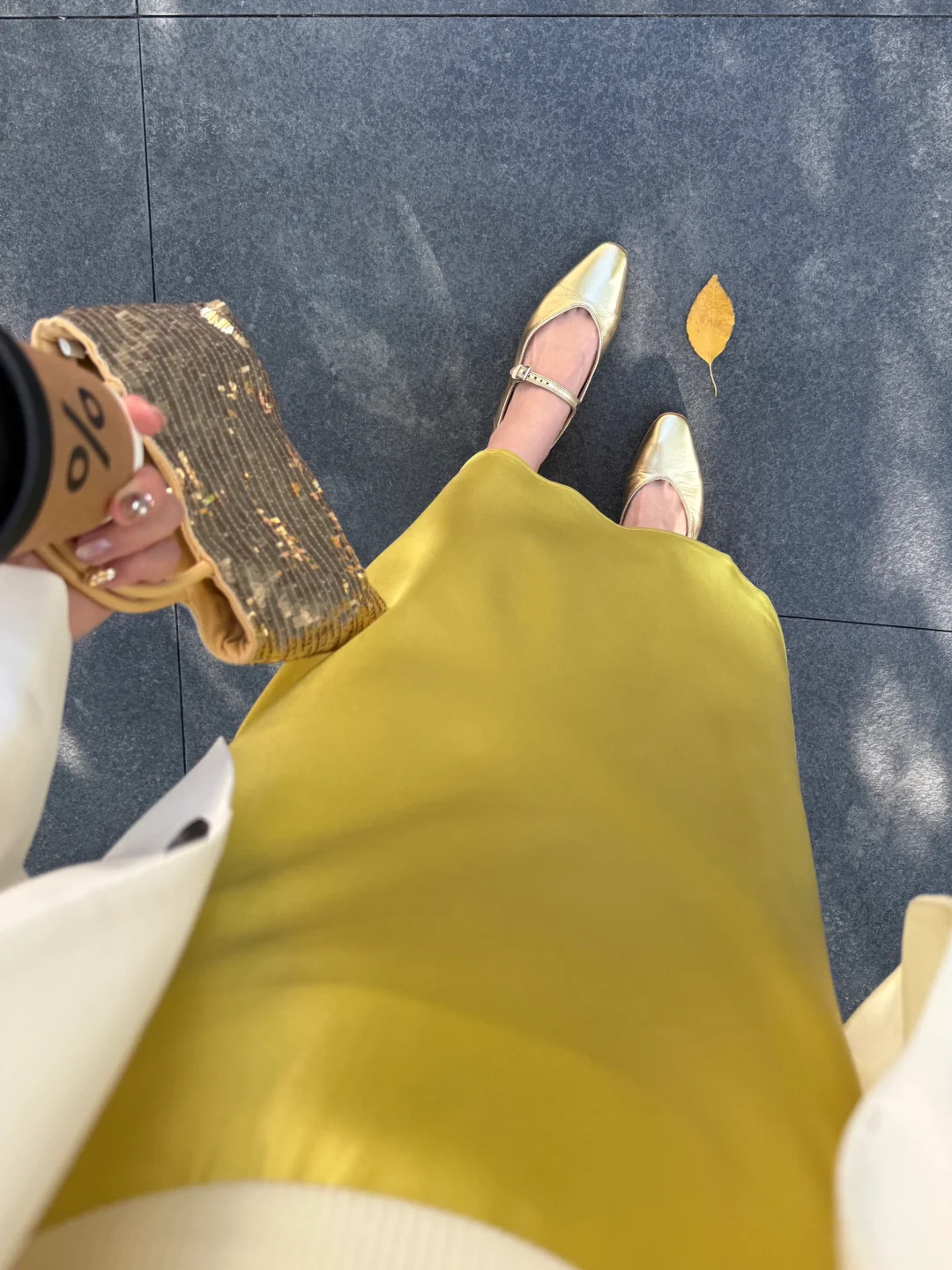 今年一直心心念念的亮金色半裙!贵气感就这么水灵灵的来了👀 最近南京又小小的降温了,薄西装穿起来~~喜欢穿小西装的舒适季节!