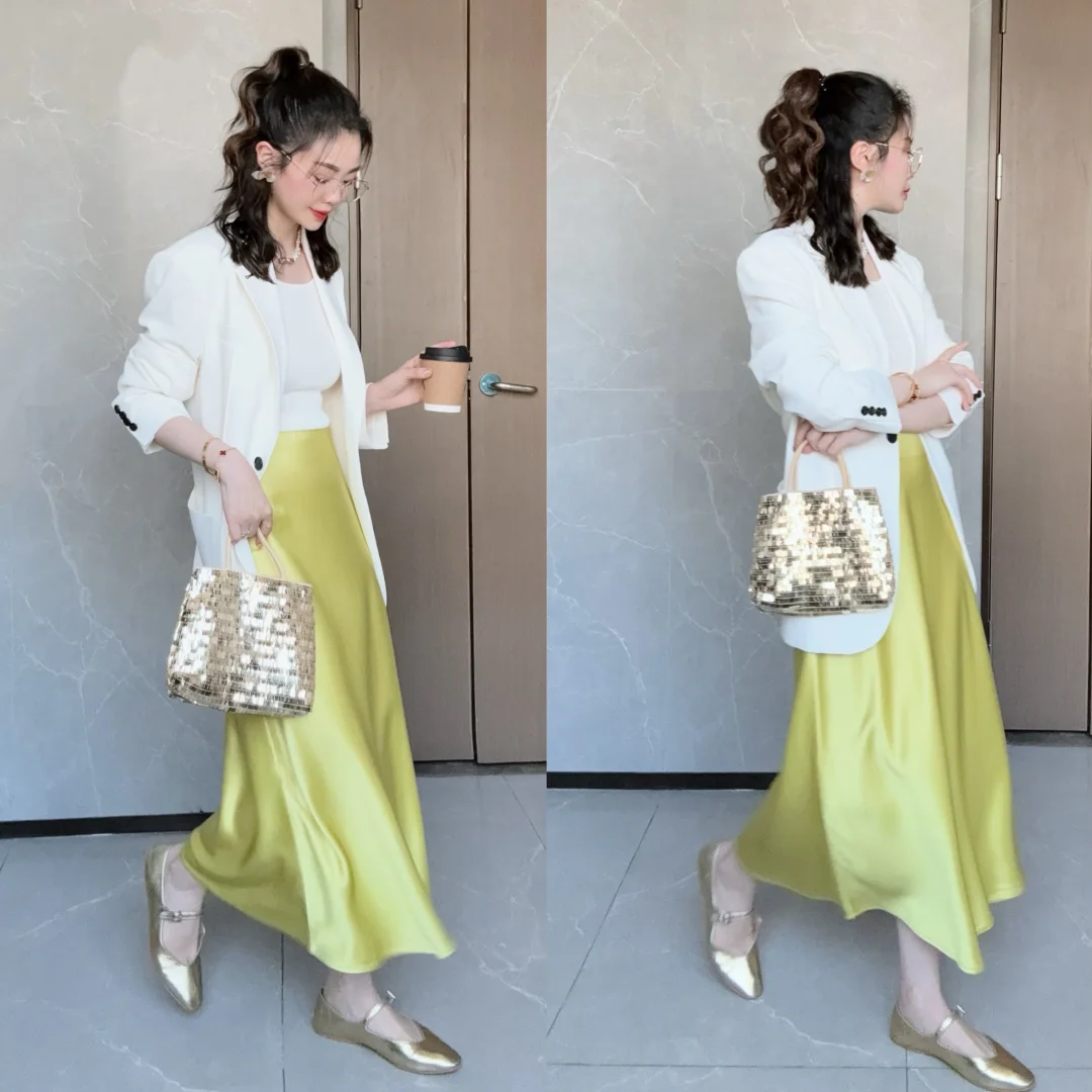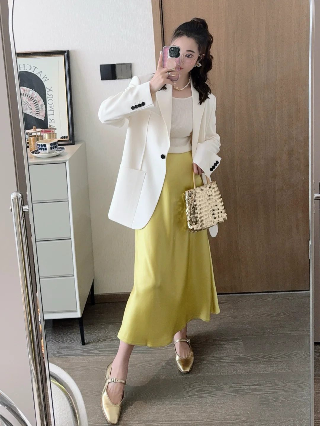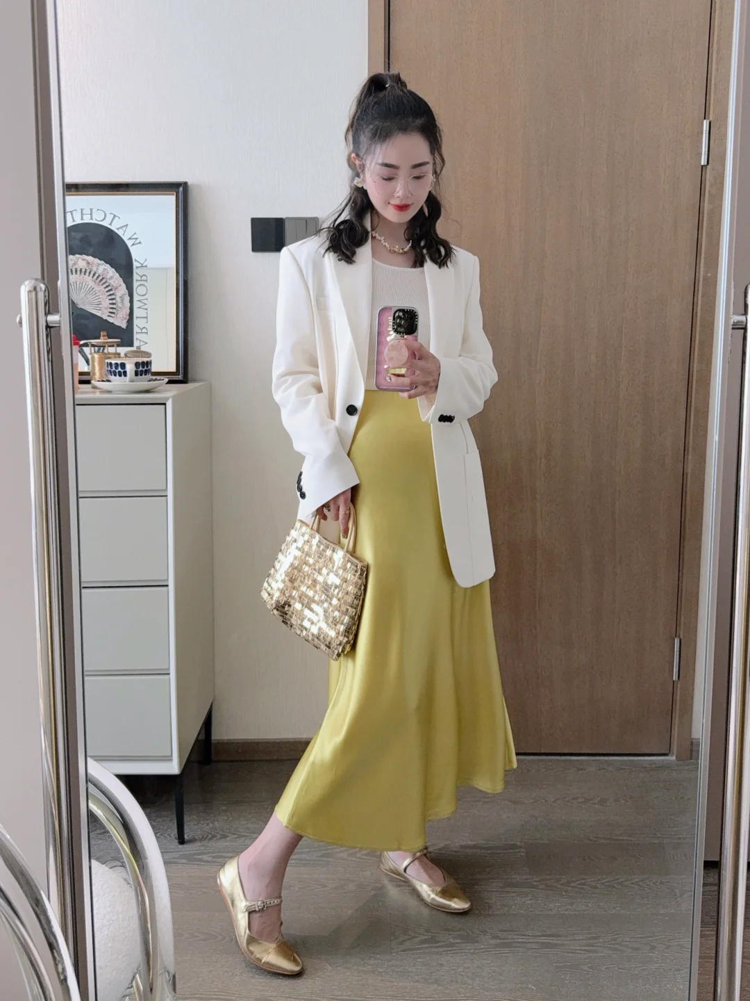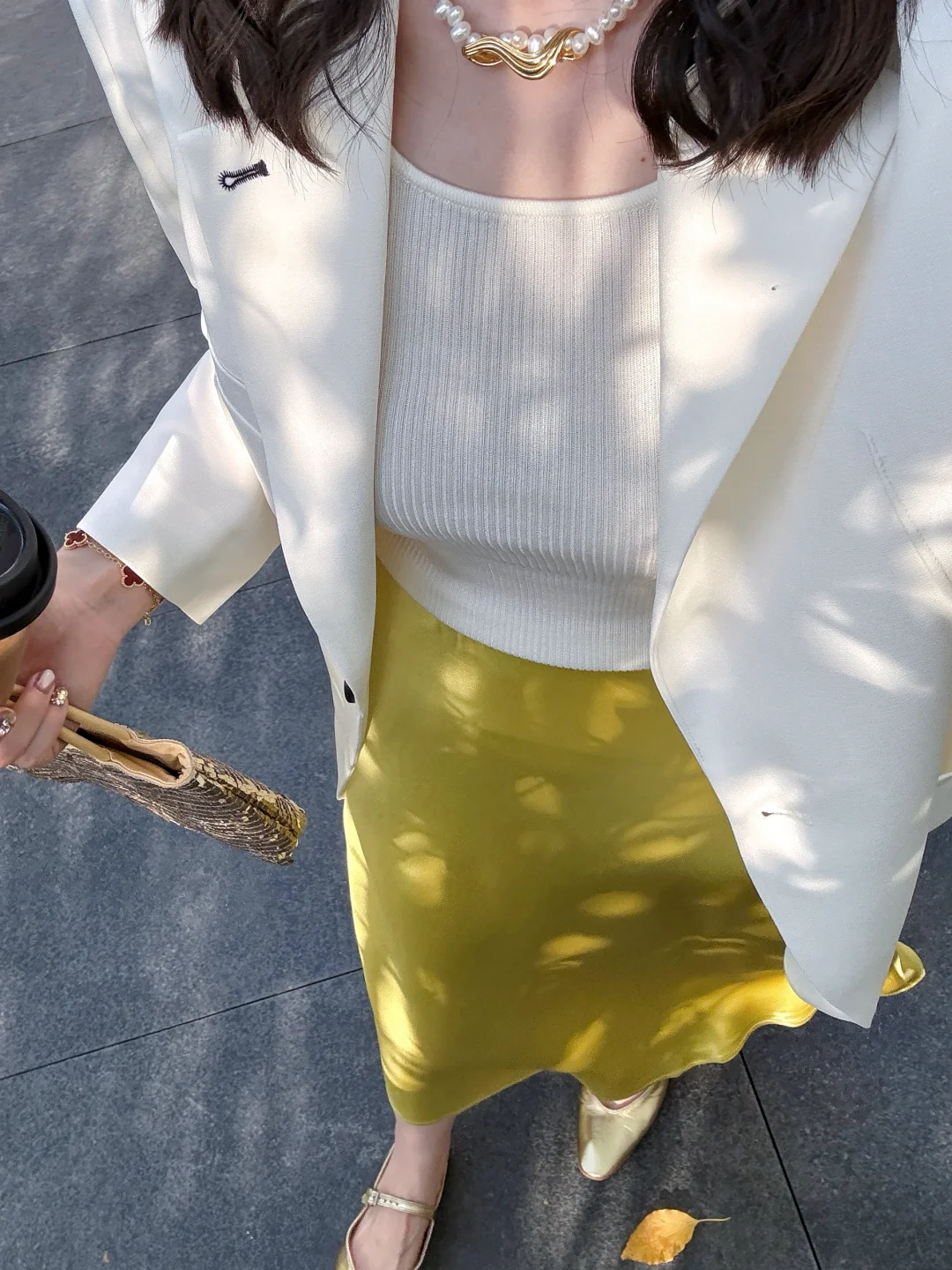今年一直心心念念的亮金色半裙!贵气感就这么水灵灵的来了👀 最近南京又小小的降温了,薄西装穿起来~~喜欢穿小西装的舒适季节!
