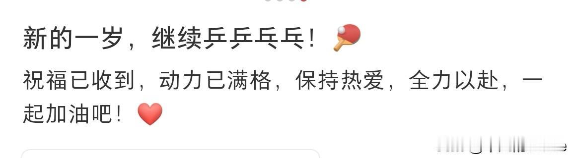 11月4日,孙颖莎发文说:“新的一岁,继续乒乒乓乓!祝福已收到,动力已满格,保持