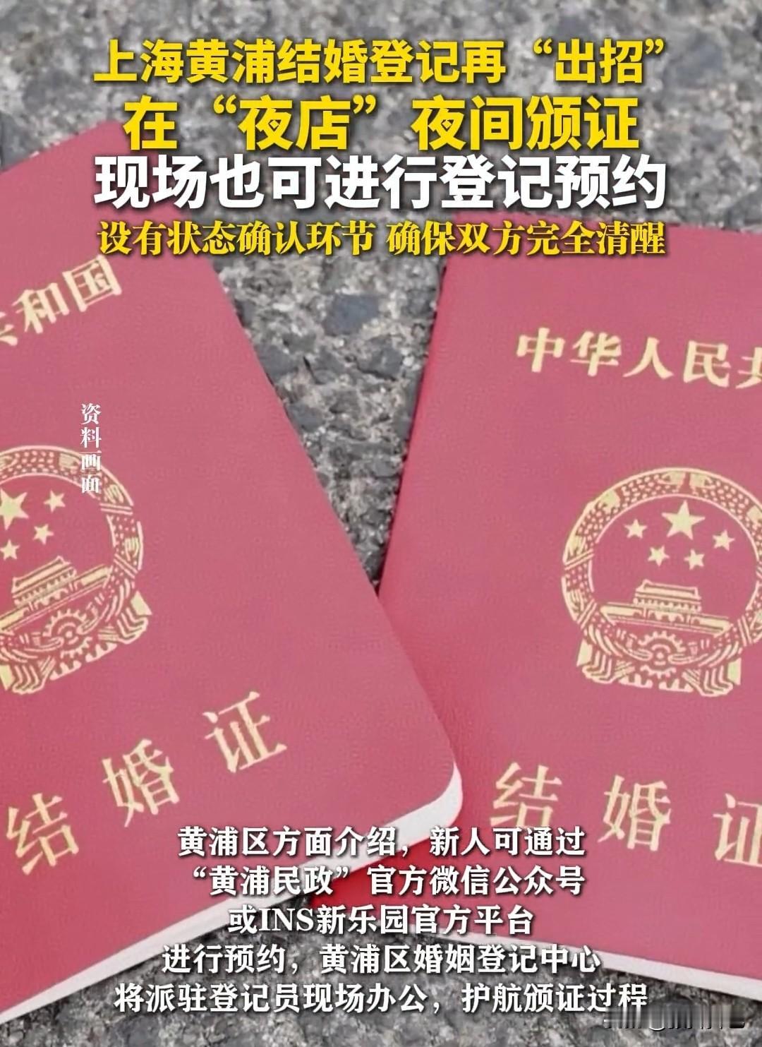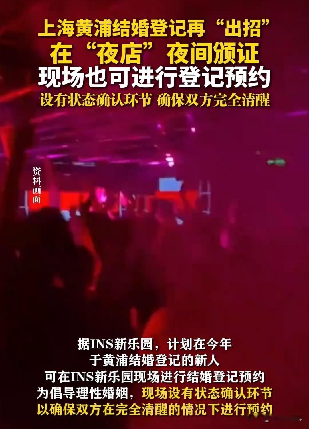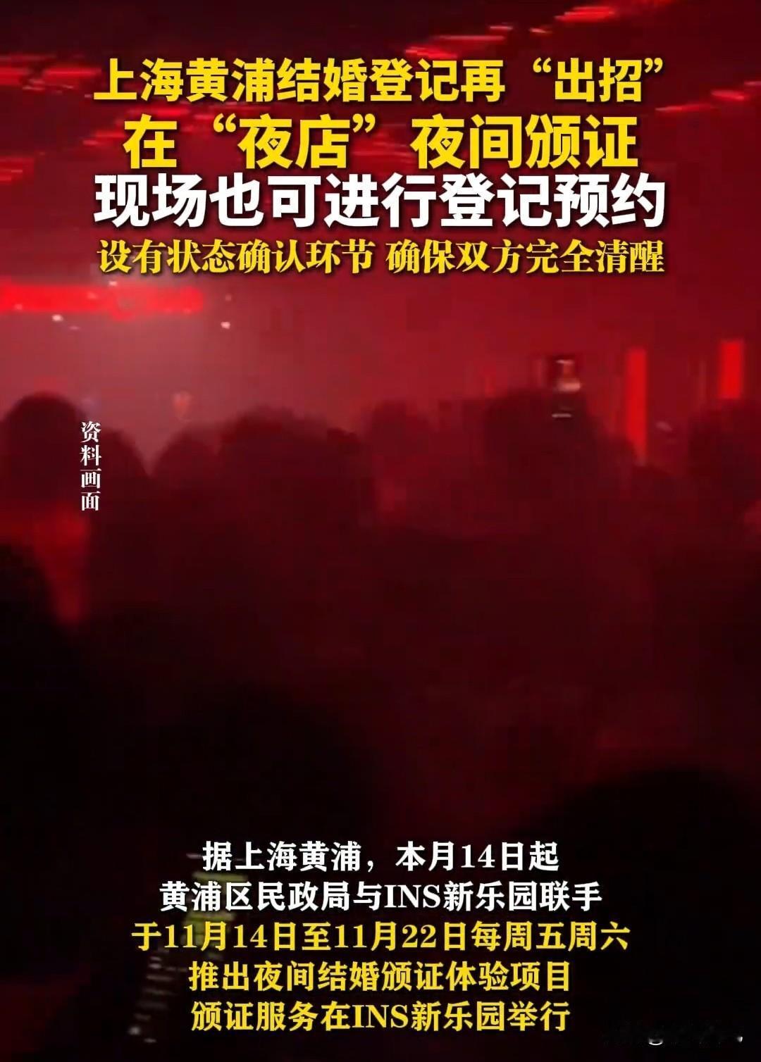 你心动了吗?上海出大招:在夜店设婚姻登记点,现场领证! 这国家为了大家结婚的事情,可算是操碎了心了,你看,上海黄埔区民政局与INS新乐园联手,定于11月14-22日期间,逢周五周六日,可以在INS新乐园,体验夜间领结婚证的新奇感受! 大家想想,以前结婚都是在民政局正儿八经地领结婚证,现在突然换到了一个集电竞、音乐、演艺和夜经济于一体的商业综合体里面,就问你潮不潮、奇不奇、兴奋不兴奋?这个地方去的大多是年轻人,太迎合年轻人的心理了吧? 据介绍,想结婚的新人,可以通过黄埔民政局官方微信公众号或INS新乐园官方平台进行预约,黄埔区婚姻登记中心会派工作人员入驻新乐园现场办公,护航整个颁证过程。 而INS新乐园方面则声明,会在现场设状态确认环节,确保结婚双方是在完全清醒状态下进行登记的,这个措施补上了安全漏洞,以免年轻人玩得太嗨一时冲动做出决定,然后后悔。 有网友笑称:第二天酒醒了,看着结婚证,发现没有对方的联系方式。更有网友绝绝子:离婚窗口可以设在喜马拉雅山上,要离婚?请登喜马拉雅! 不知道上海这个先锋,会不会拉动全国其他省市的效仿呢?大家拭目以待吧。