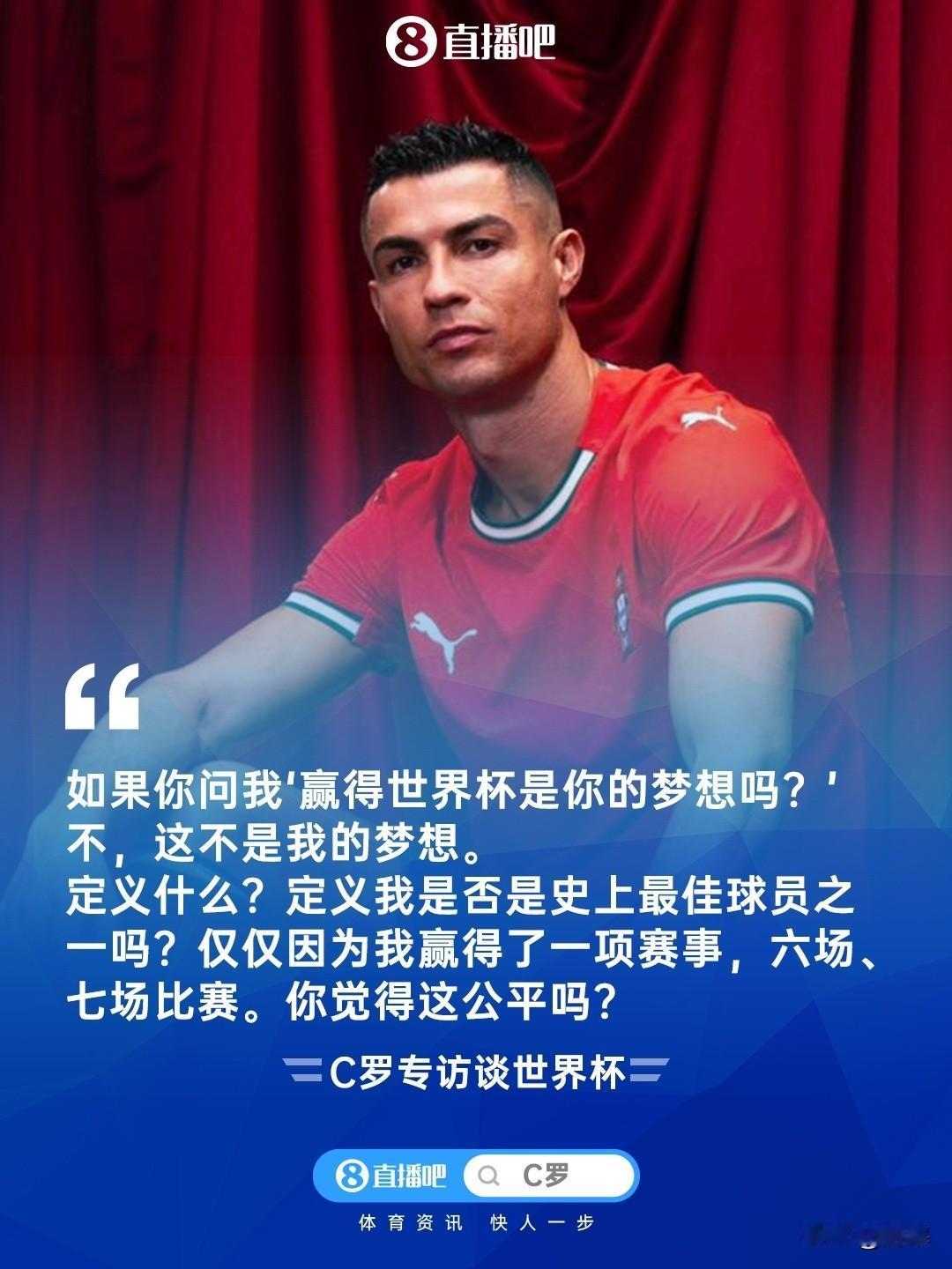 【炸裂!C罗放话:世界杯不是我的梦想!7场欧冠封神,谁定义历史最佳?】 “他们总拿世界杯说我不是GOAT,可那从来不是我的目标!”C罗的霸气回应,再次引爆足坛“历史最佳”之争!作为足坛巨星,C罗虽五征世界杯却无冠,常被拿来与梅西对比。但他却说:“我的战场在每一场,用表现征服世界。” 细数他的王座:欧冠之王——144球+5冠,单赛季17球神话;国家队历史射手王;五夺金球奖!尤其是欧冠赛场,他用7场惊天逆转定义“绝境之王”:对马竞、拜仁、尤文、皇马,次次力挽狂澜,将不可能变为永恒经典! 7场比赛,足以让一个球员被铭记,而C罗用的是整整20年的巅峰!他用进球、荣誉与意志,书写了独属于自己的传奇。 用世界杯一役定义伟大,是否公平?或许,真正的GOAT,是让无数人相信——只要不放弃,就能改写结局。C罗,本身就是答案!C罗