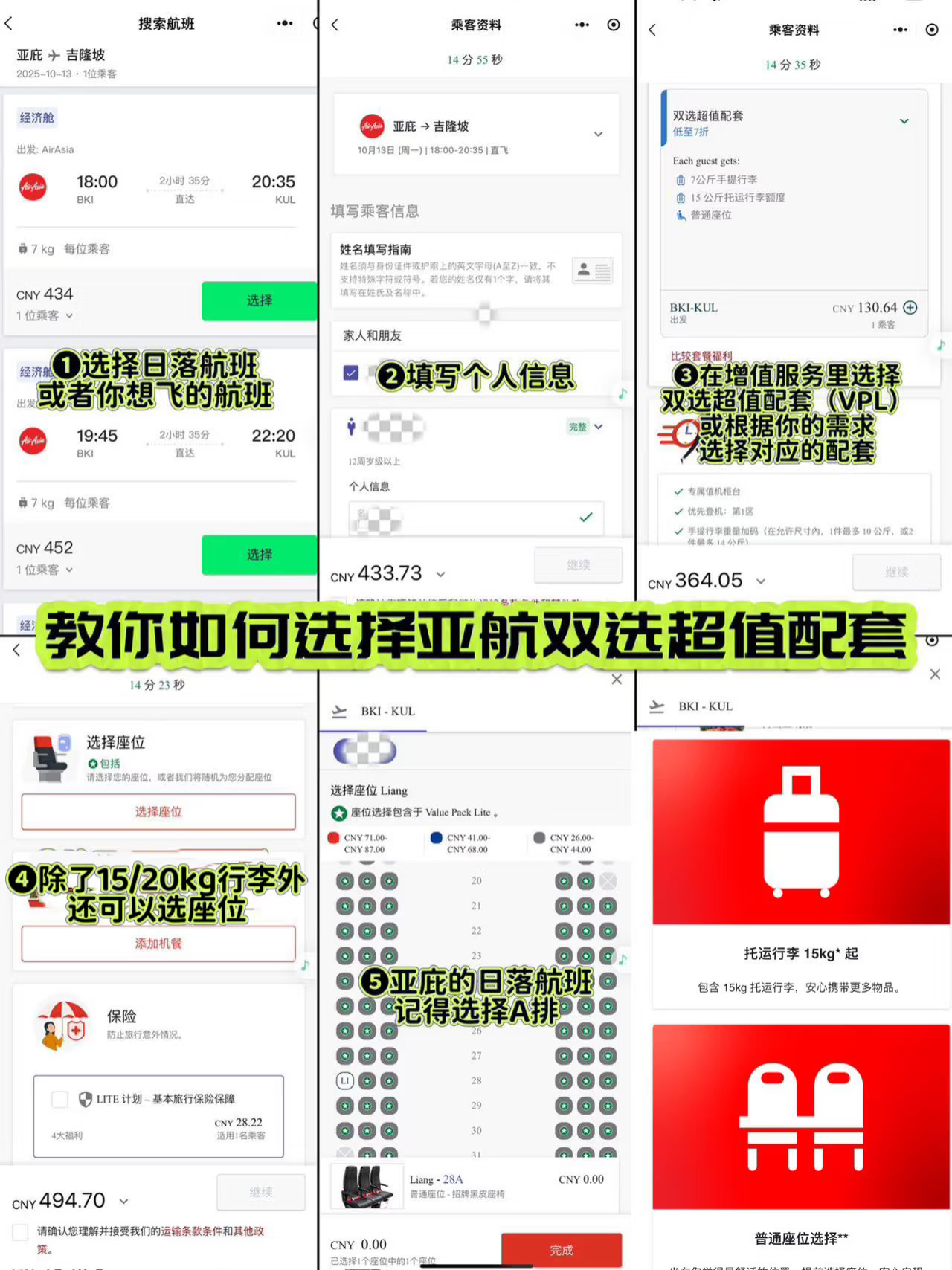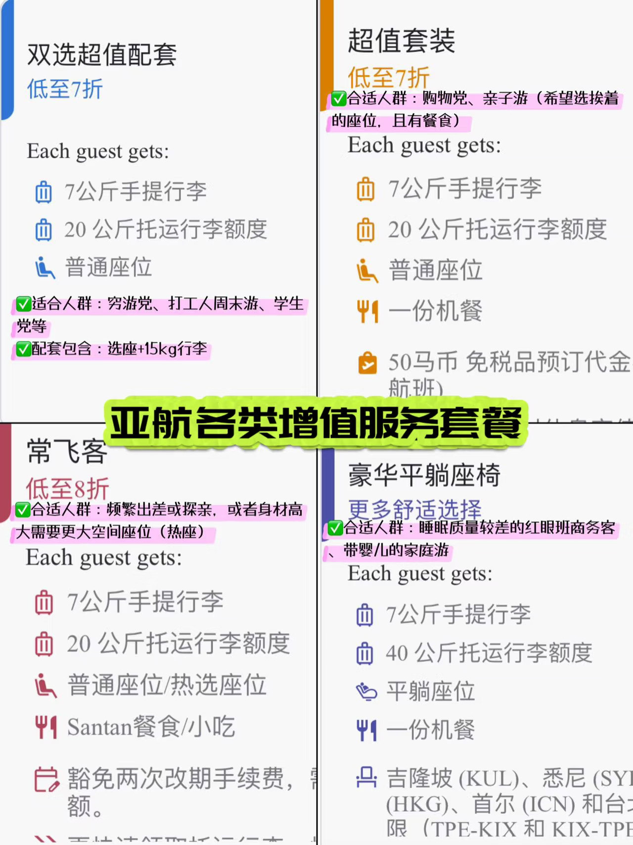 亚航机票只含7kg手提行李,选座要付费但 !千万别分开买服务!买套餐能省💰