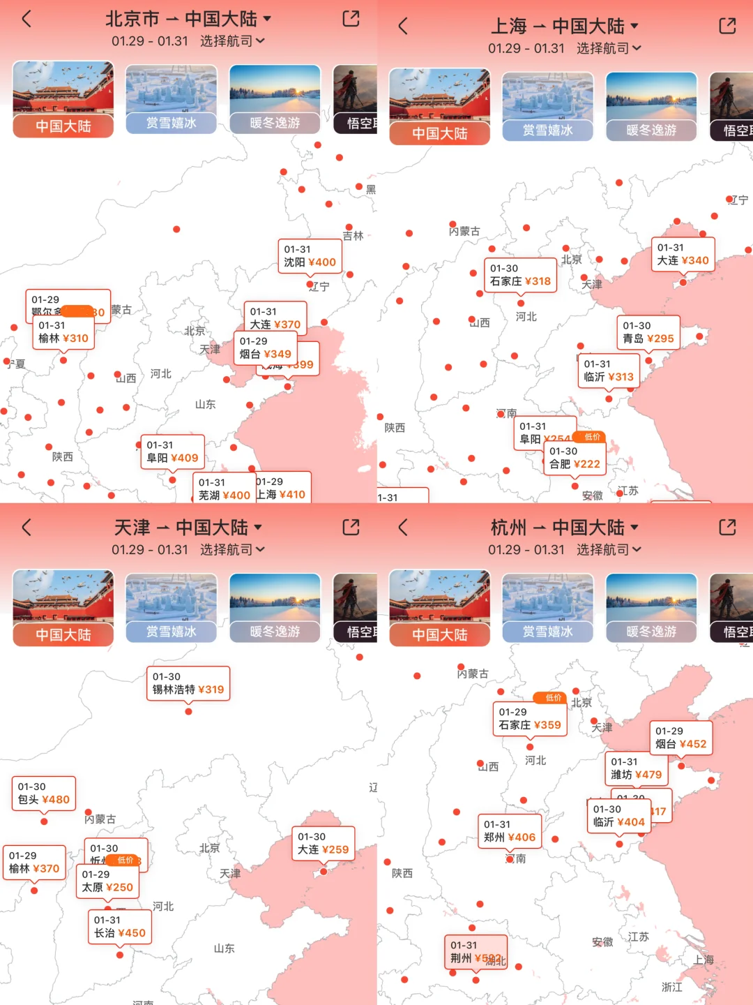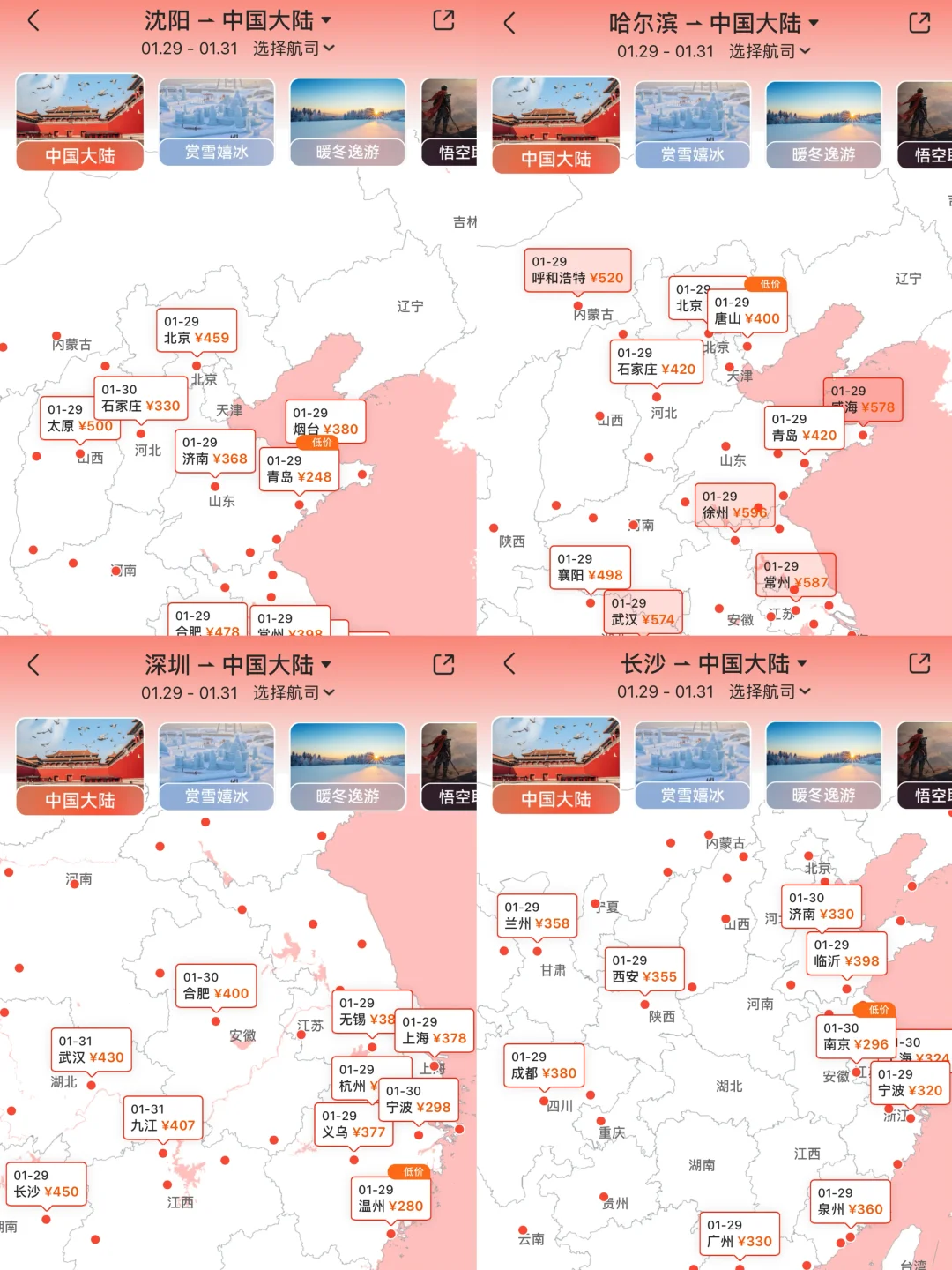 于是我打开航班管家App,点开“全国低价地图”看看哪里便宜去哪里~而且还可以在上面发现一些小众的旅游打卡地呢!还可以通过切换游玩主题,筛选出有意向的城市:比如选择赏雪嬉冰,就会显示东北相关的城市的低价机票!热门城市到冷门路线全覆盖,连内蒙古这样的偏远地区都有低价航线,全国飞哪都便宜!!