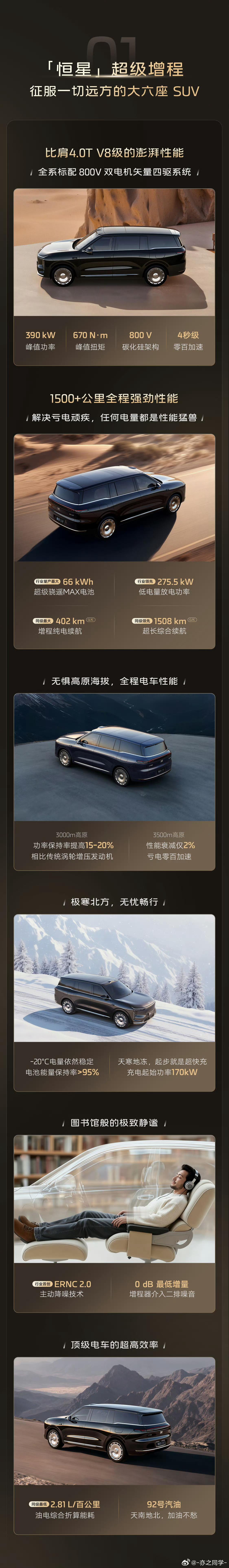 首推“恒星”超级增程系统,搭载1.5T增程器与前后双电机,综合功率达390kW,配合66kWh电池组,可实现402km的CLTC纯电续航与超过1500km的综合续航。