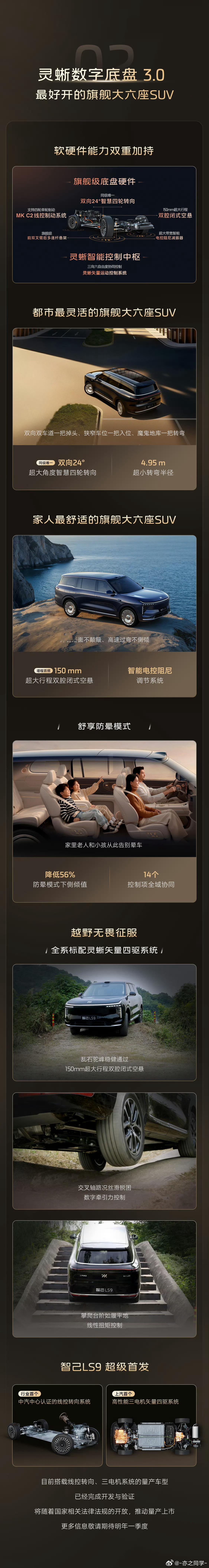另一大技术王牌是“灵蜥数字底盘3.0”,整合了双向24°后轮转向与150mm行程双腔空气悬架,让这台车长近5.3米的全尺寸SUV转弯半径仅4.95米,灵活性堪比小型车。