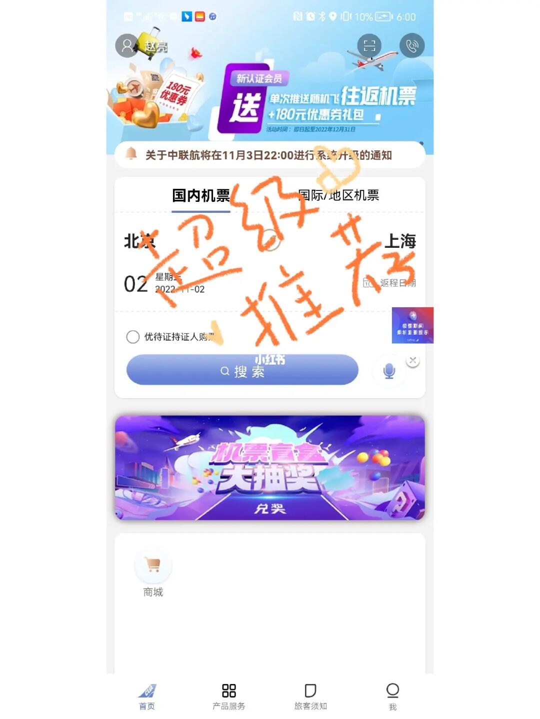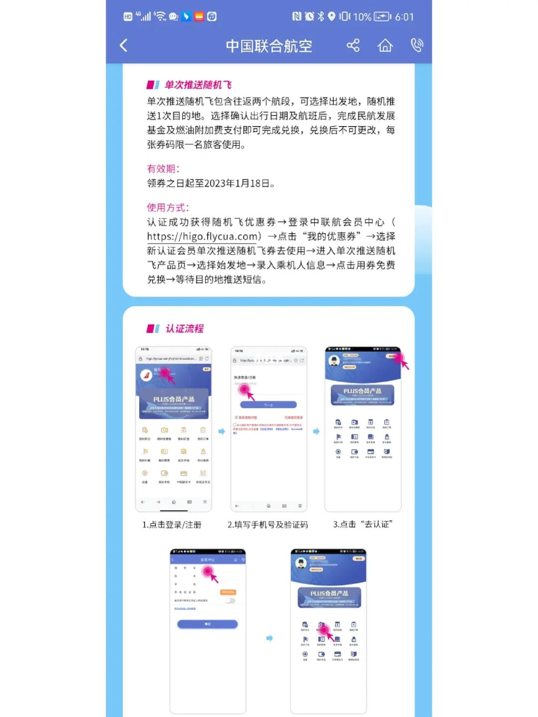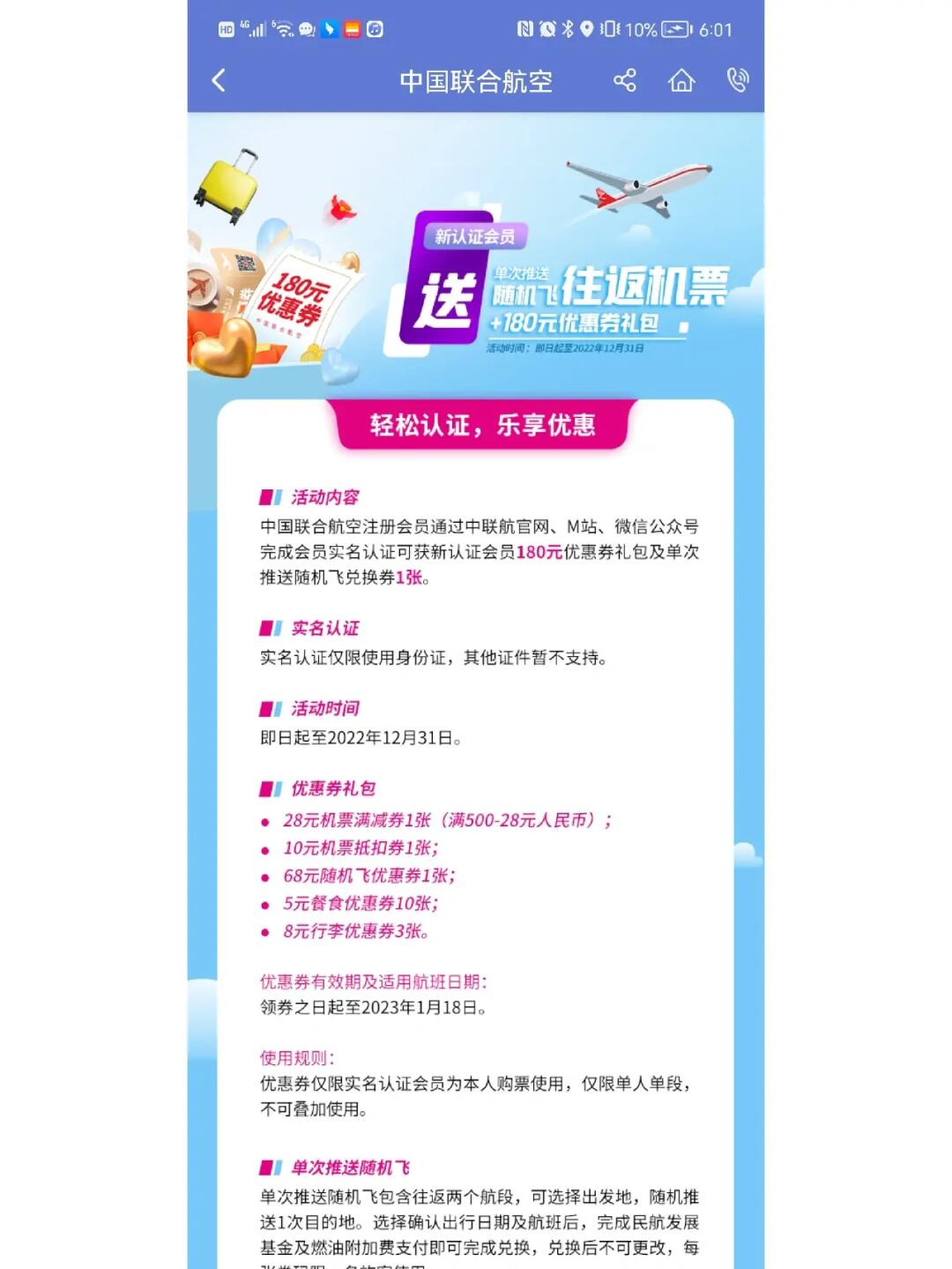 联航又搞事情了!又又又免费送货机票了! 前一阵推过大家免费送机票的活动 现在又来了! 只要在联航app首页点击新认证会员,即可获得一套往返的机票 Tips ❶一定看清楚换购机票的流程,活动规则写的很详细 ❷会收到一个500券那个是用来换机票的券 ❸貌似活动只针对未认证的用户,已认证的貌似不行 ❤️❤️可以关注我或私信我进联航结伴群聊❤️
