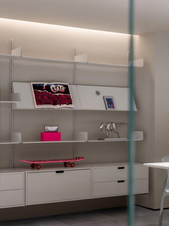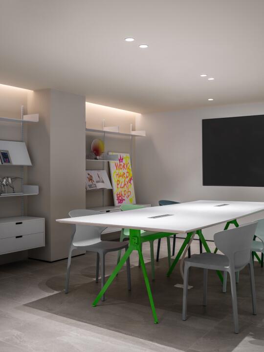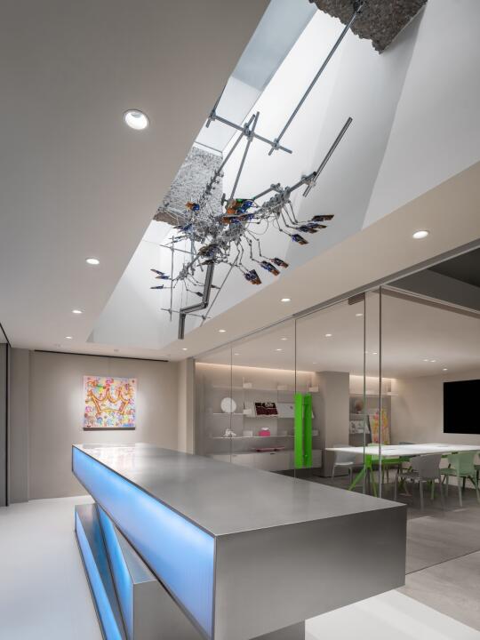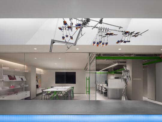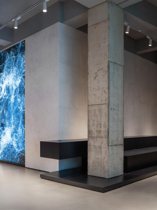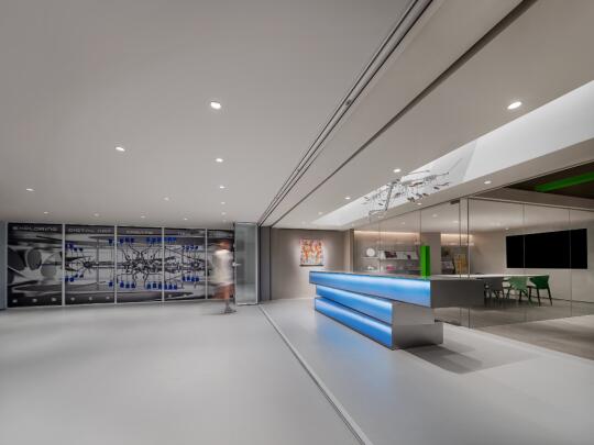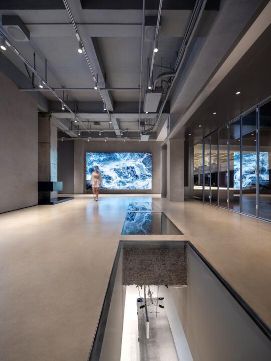 COOBBY+ 数字艺术共创空间及办公室中,MOC旨在以空间语言映射这一主题,将“破界”的概念转化空间和感官体验。场地分为上下两层,并不直接相连。位于公园下方的负一层规划为可对外的展厅和共创空间,负二层则是多媒体团队的日常办公室。