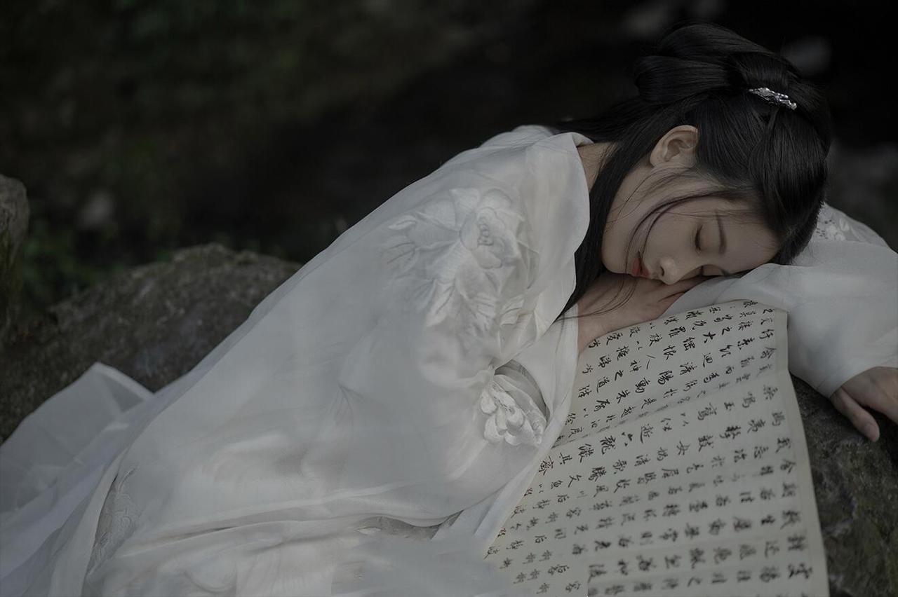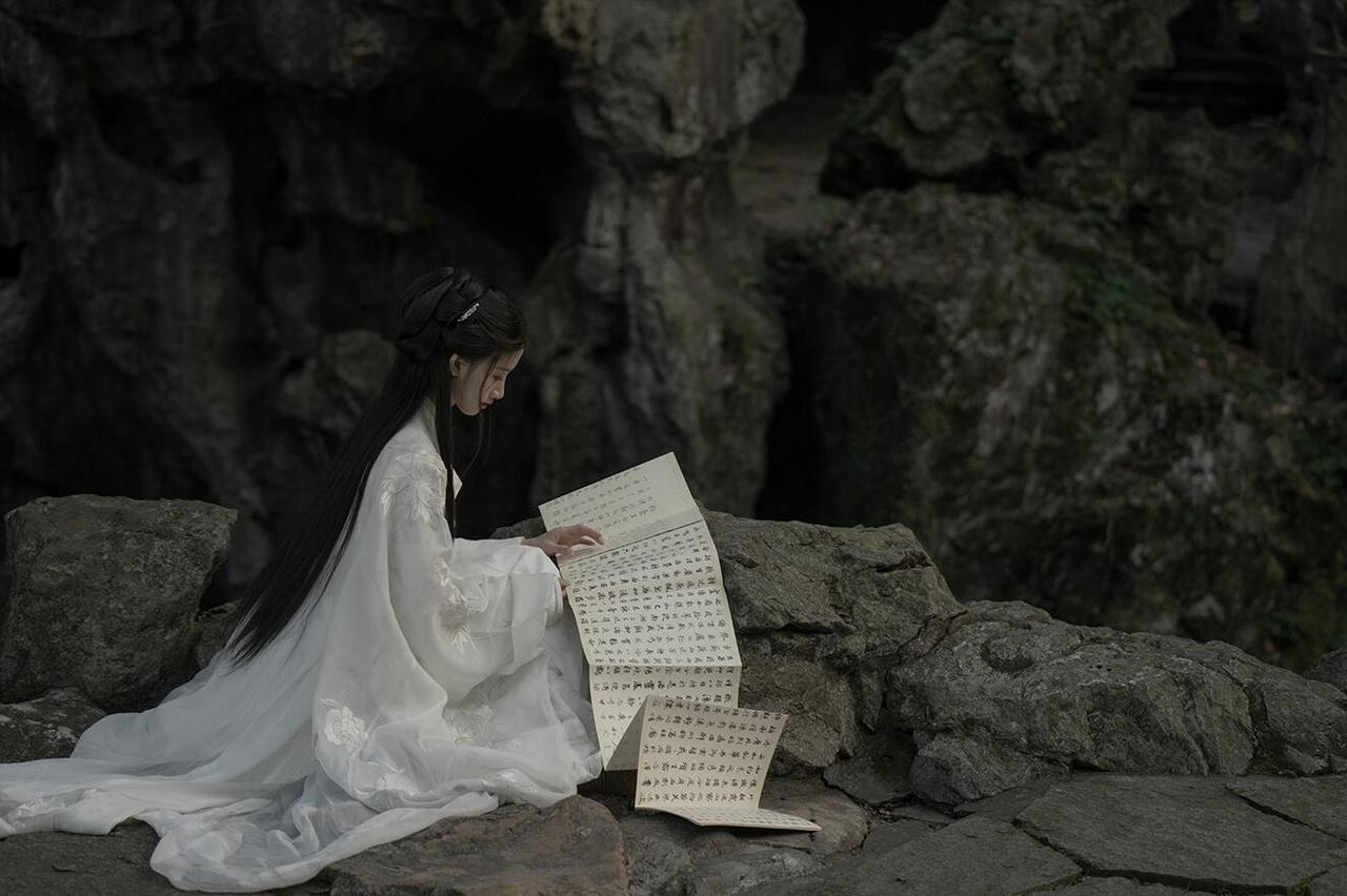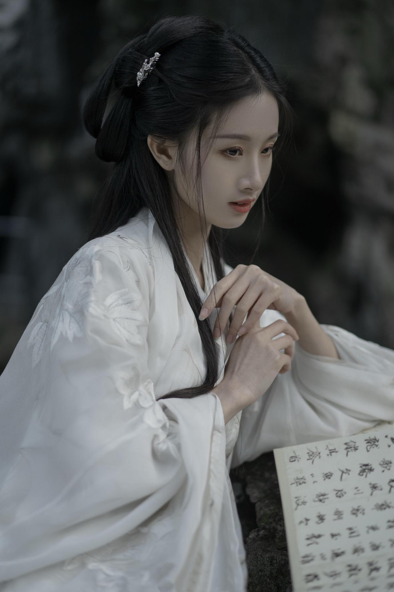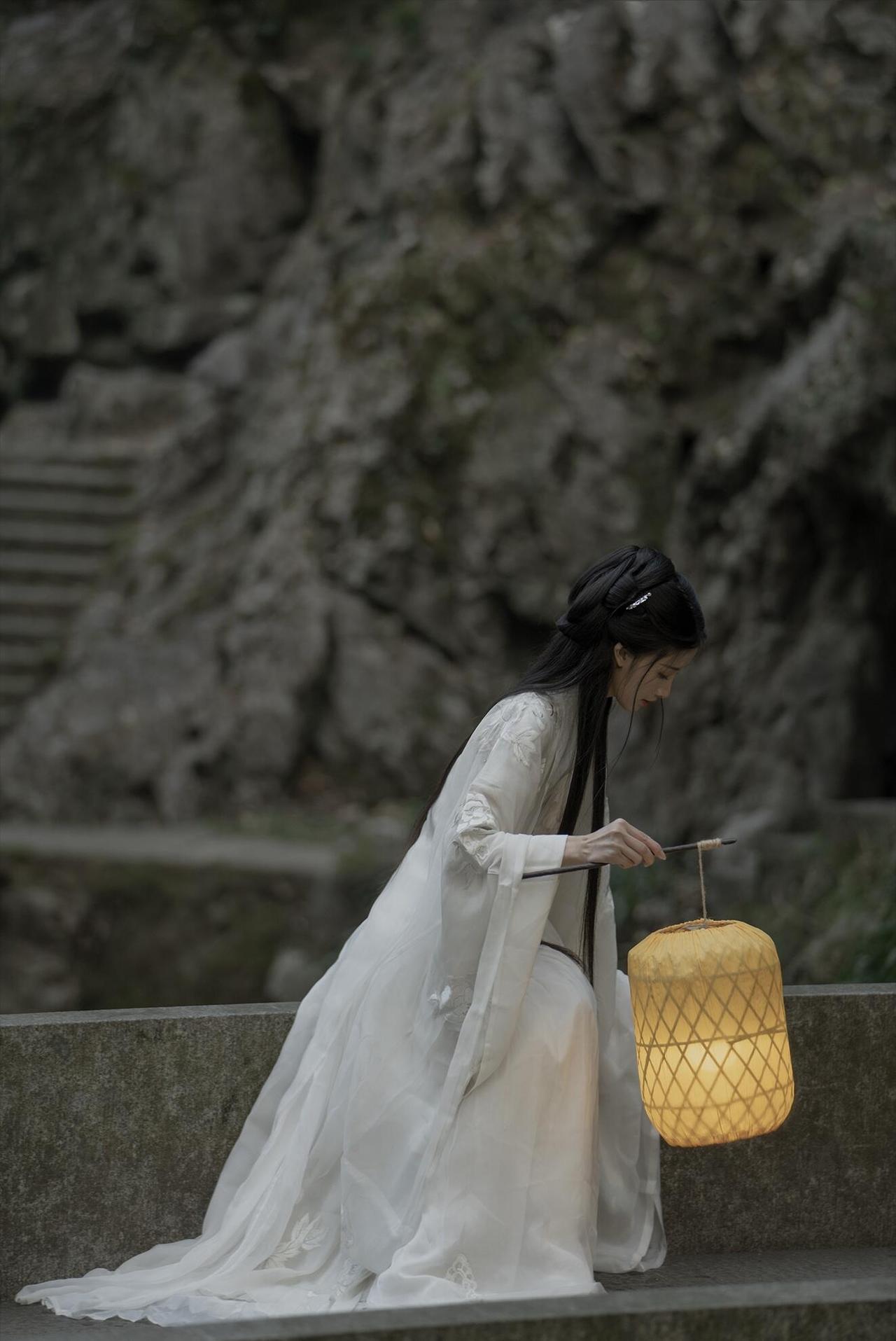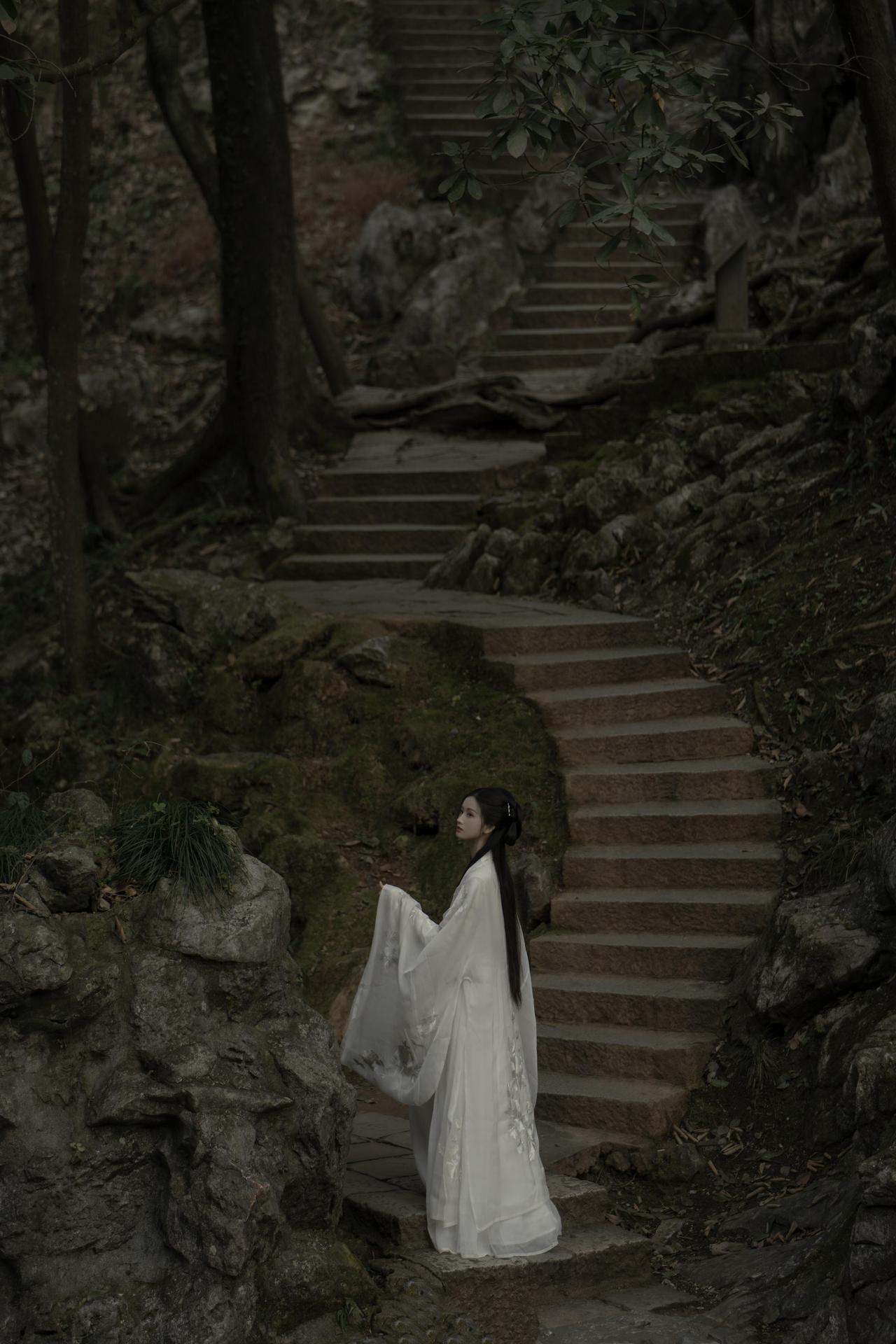 这组照片在场景和人物姿态的融合上做得很好,很有代入感。 场景选在山林石径,本身就很有古风里的“隐逸”氛围。石阶、怪石、树林,这些元素组合起来,就像是古代文人常游历的山水间。人物的姿态也很自然,趴在石上休息、坐在石上看书、提着灯笼走路,这些动作都很生活化,不是刻意摆拍,让人觉得她就是这片山林里的一部分,很有故事感。 比如走在石阶上的那张,她的步伐和灯笼的摆动,让整个画面有了动态的韵律,石阶的延伸感也引导着视线,仿佛她要走向山林更深处。这种场景和姿态的融合,把古风里那种悠然的意境表现得很到位。