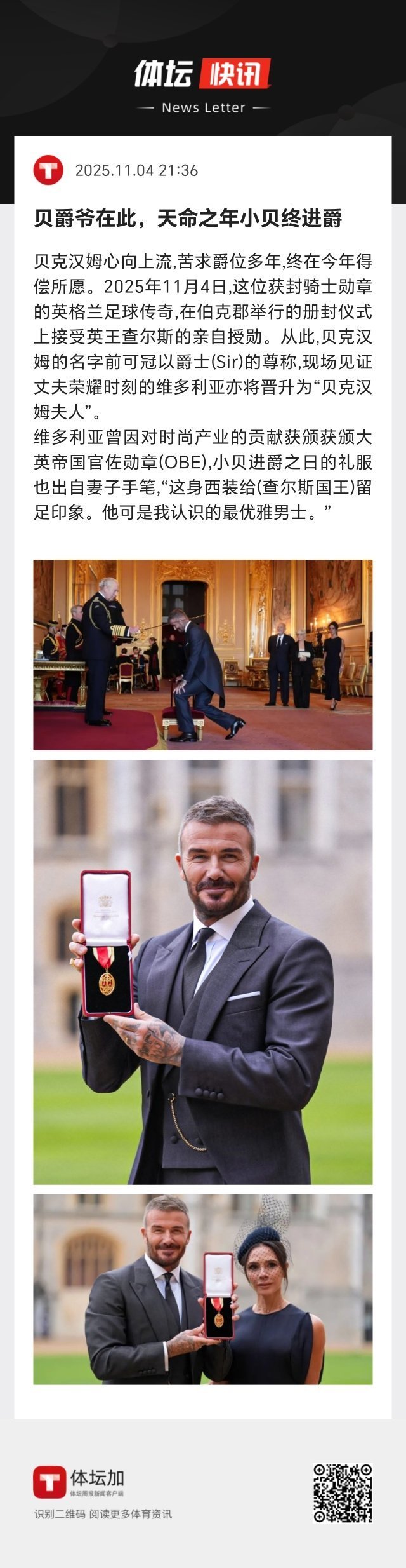 从此,贝克汉姆的名字前可冠以爵士(Sir)的尊称,现场见证丈夫荣耀时刻的维多利亚亦将晋升为“贝克汉姆夫人”。