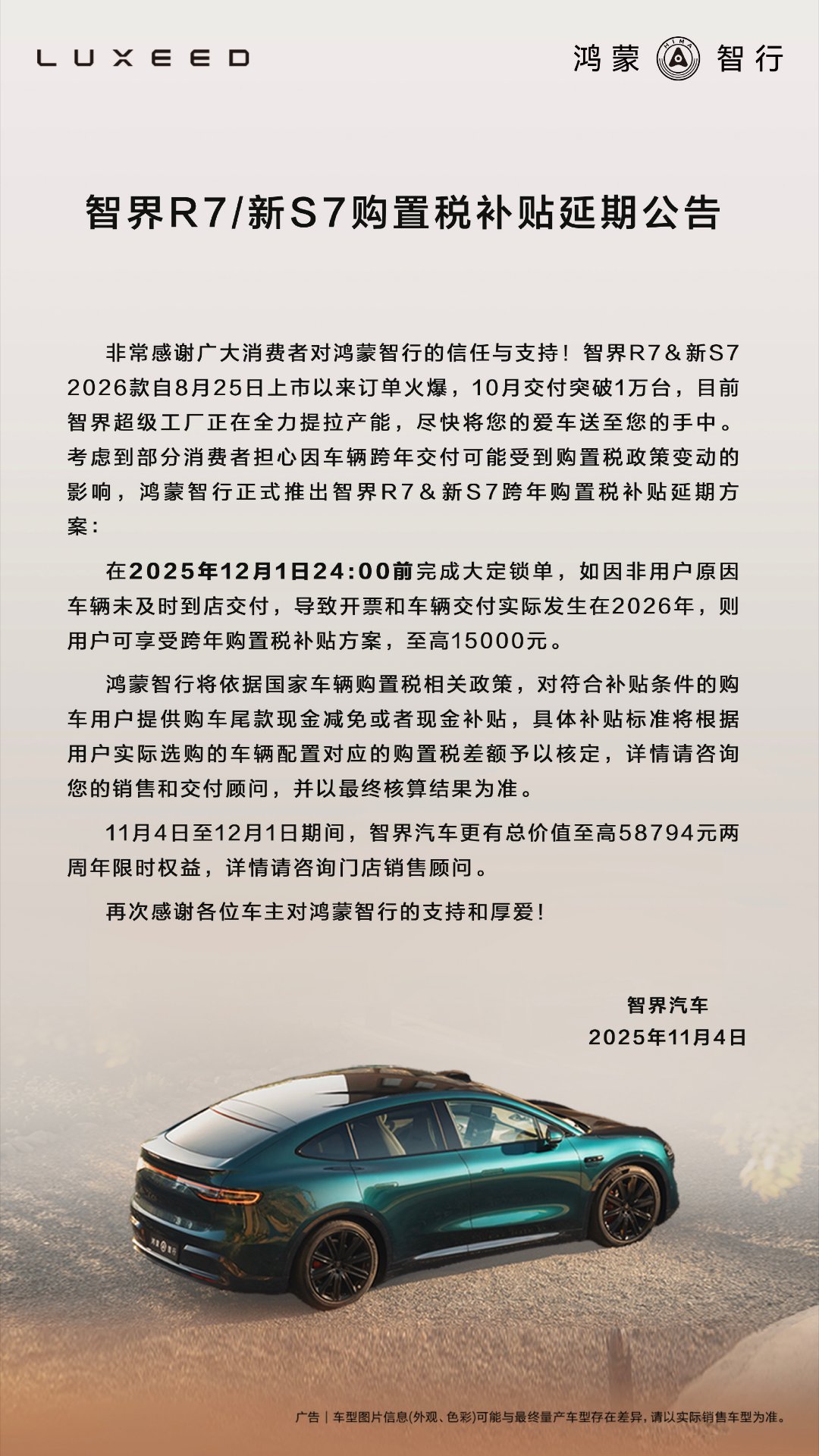 另外,鸿蒙智行智界汽车官方今日宣布,其跨年购置税兜底补贴延期。用户在 2025 年 12 月 1 日 24 点前(此前为 11 月 3 日 24 时之前)完成智界 R7、智界新 S7 大定锁单并确认交付方案,可享至高 15000 元跨年购置税补贴。
