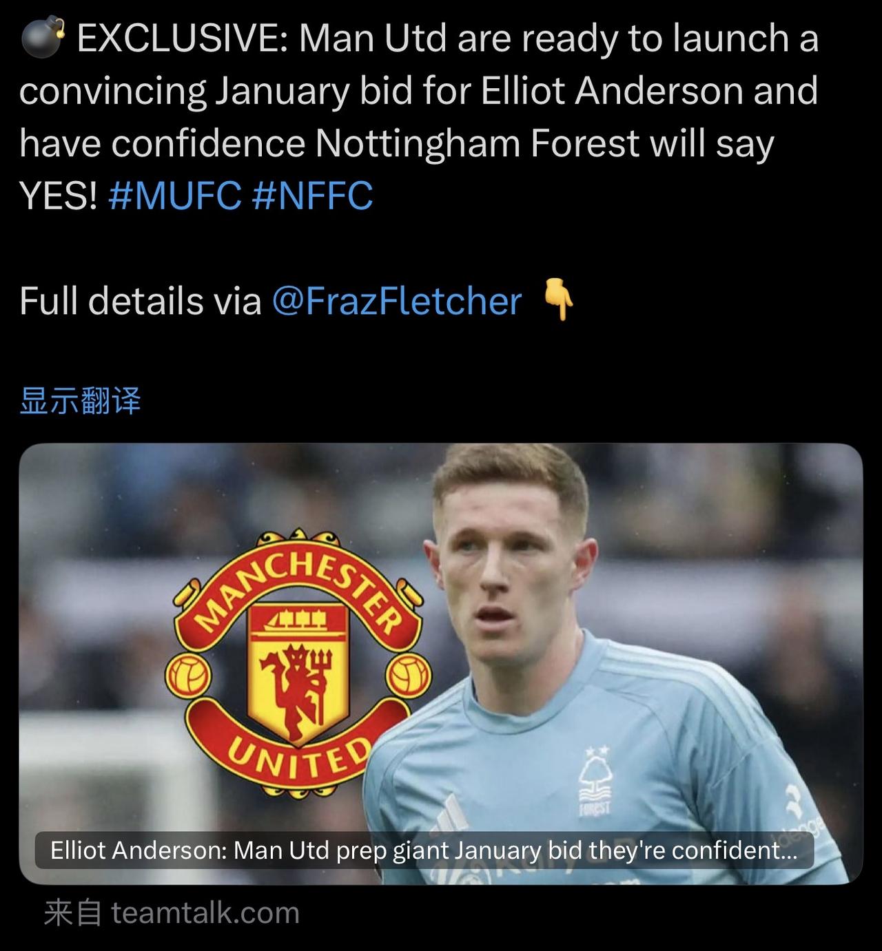 独家消息:曼联准备在1月份对埃利奥特·安德森发起一份有说服力的报价,并相信诺丁汉森林会同意! 🔴昨天刚刚说9000万英镑买巴莱巴,今天有报重金求购安德森,怎么?曼联冬窗能拿出2亿英镑?