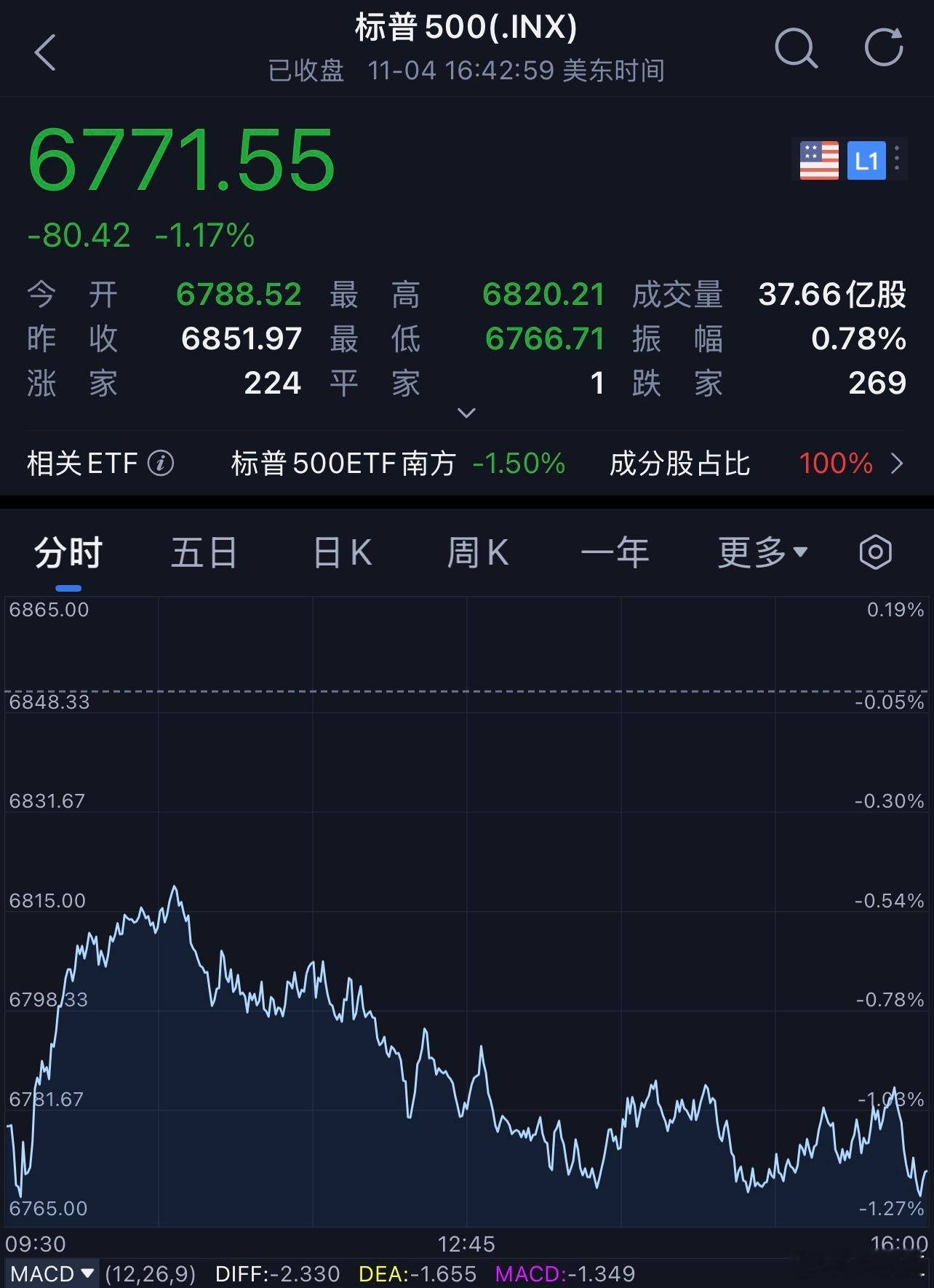 截至昨夜美股收盘,标准普尔500指数跌1.17%,报6771.55点;纳斯达克综合指数跌2.04%,报23348.64点;道琼斯工业平均指数跌0.53%,报47085.24点。
