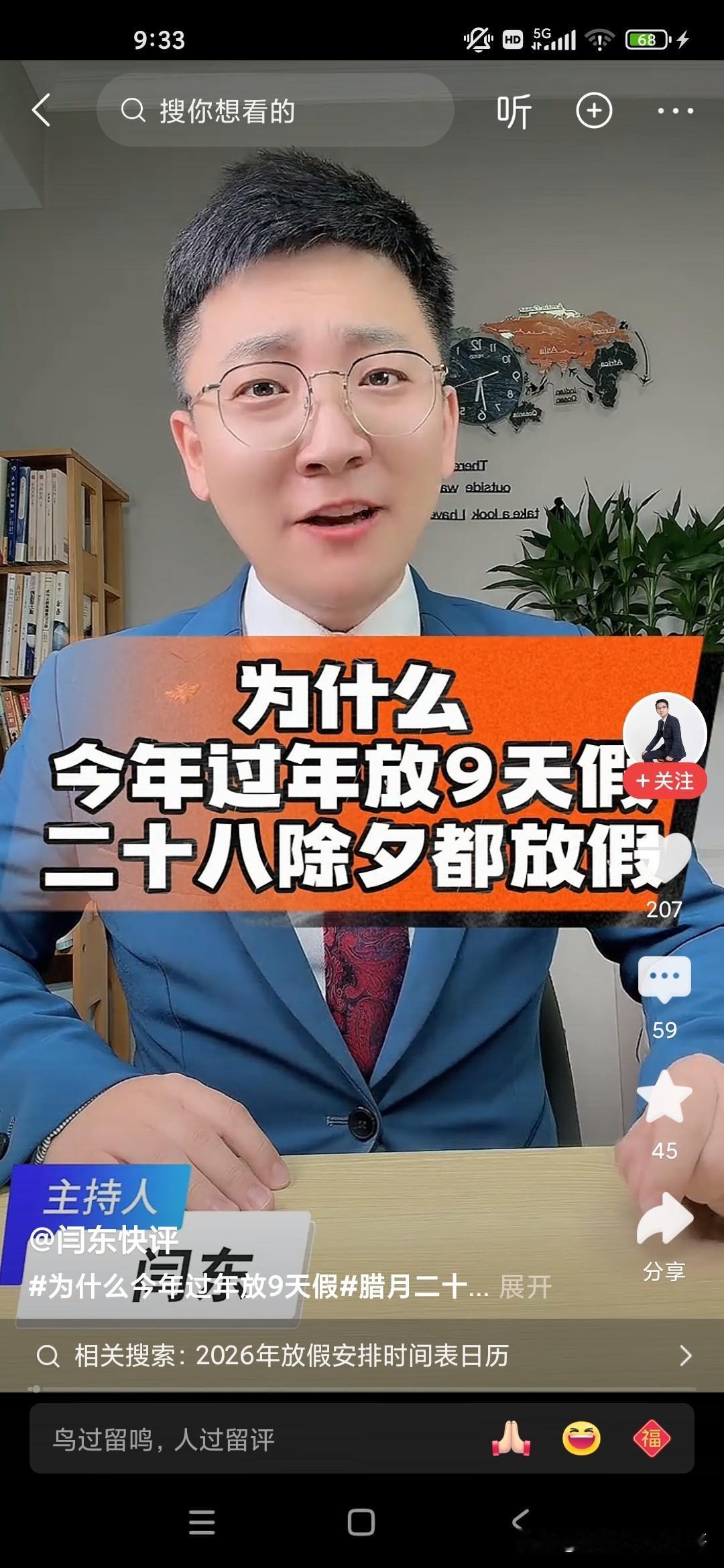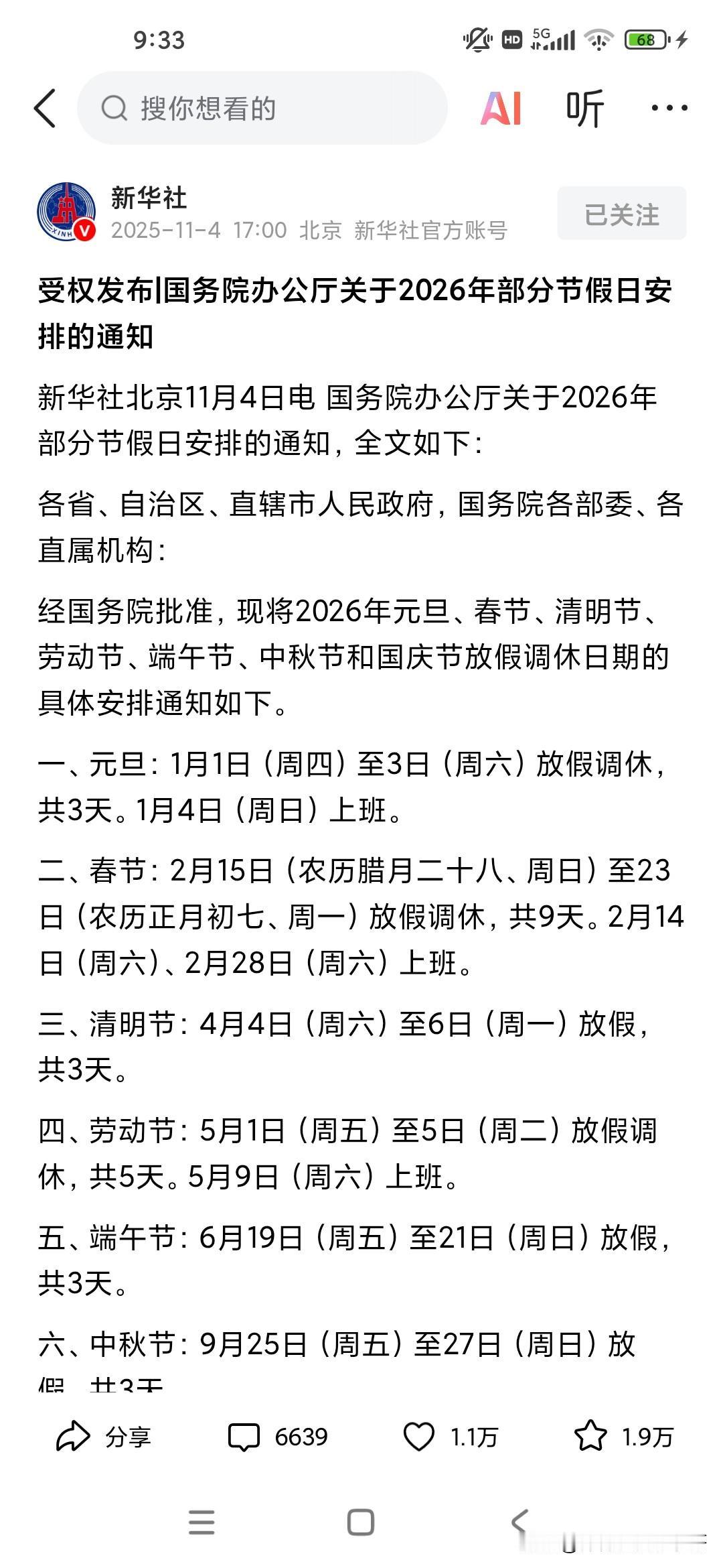往年春节都是放7天假,大家匆匆忙忙的,尤其是在珠三角和长三角打工的朋友,他们回家一趟可能就要花费一天,一来一回,两天都耽误了,在家也只能待个两三天,有的为了避开堵车返程高峰期,甚至还要提前上路,其实在家可能待的就一天,一天到两天,有的非常可怜,国家也充分考虑到群众情绪和诉求,于是又进行了调整,到2026年就是今年春节的时候,我们可以从腊月二十八一直放到正月的初七,总共是9天,我已经把9天放假的时间呢发布在我的下边照片里边,但是需要在2月14号和2月28号这两个周末都要各加班一天,也就算是调整一天,我觉得这个调整还是比较人性化的,最起码在春节的时候让大家多休息了两天,其他时间加班都无所谓,都可以接受,大家听到这个消息应该很开心吧,我之前都没有太留意国家要调整这个春节的消息,但现在听到春节可以在家休息9天,如果再加上我们老师作为假期,再加上三周其实已经蛮久的了!那应该感到很幸福,这个春节可以做更多的事情了,可以多陪陪爸妈了!
