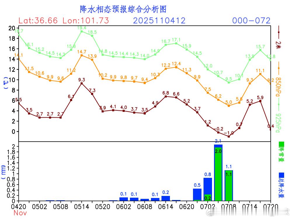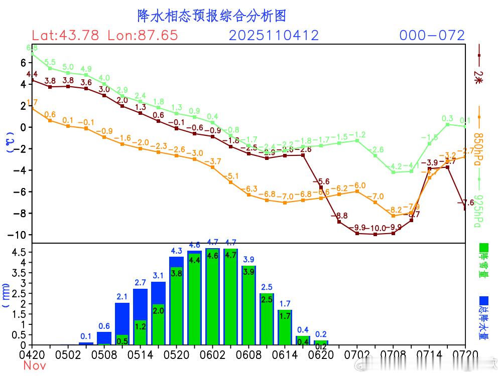 图7-9为乌鲁木齐、西宁、兰州的降水相态预报。乌鲁木齐今晨实测已经出现降雨,8时实测气温3.1℃,与数值预报的3.0℃基本吻合。今天白天,乌鲁木齐气温会一路下降,上午-中午会逐渐转雪,下午-晚上彻底转为纯雪,降雪量奔大暴雪强度。西宁在7日晨下雪悬念不大。兰州7日晨肯定有降水,处于雨雪临界,可以下雪但不保证有雪。
